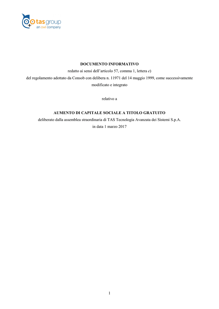 DOCUMENTO INFORMATIVO redatto ai sensi dell’articolo 57, comma 1, lettera e) del regolamento adottato da Consob con delibera n. 11971 del 14 maggio 1999, come successivamente modificato e integrato relativo a AUMENTO DI CAPITALE SOCIALE A TITOLO GRATUITO deliberato dalla assemblea straordinaria di TAS Tecnologia Avanzata dei Sistemi S.p.A. in data 1 marzo 2017 1 1. Premessa. Il presente documento informativo è redatto e pubblicato da TAS Tecnologia Avanzata dei Sistemi S.p.A. (“TAS” o la “Società”) ai sensi dell’articolo 57, comma 1, lett. e) del regolamento adottato da Consob con delibera n. 11971 del 14 maggio 1999, come successivamente modificato e integrato (“Regolamento Emittenti”), al fine di fornire agli azionisti e al mercato le informazioni relative all’aumento a titolo gratuito del capitale sociale da Euro 14.330.645,50 a Euro 24.330.645,50, e dunque per Euro 10.000.000,00, mediante imputazione a capitale sociale della riserva di patrimonio netto “conto futuro aumento di capitale gratuito” ed emissione di totali n. 41.768.449 nuove azioni, deliberato dalla assemblea straordinaria di TAS in data 1 marzo 2017 (l’“Aumento di Capitale Gratuito”). Il consiglio di amministrazione della Società riunitosi in data 26 gennaio 2017, su richiesta della controllante OWL S.p.A. (già TASNCH Holding S.p.A., “OWL”) aveva deliberato di sottoporre all’assemblea straordinaria degli azionisti la proposta di Aumento di Capitale Gratuito, con la conseguente proposta di modifica dell’articolo 6 dello statuto sociale nella parte in cui viene indicato l’ammontare complessivo del capitale sociale e delle azioni in circolazione. Il consiglio di amministrazione ha quindi approvato la relazione illustrativa all’assemblea straordinaria, redatta ai sensi dell’art. 125-ter del D.Lgs. 58/1998, come successivamente modificato e integrato (il “TUF”) e dell’articolo 72 del Regolamento Emittenti, la quale è stata pubblicata, nei termini e secondo le modalità stabilite dalla legge, in data 27 gennaio 2017 ed è disponibile sul sito della Società all’indirizzo www.tasgroup.it (Sezione Investors / Governance) (la “Relazione Illustrativa”). L’assemblea straordinaria degli azionisti di TAS, approvando la Relazione Illustrativa, ha deliberato quanto segue: 1. di aumentare il capitale sociale a titolo gratuito, ai sensi dell’art. 2442, cod. civ., per un importo di complessivi Euro 10.000.000 (dieci milioni) e, dunque, da Euro 14.330.645,50 a Euro 24.330.645,50, mediante emissione di n. 41.768.449 (quarantuno milioni settecento sessantotto quattrocento quarantanove) azioni ordinarie senza valore nominale aventi le medesime caratteristiche delle azioni ordinarie in circolazione, da attuarsi mediante imputazione a capitale sociale di un pari ammontare prelevato dalla “Riserva conto futuro aumento di capitale gratuito”, con assegnazione gratuita agli azionisti nel rapporto di n. 1 (una) azione ordinaria di nuova emissione in ragione di n. 1 (una) azione ordinaria posseduta; 2. di assegnare le azioni rivenienti dall’aumento di capitale nella prima data utile in base al calendario di Borsa Italiana S.p.A. del mese di marzo 2017, con godimento regolare pari a quello delle altre azioni ordinarie circolazione; 3. di modificare conseguentemente lo statuto sociale e in particolare di sostituire integralmente l’articolo 6 dello statuto sociale come segue: “Il capitale sociale è di Euro 24.330.645,50 (ventiquattro milioni trecento trentamila seicento quarantacinque virgola cinquanta), suddiviso in n. 2 83.536.898 (ottantatré milioni cinquecento trenta seimila ottocento novantotto) azioni ordinarie, senza valore nominale espresso.”; 4. di dare mandato al presidente del consiglio di amministrazione e all’amministratore delegato, in via disgiunta tra loro, con facoltà di nominare procuratori speciali, di effettuare tutti gli adempimenti necessari e connessi per l’esecuzione del sopra deliberato aumento di capitale gratuito, e quindi provvedere all’assegnazione gratuita delle azioni in ottemperanza alle applicabili disposizioni di legge e regolamentari, nonché per l’espletamento dei conseguenti adempimenti legislativi e regolamentari, ivi inclusi i poteri: (a) per apportare le necessarie modifiche allo statuto sociale indicate al precedente punto 3 della presente deliberazione; (b) per svolgere presso il registro delle imprese tutte le pratiche conseguenti alle deliberazioni come sopra assunte e per apportare alle deliberazioni stesse quelle varianti, aggiunte e soppressioni (che non modifichino sostanzialmente il contenuto della delibera) che venissero eventualmente richieste in sede di iscrizione nel Registro delle imprese e (c) per svolgere ogni attività necessaria e/o opportuna per l’attuazione delle presenti deliberazioni; 5. di autorizzare il presidente del consiglio di amministrazione e l’amministratore delegato, in via disgiunta tra loro, con facoltà di nominare procuratori speciali, a depositare presso il Registro delle imprese il testo di statuto sociale aggiornato con quanto sopra”. In data 1 marzo 2017, si è conseguentemente proceduto al deposito della deliberazione assembleare presso il Registro delle Imprese di Roma, ai fini dell’iscrizione di cui all’art. 2436 del codice civile. 2. Motivi dell’Aumento di Capitale Gratuito. Come già reso noto al mercato, da ultimo in data 18 gennaio 2017, OWL, società controllante TAS, lo scorso 17 maggio 2016 ha sottoscritto con le banche creditrici di TAS un accordo in esecuzione dell’operazione di ristrutturazione dell’indebitamento, rafforzamento patrimoniale e cambio di controllo di TAS che ha avuto poi esecuzione lo scorso 4 agosto 2016 (l’“Accordo Investitori-Banche”). L’Accordo Investitori-Banche prevedeva, tra l’altro, l’impegno da parte di Alex S.r.l. – oggi controllante OWL – a effettuare in favore di OWL un versamento in conto capitale dell’importo di Eu