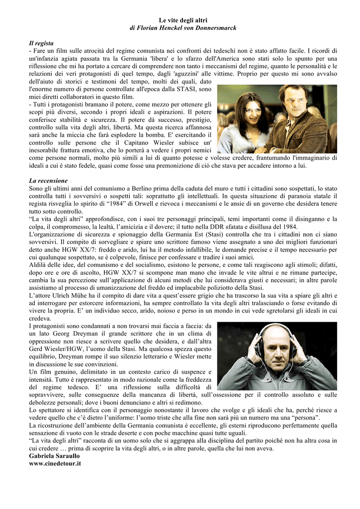 Le vite degli altri di Florian Henckel von Donnersmarck Il regista - Fare un film sulle atrocità del regime comunista nei confronti dei tedeschi non è stato affatto facile. I ricordi di un'infanzia agiata passata tra la Germania 'libera' e lo sfarzo dell'America sono stati solo lo spunto per una riflessione che mi ha portato a cercare di comprendere non tanto i meccanismi del regime, quanto le personalità e le relazioni dei veri protagonisti di quel tempo, dagli 'aguzzini' alle vittime. Proprio per questo mi sono avvalso dell'aiuto di storici e testimoni del tempo, molti dei quali, dato l'enorme numero di persone controllate all'epoca dalla STASI, sono miei diretti collaboratori in questo film. - Tutti i protagonisti bramano il potere, come mezzo per ottenere gli scopi più diversi, secondo i propri ideali e aspirazioni. Il potere conferisce stabilità e sicurezza. Il potere dà successo, prestigio, controllo sulla vita degli altri, libertà. Ma questa ricerca affannosa sarà anche la miccia che farà esplodere la bomba. E' esercitando il controllo sulle persone che il Capitano Wiesler subisce un' inesorabile frattura emotiva, che lo porterà a vedere i propri nemici come persone normali, molto più simili a lui di quanto potesse e volesse credere, frantumando l'immaginario di ideali a cui è stato fedele, quasi come fosse una premonizione di ciò che stava per accadere intorno a lui. La recensione Sono gli ultimi anni del comunismo a Berlino prima della caduta del muro e tutti i cittadini sono sospettati, lo stato controlla tutti i sovversivi o sospetti tali: soprattutto gli intellettuali. In questa situazione di paranoia statale il regista risveglia lo spirito di “1984” di Orwell e rievoca i meccanismi e le ansie di un governo che desidera tenere tutto sotto controllo. “La vita degli altri” approfondisce, con i suoi tre personaggi principali, temi importanti come il disinganno e la colpa, il compromesso, la lealtà, l’amicizia e il dovere; il tutto nella DDR sfatata e disillusa del 1984. L'organizzazione di sicurezza e spionaggio della Germania Est (Stasi) controlla che tra i cittadini non ci siano sovversivi. Il compito di sorvegliare e spiare uno scrittore famoso viene assegnato a uno dei migliori funzionari detto anche HGW XX/7: freddo e arido, lui ha il metodo infallibile, le domande precise e il tempo necessario per cui qualunque sospettato, se è colpevole, finisce per confessare e tradire i suoi amici. Aldilà delle idee, del comunismo e del socialismo, esistono le persone, e come tali reagiscono agli stimoli; difatti, dopo ore e ore di ascolto, HGW XX/7 si scompone man mano che invade le vite altrui e ne rimane partecipe, cambia la sua percezione sull’applicazione di alcuni metodi che lui considerava giusti e necessari; in altre parole assistiamo al processo di umanizzazione del freddo ed implacabile poliziotto della Stasi. L’attore Ulrich Mühe ha il compito di dare vita a quest’essere grigio che ha trascorso la sua vita a spiare gli altri e ad interrogare per estorcere informazioni, ha sempre controllato la vita degli altri tralasciando o forse evitando di vivere la propria. E’ un individuo secco, arido, noioso e perso in un mondo in cui vede sgretolarsi gli ideali in cui credeva. I protagonisti sono condannati a non trovarsi mai faccia a faccia: da un lato Georg Dreyman il grande scrittore che in un clima di oppressione non riesce a scrivere quello che desidera, e dall’altra Gerd Wiesler/HGW, l’uomo della Stasi. Ma qualcosa spezza questo equilibrio, Dreyman rompe il suo silenzio letterario e Wiesler mette in discussione le sue convinzioni. Un film genuino, delimitato in un contesto carico di suspence e intensità. Tutto è rappresentato in modo razionale come la freddezza del regime tedesco. E’ una riflessione sulla difficoltà di sopravvivere, sulle conseguenze della mancanza di libertà, sull’ossessione per il controllo assoluto e sulle debolezze personali; dove i buoni denunciano e altri si redimono. Lo spettatore si identifica con il personaggio nonostante il lavoro che svolge e gli ideali che ha, perché riesce a vedere quello che c’è dietro l’uniforme: l’uomo triste che alla fine non sarà più un numero ma una “persona”. La ricostruzione dell’ambiente della Germania comunista è eccellente, gli esterni riproducono perfettamente quella sensazione di vuoto con le strade deserte e con poche macchine quasi tutte uguali. “La vita degli altri” racconta di un uomo solo che si aggrappa alla disciplina del partito poiché non ha altra cosa in cui credere … prima di scoprire la vita degli altri, o in altre parole, quella che lui non aveva. Gabriela Saraullo www.cinedetour.it