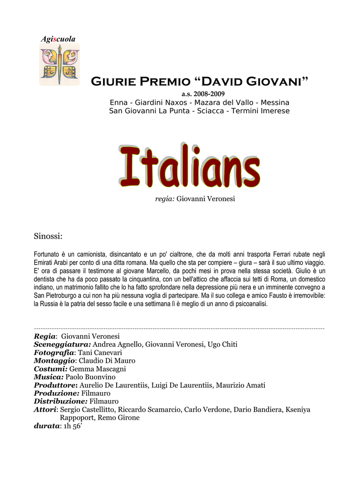 Agiscuola Giurie Premio “David Giovani” a.s. 2008-2009 Enna - Giardini Naxos - Mazara del Vallo - Messina San Giovanni La Punta - Sciacca - Termini Imerese regia: Giovanni Veronesi Sinossi: Fortunato è un camionista, disincantato e un po' cialtrone, che da molti anni trasporta Ferrari rubate negli Emirati Arabi per conto di una ditta romana. Ma quello che sta per compiere – giura – sarà il suo ultimo viaggio. E' ora di passare il testimone al giovane Marcello, da pochi mesi in prova nella stessa società. Giulio è un dentista che ha da poco passato la cinquantina, con un bell'attico che affaccia sui tetti di Roma, un domestico indiano, un matrimonio fallito che lo ha fatto sprofondare nella depressione più nera e un imminente convegno a San Pietroburgo a cui non ha più nessuna voglia di partecipare. Ma il suo collega e amico Fausto è irremovibile: la Russia è la patria del sesso facile e una settimana lì è meglio di un anno di psicoanalisi. ---------------------------------------------------------------------------------------------------------------------------------Regia: Giovanni Veronesi Sceneggiatura: Andrea Agnello, Giovanni Veronesi, Ugo Chiti Fotografia: Tani Canevari Montaggio: Claudio Di Mauro Costumi: Gemma Mascagni Musica: Paolo Buonvino Produttore: Aurelio De Laurentiis, Luigi De Laurentiis, Maurizio Amati Produzione: Filmauro Distribuzione: Filmauro Attori: Sergio Castellitto, Riccardo Scamarcio, Carlo Verdone, Dario Bandiera, Kseniya Rappoport, Remo Girone durata: 1h 56’ Spunti di riflessione 1) Il film è diviso in due episodi e inizia, in ambedue i casi, con un viaggio. Viaggiare per voi si lega al fascino dell’avventura o al piacere di allontanarsi dalla propria casa per respirare tranquillamente un’“aria” nuova di cui, spesso, ognuno di noi sente il bisogno? 2) Giovanni Veronesi, il regista del film, ha ammesso che non amava viaggiare e che era d’accordo con Giorgio Gaber quando sosteneva che “a volte è bellissimo perdere le cose invece che viverle”. Qual è la vostra opinione in merito? 3) “Italians” è stato girato negli Emirati Arabi, a Dubai, e nel deserto del Qatar per il primo episodio mentre il secondo si è svolto a San Pietroburgo. Due scelte geografiche così lontane nelle locazioni per chiarire meglio i caratteri e la provenienza sociale dei tre protagonisti? Del resto, se non si fossero definiti caratteri e provenienza sociale dei tre, le storie narrate non avrebbero avuto motivo di esistere. Siete d’accordo? Commentate. 4) Gli italiani, quando sono in viaggio all’estero vengono considerati pasticcioni, confusionari, gente che parla sempre a voce alta, spesso dando fastidio agli altri. Ma avete mai notato, senza ombra di campanilismo, un gruppo di tedeschi quando scoppia in una risata o un gruppo di inglesi (e nel film ce ne è un valido esempio) quando ha appena bevuto o un francese, che, quando incontra un italiano, ha sempre la prosopopea di essere meglio di lui? E allora? Esprimete la vostra opinione in merito. 5) C’è una frase in dialetto romanesco che, in lingua, significa: “Non ci facciamo riconoscere”. Voi pensate che possa riferirsi a molti italiani (considerando la media della levatura intellettuale dei viaggiatori) quando si trovano in altri paesi? 6) Se avete viaggiato, avete comunque notato che, insieme ad alcune definizioni denigratorie che fanno di tutta un’erba un fascio, come “mafioso”, parola che, in genere, viene pronunciata da chi sta peggio di noi,nella maggioranza dei paesi, gli italiani sono visti positivamente? Ciò, secondo la vostra opinione, è dovuta al carattere solare e allegro che, nella maggioranza, ci contraddistingue o al fatto, dimostrato da una recente ricerca della Doxa, che noi, quando viaggiamo siamo tra i popoli economicamente più generosi? 7) I episodio: a) Fortunato, un uomo buono e semplice che, per sopravvivere fa un lavoro disonesto: trasporta Ferrari rubate dall’Italia a Dubai. Probabilmente si rende conto che compie un reato ma, comunque, si giustifica. Come? b) Marcello, il giovane che accompagna Fortunato in viaggio. Non capisce il suo compagno nella frenesia della passione per le Ferrari, da Fortunato definite “come la Cappella Sistina” ma, a poco a poco, si avvicina a lui quando scopre la sua bontà. In quale momento della storia filmica ciò accade? c) E quale ruolo gioca Hamed vecchio amico di Fortunato nel sorgere di questo rapporto amicale? E quale Haifa, la figlia di Hamed? d) A Dubai, consegnata la merce, Fortunato e Marcello vanno in un locale e lì scoppia una rissa con un inglese che prende in giro Fortunato che ha cantato una canzone al microfono. Qual è la reazione di Marcello? e) “I soliti italiani!”: è questa la battuta pronunciata dall’inglese prima di attaccar briga. Commentate. f) Perché, a causa della rissa, Fortunato è costretto a partecipare a una corsa nel deserto, guidando una Ferrari? g) Qual è la partecipazione di Marcello mentre Fortunato corre e quando arriva primo, vincendo anche una borsa di 30.000 euro? h) Rientra, secondo la vostra opinione, nel carattere degli italiani, il fatto che Fortunato e Marcello non tengano il denaro vinto per loro ma…? Commentate. i) Quando Haifa, la figlia di Hamed, rincorre il camion per ringraziare, avete notato la delicatezza di Marcello che non scende dalla bisarca e l’affetto con cui Fortunato abbraccia la ragazza? j) Durante il viaggio di ritorno Marcello fa una sgradevole sorpresa a Fortunato proponendogli, tra le parole del discorso, una soluzione. k) Ritenete giusto (anche se non legale) il comportamento di Marcello? Esprimete la vostra opinione in merito. 8) II episodio: a) Giulio è un uomo di successo, oppresso da quello che, comunemente, si chiama il “male di vivere”, legato per lui a una grande insicurezza nei rapporti umani. Perché e come decide di scavalcare il fosso e tentare nuove esperienze? b) Vera è una giovane donna russa che lavora come interprete