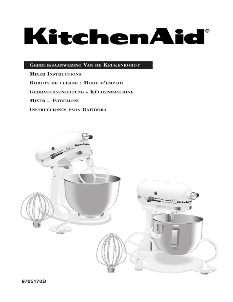 ® GEBRUIKSAANWIJZING VAN DE KEUKENROBOT MIXER INSTRUCTIONS ROBOTS DE CUISINE : MODE D’EMPLOI GEBRAUCHSENLEITUNG - KÜCHENMASCHINE MIXER – ISTRUZIONI INSTRUCCIONES PARA in l b efore tro nplug on ION: U d C 10 CAUT ee 8 Sp 4 6 te 2 Sta ir lid Off St So sertin g or re moving BATIDORA pa rts A US an enAid hig Kitch, Mic St. Jos eph KitchenAid St. Joseph, Michigan USA Solid Sta te Spe ed Con Off Stir trol 2 4 6 8 10 Heavy Du ty CAUTION: U n 9705170B plug befo re inserting o f removing pa rts Inhoudsopgave Nederlands Belangrijke veiligheidsvoorschriften ........................................................................3 Wat U moet weten over uw keukenrobot:: Kenmerken van de keukenrobotten model 5K45SS, 5KSM90 ........................4, 5 Kenmerken van de keukenrobot 5KSM5 ..........................................................6, 7 Het gebruik van de KitchenAid® hulpstukken ....................................................8 Speling tussen draadgarde en kom ......................................................................8 Onderhoud en reiniging .......................................................................................8 Planetaire mixbeweging .......................................................................................9 Gebruik van de keukenrobot ...............................................................................9 Richtlijnen voor de snelheidsinstelling ...............................................................9 Tips voor het mengen .........................................................................................10 Mengen en kneden van gistdeeg ..................................................................10, 11 Eiwitten...............................................................................................................11 Slagroom .............................................................................................................11 Wanneer U service nodig heeft...............................................................................12 Garantie van de keukenrobot ................................................................................12 R-2 Belangrijke veiligheidsvoorschriften Wanneer u de handleiding leest… let dan speciaal op die paragrafen waar de volgende woorden bij staan: ! OPGELET Dit dient ter voorkoming van schade aan het product en/of andere voorwerpen. ! WAARSCHUWING “N.B.” of “BELANGRIJK” Dit dient ter voorkoming van ongelukken die kunnen leiden tot het oplopen van letsels bij onjuist gebruik van het product. ! WAARSCHUWING OM BRANDGEVAAR, ELEKTRISCHE SCHOKKEN, LETSELS OF SCHADE TOT EEN MINIMUM TE BEPERKEN, DIENT U BIJ GEBRUIK VAN DE MIXER ELEMENTAIRE VOORZORGSMAATREGELEN IN ACHT TE NEMEN, INCLUSIEF DE HIERONDER VERMELDE: 1. Lees alle gebruiksaanwijzingen. 2. Dompel nooit de mixer in water of in een andere vloeistof, dit om gevaar voor een elektrische schok te voorkomen. 3. Controleer of de stekker van het apparaat in het te gebruiken stopcontact past. Inachtneming van de juiste aarding en plaatselijke elektrische voorschriften is vereist. 4. Laat kinderen de mixer niet gebruiken of ermee spelen. 5. Extra voorzichtigheid is geboden wanneer enig apparaat door of in de buurt van kinderen wordt gebruikt. De mixer niet onbeheerd laten waneer deze in werking is. 6. Haal de stekker uit het stopcontact als het apparaat niet in gebruik is, wanneer u onderdelen bevestigt of verwijdert, en voordat u het apparaat reinigt. 7. Zorg ervoor dat u bewegende onderdelen niet aanraakt. Houd tijdens de werking van de mixer handen, haar, kleding en ook spatels en ander keukengerei weg van de draadgarde om letsels en/of schade aan de mixer te voorkomen. 8. De mixer niet onbeheerd of vlakbij de rand van het werkoppervlak gebruiken. Bij zware belasting of op hoge snelheid kan de mixer zich op het werkoppervlak verplaatsen. 9. Verwijder voor het afwassen de platte menghaak, de draadgarde of de kneedhaak van de mixer. 10. Gebruik het apparaat niet wanneer het elektrische snoer kapot is of wanneer het apparaat is gevallen of op enigerlei wijze is beschadigd. Laat het apparaat bij de dichtstbijzijnde service agent nakijken, repareren of bijstellen. 11. Het gebruik van hulpstukken die niet door KitchenAid zijn aanbevolen, kunnen brand, elektrische schokken of letsels veroorzaken. 12. Niet buitenshuis gebruiken. 13. Laat het snoer niet over de rand van een tafel of aanrechtblad hangen, of in aanraking komen met hete oppervlakken. 14. Wanneer u een mixer model gebruikt met opklapbare kop, moet de kop geheel neergelaten zijn voordat u deze vergrendelt. Controleer alvorens te mixen of de kop vergrendeld is door te proberen de kop op te lichten. 15. Wanneer u met mixer model 5KSM90 deeg maakt, gebruik dan nooit recepten waarvoor grotere hoeveelheden nodig zijn dan 1,0 kg (8 koppen bloem) of 840 g (6 koppen) volkorenbloem. 16. Wanneer u met de mixer deeg maakt, nooit recepten gebruiken die de maximale hoeveelheden overschrijden: Model 5K45SS – 1,0 kg (8 koppen) bloem of 840 g (6 koppen) volkorenbloem. Model 5KSM5 – 1,2 kg (10 koppen) bloem of 1000 g (8 koppen) volkorenbloem. 17. Geen verlengsnoer gebruiken. 18. Wees voorzichtig bij het oplichten van de mixer aangezien deze zwaar is. 19. Gebruik de mixer alleen voor het doel waarvoor hij gemaakt is. 20. ELEKTRISCHE VEREISTEN: Uw KitchenAid® mixer werkt op 220-240 V wisselstroom, 50-60 hertz. Het vermogensverbruik voor onze KitchenAid® mixer is vermeld op de afwerkrand. Dit vermogensgebruik wordt bepaald door het gebruik van het hulpstuk dat de meeste stroom verbruikt. Andere aanbevolen hulpstukken kunnen veel minder stroom verbruiken. 21. Controleer of de naaf van het hulpstuk goed vast zit (draai de hulpstukknop vast) voordat u de mixer in werking stelt om er absoluut zeker van te zijn dat de naaf tijdens het mixen niet in de kom kan vallen. BEWAAR DEZE VEILIGHEIDSVOORSCHRIFTEN R-3 Nederlands In deze paragrafen staan nuttige tips voor het gebruik