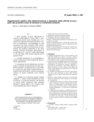 Bollettino Giuridico Ambientale 2004 29 luglio 2004, n. 248 DECRETO MINISTERIALE Regolamento relativo alla determinazione e disciplina delle attività di recupero dei prodotti e beni di amianto e contenenti amianto (G.U. n. 234 del 5 ottobre 2004) Art. 1 1. Sono adottati, ai sensi dell'articolo 6, comma 4, della legge 27 marzo 1992, n. 257, i disciplinari tecnici sulle modalità per il trasporto ed il deposito dei rifiuti di amianto nonché sul trattamento, sull'imballaggio e sulla ricopertura dei rifiuti medesimi nelle discariche, approvati dalla Commissione per la valutazione dei problemi ambientali e dei rischi sanitari connessi all'impiego dell'amianto di cui all'articolo 4, comma 1, della citata legge n. 257 del 1992, nella seduta plenaria del 15 gennaio 2004. 2. I predetti disciplinari, di cui all'allegato A, tecnici costituiscono parte integrante del presente regolamento. 3. I disciplinari tecnici definiscono ed individuano i processi di trattamento dei rifiuti contenenti amianto. I trattamenti che, come effetto, conducono alla totale trasformazione cristallochimica dell'amianto, rendono possibile il riutilizzo di questo materiale come materia prima. 4. L'allegato A, al presente decreto integra l'allegato 1, relativo all'ammissibilità dei rifiuti di amianto o contenenti amianto, del decreto 13 marzo 2003, pubblicato nella Gazzetta Ufficiale 21 marzo 2003, n. 67, recante criteri di ammissibilità dei rifiuti in discarica. ALLEGATO A DISCIPLINARI TECNICI DELLA COMMISSIONE PER LA VALUTAZIONE DEI PROBLEMI AMBIENTALI DEI RISCHI SANITARI CONNESSI ALL'IMPIEGO DELL'AMIANTO, AI SENSI DELL'ARTICOLO 5 DELLA LEGGE 27 MARZO 1992, N. 257 1. Premessa INDICE 2. Definizioni 3. Gestione dei rifiuti contenenti amianto 4. Destinazione dei rifiuti contenenti amianto 5. Ricopertura dei rifiuti contenenti amianto 6. Trattamento dei rifiuti contenenti amianto Allegato 1: Determinazione dell'indice di rilascio per i rifiuti contenenti amianto Allegato 2: Metodologie per il controllo/dei materiali ottenuti da trattamenti di RCA che non modificano la natura cristallochimica dell'amianto Allegato 3: Metodologie per il controllo dei materiali ottenuti da trattamenti di RCA che modificano la natura cristallochimica dell'amianto 1. PREMESSA 1. Il presente disciplinare tecnico è stato elaborato sulla base del mandato di cui all'art. 5, comma 1 lettera c della Legge 257/1992 in materia di smaltimento di rifiuti contenenti amianto (di seguito denominati RCA). 2. I RCA all'interno del Catalogo Europeo dei Rifiuti (CER) definito dal D.Lgs 5 febbraio 1997, n. 22 e successive modificazioni ed integrazioni, vengono classificati in base alla loro provenienza; i RCA delle categorie e/o attività generatrici di rifiuti indicate nella tabella del punto 4 sono identificati esclusivamente con i codici di cui alla tabella stessa. 3. Le modalità di ricopertura dei rifiuti RCA nelle discariche sono state elaborate ai sensi della Direttiva 1999/31/CE del 26 aprile 1999 relativa alle discariche di rifiuti. 4. Vengono, inoltre, stabiliti i metodi per il controllo delle attività di trattamento di RCA, suddivisi in due categorie di trattamento: A - trattamenti che riducono il rilascio di fibre dei RCA senza modificare la struttura cristallochimica dell'amianto, o modificandola in modo parziale; la destinazione finale di tali rifiuti trattati, che rispondano ai requisiti dell'allegato 2, e comunque lo smaltimento in discarica. B - trattamenti che modificano completamente la struttura cristallochimica dell'amianto e che quindi annullano la pericolosità connessa ai minerali di amianto; la destinazione finale dei materiali derivanti da tali trattamenti, che rispondano ai requisiti dell'allegato 3. deve essere di norma il riutilizzo come materia prima. 2. DEFINIZIONI 1. Amianto: vengono definiti amianti i seguenti silicati fibrosi: a) crocidolite: CAS 11.12001-28-4: b) crisotilo: CAS 11.12001-29-5; 1 Bollettino Giuridico Ambientale 2004 D.M. 248/2004 c) amosite: CAS 11. 12172-73-5; d) antofillite: CAS 11. 77536-67-5; e) actinolite: CAS n. 775.16-66-4; f) tremolitc: CAS 11. 77536-68-6 e successive integrazioni ai sensi dell'articolo 6, comma 1, della legge 257/92. 2. Rifiuto: qualsiasi sostanza od oggetto che rientra nelle categorie riportate nell'allegato A della Direttiva del Ministero dell'ambiente e tutela del territorio del 9 aprile 2002 "Indicazioni per la corretta e piena applicazione del regolamento comunitario 2557/2001 sulle spedizioni di rifiuti ed in relazione al nuovo elenco dei rifiuti" e di cui il detentore si disfi o abbia deciso o abbia l'obbligo di disfarsi. 3. Trattamenti: i processi fisici, termici, chimici o biologici che modificano le caratteristiche dei rifiuti allo scopo di ridurne il volume o la natura pericolosa, di facilitarne il trasporto, di agevolare il recupero o di favorirne lo smaltimento in condizioni di sicurezza. 4. Trattamento con modificazione totale della struttura cristallochimica: il processo che annulla la presenza di amianto, consentendone il riutilizzo come materia prima. 5. Stabilizzazione: processi che modificano la pericolosità de!le sostanze contenute nei rifiuti. Un rifiuto è considerato parzialmente stabilizzato se le sue componenti pericolose, che non sono state completamente trasformate in sostanze non pericolose grazie ai processo di stabilizzazione, possono essere disperse nell'ambiente nel breve, medio o lungo periodo. 6. Riutilizzo come materia prima: attività successiva al trattamento che modifica completamente la struttura cristallochimica dell'amianto e pertanto esclusa dalla normativa sui rifiuti. 7. Impianto di discarica: area adibita a smaltimento dei rifiuti mediante operazioni di deposito sul suolo o nel suolo, compresa la zona interna al luogo di produzione dei rifiuti adibita allo smaltimento dei medesimi da parte del produttore degli stessi, nonché qualsiasi area ove i rifiuti sono sottoposti a deposito temporaneo per più di un anno. Sono esclusi da tale definizi