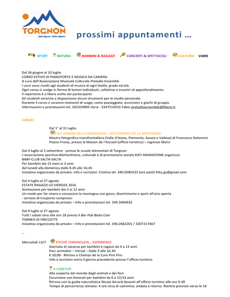 prossimi appuntamenti … SPORT NATURA BAMBINI & RAGAZZI CONCERTI & SPETTACOLI CULTURA VARIE Dal 26 giugno al 10 luglio CORSO ESTIVO DI PIANOFORTE E MUSICA DA CAMERA A cura dell’Associazione Musicale Culturale Preludio Ensemble I corsi sono rivolti agli studenti di musica di ogni livello, grado ed età. Ogni corso si svolge in forma di lezioni individuali, collettive e incontri di approfondimento. Il repertorio è a libera scelta dei partecipanti. Gli studenti avranno a disposizione alcuni strumenti per lo studio personale. Durante il corso ci saranno momenti di svago, come passeggiate, escursioni e giochi di gruppo. Informazioni e prenotazioni tel. 335324905 Ilaria - 3347514555 Fabio [email protected] LUGLIO Dal 1° al 31 luglio GLI UOMINI DELLA MONTAGNA - LES HOMMES DE LA MONTAGNE Mostra fotografica transfrontaliera (Valle d’Aosta, Piemonte, Savoia e Vallese) di Francesco Delorenzi Piazza Frutaz, presso la Maison de l’Accueil (ufficio turistico) – ingresso libero Dal 4 luglio al 2 settembre - presso le scuole elementari di Torgnon L'associazione sportiva-dilettantistica, culturale e di promozione sociale KIKY ANIMAZIONE organizza: BABY-CLUB SALTA-SALTA Per bambini dai 15 mesi ai 3 anni dal lunedì alla domenica dalle 8.45 alle 16.45 Iniziativa organizzata da privato. Info e iscrizioni: Cristina tel. 340.0585533 (ore pasti) [email protected] Dal 4 luglio al 27 agosto ESTATE RAGAZZI LO VIERDZA 2016 Animazione per bambini dai 3 ai 12 anni Un modo per far vivere e conoscere la montagna con gioco, divertimento e sport all'aria aperta - servizio di trasporto compresoIniziativa organizzata da privato – Info e prenotazioni tel. 349.3404632 Dal 9 luglio al 27 agosto Tutti i sabati sera alle ore 18 presso il Bar Pub Baita Cian TORNEO DI FRECCETTE Iniziativa organizzata da privato – Info e prenotazioni tel. 340.2662201 / 3207217667 … Mercoledì 13/7 PITCHÉ TORGNOLEIN… EXPERIENCE Giornata di vacanza per bambini e ragazzi da 4 a 13 anni Parc animalier – Introd – Dalle 9 alle 16.30 € 10,00 - Ritrovo a Champs de la Cure Piro Piro Info e iscrizioni entro il giorno precedente presso l’ufficio turistico A LODETOR Alla scoperta del mondo degli animali e dei fiori Escursione con binocoli per bambini da 6 a 12/14 anni Ritrovo con la guida naturalistica Nicola Gerard davanti all’ufficio turistico alle ore 9.30 Tempo di percorrenza stimato: 4 ore circa di cammino, andata e ritorno. Rientro previsto verso le 16 Dislivello max 150 metri - Difficoltà T (turistica) N. partecipanti: max 20 È richiesto un abbigliamento comodo da montagna con capi sovrapponibili e scarponcini. Consigliato uno zainetto per riporre pranzo al sacco (a cura dei partecipanti) ed effetti personali Iscrizioni presso l’ufficio turistico entro il giorno precedente – € 5 L’attività verrà annullata in caso di maltempo CORSO DI STEP COREOGRAFICO Palestra – Dalle 20.30 alle 21.30 Iniziativa organizzata da privato. Info e prenotazioni: Heart & Lewe tel. 338.6865615 Giovedì 14/7 ESCURSIONE IN CALESSE Dalle 10 alle 12 – € 35 da piazza Frutaz a Ronc o € 20 da piazza Frutaz a Cheille Inclusa assicurazione per 3 persone Iscrizione entro il giorno precedente presso Champs de la Cure Piro Piro Iniziativa organizzata da privato. Info tel. 333.4321005 - 333.8537096 CORSO DI STEP COREOGRAFICO Champs de la Cure – Dalle 15 alle 16 Iniziativa organizzata da privato. Info e prenotazioni: Heart & Lewe tel. 338.6865615 MINUTI A COLORI Laboratorio di mandala e Campane Tibetane Armoniche per adulti e bambini Dalle 16 alle 17, dalle 17 alle 18 o dalle 18 alle 19 presso il bar/ristorante La Montanara Iniziativa organizzata da privata. Info e iscrizioni: tel. 3333960036 (Giuseppina Poma) 3497900233 (Grazia Rey) CORSO DI PILATES MATWORK Palestra – Dalle 20 alle 21 Iniziativa organizzata da soggetto privato. Info e prenotazioni: Heart & Lewe tel. 338.6865615 Venerdì 15/7 PITCHÉ TORGNOLEIN… EXPERIENCE Giornata di vacanza per bambini e ragazzi da 6 a 13 anni Escursione in MTB e pista ciclabile (è necessario avere la propria bici) – Torgnon – Dalle 9 alle 16.30 € 10,00 - Ritrovo a Champs de la Cure Piro Piro Info e iscrizioni entro il giorno precedente presso l’ufficio turistico FATTORIA DIDATTICA Conosciamo l’azienda e facciamo il formaggio! Visita all’azienda agricola Boule de Neige per bambini da 5 a 12 anni – Dalle 9.30 alle 11.30 Possibilità di pranzo con i prodotti dell’azienda Costo: per i bambini visita € 8 oppure visita e pranzo € 20 – pranzo adulti € 20 Prenotazioni entro il giorno precedente presso l’ufficio turistico NORDIC WALKING Lezione itinerante per adulti e ragazzi dagli 8 anni Ritrovo davanti all’ufficio turistico alle 17 Si consigliano abbigliamento comodo e scarpe da ginnastica Iscrizioni entro il giorno precedente all’ufficio turistico o all’istruttrice Tony Landi tel. 347.3200152 Attività a pagamento (minimo 3 partecipanti) Sabato 16/7 CORSO DI STRETCHING Champs de la Cure – Dalle 9 alle 10 Iniziativa organizzata da privato. Info e prenotazioni: Heart & Lewe tel. 338.6865615 LA BALCONATA DEL CERVINO Escursione in mountain bike da Lavesé. Tour tecnico e impegnativo: Torgnon – Cignana – Falegnon – Maen – Buisson – Funivia per Chamois – Lod – Valtournenche – Cabinovia per la Salette – Cervinia – Antey – Col St. Pantaléon – Lavesé Info e iscrizioni: tel. 340.6688742 – 349.6190507 www.ostellolavese.com BEACH VOLLEY E BASKET Torneo amatoriale – Champs de la Cure Piro Piro ore 14. Iscrizioni entro il giorno precedente Iniziativa organizzata da privato. Info tel. 333.4321005 - 333.8537096 AGHI DI PINO Concerto con le canzoni popolari della tradizione bergamasca e non Piazza Frutaz – Ore 21 Gli Aghi di Pino nascono nel 2010 da un’idea di Vanni Anesa e Fabio Bertasa, accorgendosi che le numerose feste tra amici si concludevano immancabilmente con due chitarre acustiche, un fiaschetto di vino e le canzoni popolari tipiche della tradi