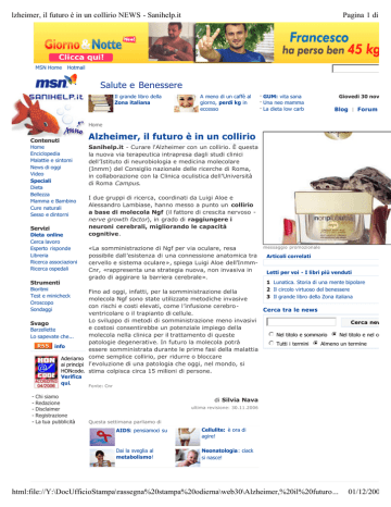 Alzheimer, il futuro è in un collirio NEWS - Sanihelp.it MSN Home Pagina 1 di Hotmail Salute e Benessere Il grande libro della Zona italiana A meno di un caffè al giorno, perdi kg in eccesso · GUM: vita sana · Una neo mamma · La dieta low carb Giovedi 30 novemb Blog Forum Home Alzheimer, il futuro è in un collirio Contenuti Home Enciclopedia Malattie e sintomi News di oggi Video Speciali Dieta Bellezza Mamma e Bambino Cure naturali Sesso e dintorni Servizi Dieta online Cerca lavoro Esperto risponde Libreria Ricerca associazioni Ricerca ospedali Strumenti Sanihelp.it - Curare l'Alzheimer con un collirio. È questa la nuova via terapeutica intrapresa dagli studi clinici dell’Istituto di neurobiologia e medicina molecolare (Inmm) del Consiglio nazionale delle ricerche di Roma, in collaborazione con la Clinica oculistica dell’Università di Roma Campus. I due gruppi di ricerca, coordinati da Luigi Aloe e Alessandro Lambiase, hanno messo a punto un collirio a base di molecola Ngf (il fattore di crescita nervoso nerve growth factor), in grado di raggiungere i neuroni cerebrali, migliorando le capacità cognitive. «La somministrazione di Ngf per via oculare, resa possibile dall’esistenza di una connessione anatomica tra cervello e sistema oculare», spiega Luigi Aloe dell’InmmCnr, «rappresenta una strategia nuova, non invasiva in grado di aggirare la barriera cerebrale». Bioritmi Test e minicheck Oroscopo Sondaggi messaggio promozionale Articoli correlati Letti per voi - I libri più venduti 1 Lunatica. Storia di una mente bipolare 2 Il circolo virtuoso del benessere 3 Il grande libro della Zona italiana Fino ad oggi, infatti, per la somministrazione della molecola Ngf sono state utilizzate metodiche invasive con rischi e costi elevati, come l’infusione cerebroCerca tra le news ventricolare o il trapianto di cellule. Lo sviluppo di metodi di somministrazione meno invasivi Cerca news Svago e costosi consentirebbe un potenziale impiego della Barzellette molecola nella clinica per il trattamento di queste j Nel titolo e sommario n k l m n i Nel titolo e nel conten j k l m Lo sapevate che... patologie degenerative. In futuro la molecola potrà j Tutti i termini n k l m n i Almeno un termine j k l m info essere somministrata durante le prime fasi della malattia Aderiamo come semplice collirio, per ridurre o bloccare ai principi l’evoluzione di una patologia che oggi, nel mondo, si HONcode. stima colpisca circa 15 milioni di persone. Verifica qui. - Chi siamo - Redazione - Disclaimer - Registrazione - La tua pubblicità Fonte: Cnr di Silvia Nava ultima revisione: 30.11.2006 Questa settimana parliamo di AIDS: pensiamoci su Cellulite: è ora di agire! Dai la sveglia al metabolismo! Neonatologia: ciack si nasce! mhtml:file://Y:\DocUfficioStampa\rassegna%20stampa%20odierna\web30\Alzheimer,%20il%20futuro... 01/12/2006 Alzheimer, il futuro è in un collirio NEWS - Sanihelp.it Pagina 2 di Eventuali decisioni che dovessero essere prese dai LETTORI, sulla base dei dati e delle informazioni qui forniti sono assunte in piena autonomia decis a loro rischio. Le informazioni qui riportate hanno carattere puramente divulgativo e orientativo; non sostituiscono la consulenza medica. È vietata la riproduzione anche parziale senza autorizzazione scritta. Anno 6 N. 5 Reg. Tribunale di Monza n° 1556 del 18 dicembre 2001. Direttore responsabile: Tarantola. ©2005 Microsoft e relativi fornitori. Tutti i diritti riservati. Condizioni per l'utilizzo Privacy Spamming mhtml:file://Y:\DocUfficioStampa\rassegna%20stampa%20odierna\web30\Alzheimer,%20il%20futuro... 01/12/2006