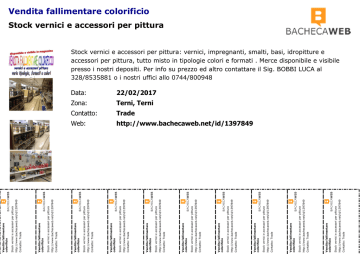 Contatto: Trade http://www.bachecaweb.net/id/1397849 Stock vernici e accessori per pittura http://www.bachecaweb.net/id/1397849 Vendita fallimentare colorificio Web: Contatto: Trade Trade http://www.bachecaweb.net/id/1397849 Contatto: Stock vernici e accessori per pittura Terni, Terni Vendita fallimentare colorificio Zona: Contatto: Trade 22/02/2017 http://www.bachecaweb.net/id/1397849 Data: Stock vernici e accessori per pittura Vendita fallimentare colorificio Contatto: Trade http://www.bachecaweb.net/id/1397849 Stock vernici e accessori per pittura Vendita fallimentare colorificio Contatto: Trade http://www.bachecaweb.net/id/1397849 Stock vernici e accessori per pittura Vendita fallimentare colorificio Contatto: Trade http://www.bachecaweb.net/id/1397849 Stock vernici e accessori per pittura Vendita fallimentare colorificio Contatto: Trade http://www.bachecaweb.net/id/1397849 Stock vernici e accessori per pittura Vendita fallimentare colorificio Contatto: Trade http://www.bachecaweb.net/id/1397849 Stock vernici e accessori per pittura Vendita fallimentare colorificio Contatto: Trade http://www.bachecaweb.net/id/1397849 Stock vernici e accessori per pittura Vendita fallimentare colorificio Contatto: Trade http://www.bachecaweb.net/id/1397849 Stock vernici e accessori per pittura Vendita fallimentare colorificio Vendita fallimentare colorificio Stock vernici e accessori per pittura Stock vernici e accessori per pittura: vernici, impregnanti, smalti, basi, idropitture e accessori per pittura, tutto misto in tipologie colori e formati . Merce disponibile e visibile presso i nostri depositi. Per info su prezzo ed altro contattare il Sig. BOBBI LUCA al 328/8535881 o i nostri uffici allo 0744/800948