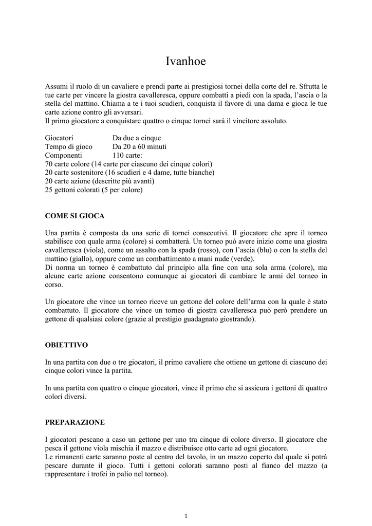 Ivanhoe Assumi il ruolo di un cavaliere e prendi parte ai prestigiosi tornei della corte del re. Sfrutta le tue carte per vincere la giostra cavalleresca, oppure combatti a piedi con la spada, l’ascia o la stella del mattino. Chiama a te i tuoi scudieri, conquista il favore di una dama e gioca le tue carte azione contro gli avversari. Il primo giocatore a conquistare quattro o cinque tornei sarà il vincitore assoluto. Giocatori Da due a cinque Tempo di gioco Da 20 a 60 minuti Componenti 110 carte: 70 carte colore (14 carte per ciascuno dei cinque colori) 20 carte sostenitore (16 scudieri e 4 dame, tutte bianche) 20 carte azione (descritte più avanti) 25 gettoni colorati (5 per colore) COME SI GIOCA Una partita è composta da una serie di tornei consecutivi. Il giocatore che apre il torneo stabilisce con quale arma (colore) si combatterà. Un torneo può avere inizio come una giostra cavalleresca (viola), come un assalto con la spada (rosso), con l’ascia (blu) o con la stella del mattino (giallo), oppure come un combattimento a mani nude (verde). Di norma un torneo è combattuto dal principio alla fine con una sola arma (colore), ma alcune carte azione consentono comunque ai giocatori di cambiare le armi del torneo in corso. Un giocatore che vince un torneo riceve un gettone del colore dell’arma con la quale è stato combattuto. Il giocatore che vince un torneo di giostra cavalleresca può però prendere un gettone di qualsiasi colore (grazie al prestigio guadagnato giostrando). OBIETTIVO In una partita con due o tre giocatori, il primo cavaliere che ottiene un gettone di ciascuno dei cinque colori vince la partita. In una partita con quattro o cinque giocatori, vince il primo che si assicura i gettoni di quattro colori diversi. PREPARAZIONE I giocatori pescano a caso un gettone per uno tra cinque di colore diverso. Il giocatore che pesca il gettone viola mischia il mazzo e distribuisce otto carte ad ogni giocatore. Le rimanenti carte saranno poste al centro del tavolo, in un mazzo coperto dal quale si potrà pescare durante il gioco. Tutti i gettoni colorati saranno posti al fianco del mazzo (a rappresentare i trofei in palio nel torneo). 1 LA SEQUENZA DI GIOCO Il giocatore seduto alla destra di chi ha dato le carte apre il primo torneo. In seguito sarà sempre il vincitore dell’ultimo torneo a dare inizio a quello successivo. Il giocatore che apre il torneo ha sempre il primo turno. Il gioco, poi, prosegue in senso orario. Ogni giocatore, a turno, può eseguire le seguenti operazioni nell’ordine indicato 1. Pescare una nuova carta 2. Giocare le carte 3. Abbandonare il torneo PESCARE UNA NUOVA CARTA Un giocatore comincia il turno pescando una carta dal mazzo. Non c’è limite al numero di carte che un giocatore può tenere in mano. Quando viene pescata l’ultima carta, gli scarti, immediatamente rimescolati, formeranno il nuovo mazzo di gioco. APRIRE UN TORNEO Il giocatore che apre il torneo sceglie il colore con il quale sarà disputato. Può scegliere qualsiasi colore. Il giocatore non è obbligato ad avere una carta del colore da lui scelto se ha in mano e gioca una carta sostenitore (bianca). Se l’ultimo torneo si è concluso con la vittoria di un gettone viola, il vincitore deve scegliere un colore diverso per il torneo seguente. Se il giocatore che apre il torneo ha in mano solo carte azione, mostra agli altri la propria mano a conferma di ciò, e a dare il via al torneo sarà il giocatore alla sua sinistra. Il giocatore che apre il torneo deve giocare, rivelandola davanti a sé, almeno una carta del colore scelto o una carta sostenitore. Oltre a queste, se lo desidera, chi apre può giocare anche altre carte, incluse le carte azione, come in un normale turno di gioco. GIOCARE LE CARTE A parte il giocatore che apre il torneo, nessun altro giocatore è obbligato a giocare alcuna carta nel suo turno. Se, però, vuole rimanere in lizza nel torneo, un giocatore deve comunque giocare almeno una carta della sua mano (una carta colore, un sostenitore o una carta azione) ogni turno. Un giocatore può giocare quante carte desidera. Se decide di giocare delle carte colore, queste devono essere dello stesso colore del torneo. Quando un giocatore gioca un colore o una carta sostenitore, le mette in tavola a faccia in su davanti a sé in un’area chiamata CAMPO. Tutti i valori delle carte devono essere visibili, ma le carte devono sovrapporsi, così da indicare l’ordine con il quale sono state giocate: la prima carta sotto la seconda, la seconda sotto la terza e così via. L’ultima carta giocata è quella in cima. Quando un giocatore gioca nel suo turno del torneo, posiziona la carta appena giocata in cima al suo campo, in modo che le carte giocate in precedenza siano ancora visibili. 2 Affinché possa restare in lizza nel torneo alla fine del turno, il totale delle carte nel campo del giocatore di mano deve essere il più alto in gioco. Se lo è, egli dichiara agli altri il valore totale del suo campo, indicando, così, la fine del proprio turno. SOSTENITORI Al posto di, o in aggiunta alle carte del colore del torneo, un giocatore può giocare nel suo campo anche delle carte sostenitore. Le carte sostenitore del valore di 2 o 3 sono gli Scudieri. Ogni giocatore può avere un numero qualsiasi di carte Scudiero nel suo campo. Le carte con valore 6 sono le Dame. Ciascun giocatore può avere una sola Dama in gioco nel proprio campo. Se un giocatore abbandona un torneo mentre c’è una dama in gioco nel suo campo, è obbligato a restituire uno dei gettoni da lui eventualmente vinti e metterlo tra gli altri al centro del tavolo. TORNEI VERDI In un torneo verde tutte le carte in campo valgono 1, a prescindere dal valore stampato su di esse. La penalità per abbandonare un torneo con una Dama in campo si applica anche ai tornei verdi (anche se il valore della dama è solo di 1 in un tale torneo). CARTE AZIONE Nel proprio turno, ogni giocatore può giocare un numero qualsiasi di c