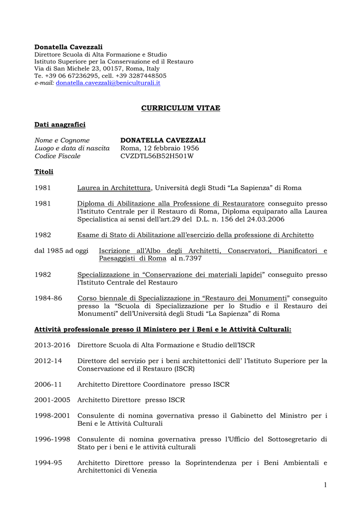 Donatella Cavezzali Direttore Scuola di Alta Formazione e Studio Istituto Superiore per la Conservazione ed il Restauro Via di San Michele 23, 00157, Roma, Italy Te. +39 06 67236295, cell. +39 3287448505 e-mail: [email protected] CURRICULUM VITAE Dati anagrafici Nome e Cognome Luogo e data di nascita Codice Fiscale DONATELLA CAVEZZALI Roma, 12 febbraio 1956 CVZDTL56B52H501W Titoli 1981 Laurea in Architettura, Università degli Studi “La Sapienza” di Roma 1981 Diploma di Abilitazione alla Professione di Restauratore conseguito presso l’Istituto Centrale per il Restauro di Roma, Diploma equiparato alla Laurea Specialistica ai sensi dell’art.29 del D.L. n. 156 del 24.03.2006 1982 Esame di Stato di Abilitazione all’esercizio della professione di Architetto dal 1985 ad oggi Iscrizione all’Albo degli Architetti, Conservatori, Pianificatori e Paesaggisti di Roma al n.7397 1982 Specializzazione in “Conservazione dei materiali lapidei” conseguito presso l’Istituto Centrale del Restauro 1984-86 Corso biennale di Specializzazione in “Restauro dei Monumenti” conseguito presso la “Scuola di Specializzazione per lo Studio e il Restauro dei Monumenti” dell’Università degli Studi “La Sapienza” di Roma Attività professionale presso il Ministero per i Beni e le Attività Culturali: 2013-2016 Direttore Scuola di Alta Formazione e Studio dell’ISCR 2012-14 Direttore del servizio per i beni architettonici dell’ l’Istituto Superiore per la Conservazione ed il Restauro (ISCR) 2006-11 Architetto Direttore Coordinatore presso ISCR 2001-2005 Architetto Direttore presso ISCR 1998-2001 Consulente di nomina governativa presso il Gabinetto del Ministro per i Beni e le Attività Culturali 1996-1998 Consulente di nomina governativa presso l’Ufficio del Sottosegretario di Stato per i beni e le attività culturali 1994-95 Architetto Direttore presso la Soprintendenza per i Beni Ambientali e Architettonici di Venezia 1 Attività professionale: 2016 Iscritta all’elenco dei “Restauratori di beni culturali” abilitati all’esercizio della professione nei settori 1-2-3-4-5 previsti dall’art. 182, commi 1 e 1bis, del D.Lgs 42/04 smi, presso la Direzione Generale Educazione e Ricerca del MIBACT 1985- 2016 Iscritta all’Ordine degli Architetti di Roma al n. 7397 1986-1994 Titolare della Ditta G.RE.CON. snc (Gruppo Restauro Conservazione) 1982-85 Ditta individuale di Donatella Cavezzali iscritta alla Camera dell’artigianato di Roma come “Restauratore” Premi PREMIO NAZIONALE: ARCA DELL’ARTE AI SALVATORI DELL’ARTE “PASQUALE ROTONDI 2013- Sezione Europa” (Legge dello Stato 111/2009) Nomine Istituzionali 2013-16 Direttore Scuola di Alta Formazione e Studio dell’ISCR 2014-16 Membro del Consiglio di Ammistrazione dell’Istituto Superiore per la Conservazione e Restauro 2015-16 Delegata del Direttore Generale Educazione e Ricerca del MIBACT come membro dell’organismo tecnico dell’Osservatorio per l’Edilizia Scolastica presso il MIUR 2012-14 Direttore del servizio per i beni architettonici dell’ l’Istituto Superiore per la Conservazione ed il Restauro (ISCR) 2013-14 Responsabile dell’Accordo bilaterale Italy-US nell’ambito del MoU tra Italia e USA per “Technlogies for Restoration”- Chairman 2009-2014 Responsabile del progetto di “Supporto alla creazione dell’Istituto Centrale per la Conservazione di Belgrado- Serbia”, Convenzione tra la Direzione Generale per la Cooperazione allo sviluppo e l’Istituto Superiore per la Conservazione ed il Restauro- Nomina del Direttore ISCR 2008-2014 Responsabile del progetto “Riqualificazione del sistema museale egiziano” , Convenzione tra la Direzione Generale per la Cooperazione allo sviluppo e il Segretariato Generale del Ministero per i Beni e le Attività Culturali Nomina del Segretariato Generale MiBAC 2009-2015 Delegata dell’ISCR presso il COUNCIL dell’ICCROM, con ruolo di membro Ex-officio (ISCR) 2009-2012 Rappresentante dell’ISCR nella Commissione mista Italo-Francese presso l’Ambasciata di Francia per il restauro della Chiesa delle Anime all’Aquila, danneggiata dal sisma del 2009 2 2006-08 Rappresentante dell’Italia nella Commissione mista italo- serba per la redazione dello “Studio di Fattibilità per la Costituzione dell’Istituto Centrale per la Conservazione di Belgrado- Serbia”, Nomina della Direzione generale per la Cooperazione allo Sviluppo 2007 Consulente ispettivo per la valutazione del finanziamento a credito di aiuto alla Cina (RPC) per gli interventi di restauro dei siti archeologici di Longmen e Dazu, Nomina della Direzione Generale Cooperazione allo Sviluppo, Ministero Affari Esteri 1998-2001- Membro dello Staff di diretta collaborazione del Ministro per i Beni e le Attività Culturali, On. Giovanna Melandri, Referente per la tutela del paesaggio e del restauro dei beni artistici, architettonici e storici, con funzioni di coordinamento scientifico su questioni di particolare rilevanza nazionale, con particolare riferimento alla riforma della legislazione nazionale in materia di qualificazione delle imprese di restauro specialistico nel settore degli appalti di lavori pubblici , e alla formazione dei restauratori di beni culturali 1999-2001 Responsabile per il Gabinetto del Ministro dei beni culturali e ambientali per gli interventi a favore del patrimonio culturale del Kosovo 1992-2003 Membro della Commissione Ministeriale per la Redazione del Capitolato Speciale d’Appalto per i Beni Culturali istituita presso l’Istituto Centrale per il Restauro 1998-99 Coordinatore tecnico-scientifico della I° Conferenza Nazionale per il Paesaggio, Ministero Beni e Attività Culturali 1996-98 Membro dello Staff di diretta collaborazione del Sottosegretario di Stato per i Beni e le attività culturali on. Willer Bordon 1992-2001 Membro della Commissione NORMAL (Normativa per i Materiali Lapidei) istituita presso il Ministero dei Beni Culturali, tra l’Istituto Centrale per il Re