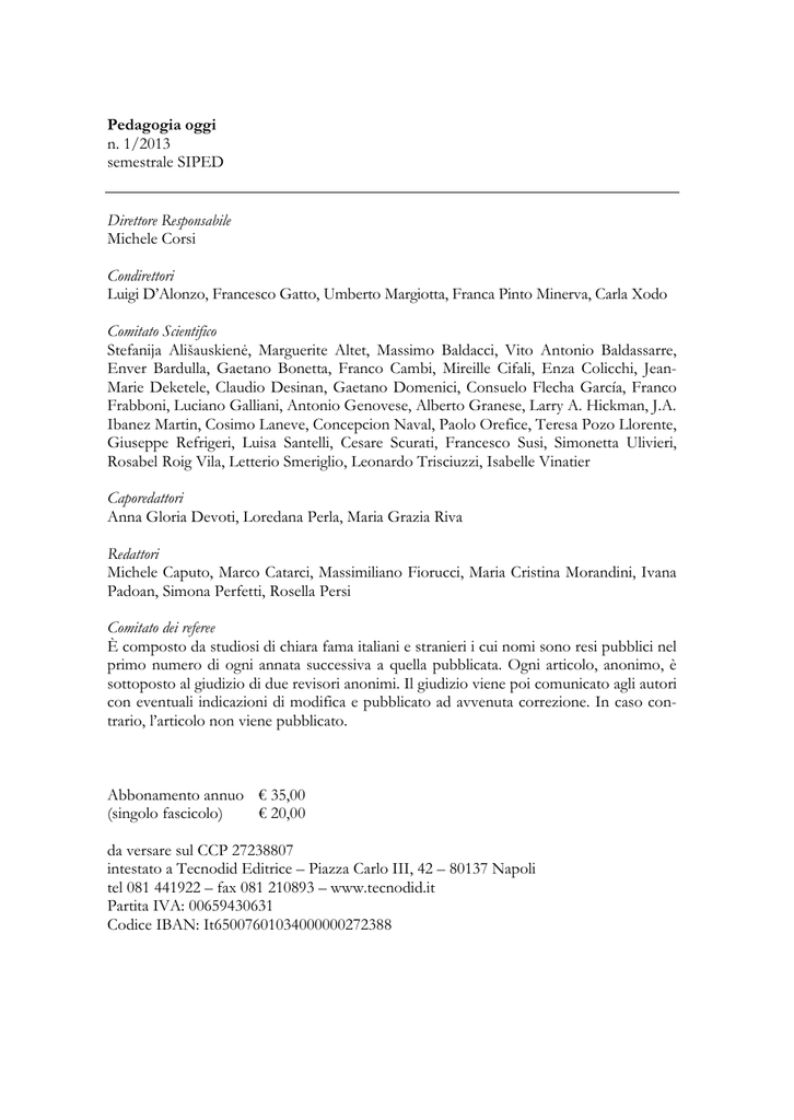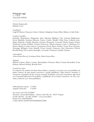 Pedagogia oggi n. 1/2013 semestrale SIPED Direttore Responsabile Michele Corsi Condirettori Luigi D’Alonzo, Francesco Gatto, Umberto Margiotta, Franca Pinto Minerva, Carla Xodo Comitato Scientifico Stefanija Ališauskienė, Marguerite Altet, Massimo Baldacci, Vito Antonio Baldassarre, Enver Bardulla, Gaetano Bonetta, Franco Cambi, Mireille Cifali, Enza Colicchi, JeanMarie Deketele, Claudio Desinan, Gaetano Domenici, Consuelo Flecha García, Franco Frabboni, Luciano Galliani, Antonio Genovese, Alberto Granese, Larry A. Hickman, J.A. Ibanez Martin, Cosimo Laneve, Concepcion Naval, Paolo Orefice, Teresa Pozo Llorente, Giuseppe Refrigeri, Luisa Santelli, Cesare Scurati, Francesco Susi, Simonetta Ulivieri, Rosabel Roig Vila, Letterio Smeriglio, Leonardo Trisciuzzi, Isabelle Vinatier Caporedattori Anna Gloria Devoti, Loredana Perla, Maria Grazia Riva Redattori Michele Caputo, Marco Catarci, Massimiliano Fiorucci, Maria Cristina Morandini, Ivana Padoan, Simona Perfetti, Rosella Persi Comitato dei referee È composto da studiosi di chiara fama italiani e stranieri i cui nomi sono resi pubblici nel primo numero di ogni annata successiva a quella pubblicata. Ogni articolo, anonimo, è sottoposto al giudizio di due revisori anonimi. Il giudizio viene poi comunicato agli autori con eventuali indicazioni di modifica e pubblicato ad avvenuta correzione. In caso contrario, l’articolo non viene pubblicato. Abbonamento annuo € 35,00 (singolo fascicolo) € 20,00 da versare sul CCP 27238807 intestato a Tecnodid Editrice – Piazza Carlo III, 42 – 80137 Napoli tel 081 441922 – fax 081 210893 – www.tecnodid.it Partita IVA: 00659430631 Codice IBAN: It65007601034000000272388 Hanno collaborato a questo numero GIUSEPPE ELIA: ordinario di Pedagogia Generale e Sociale, Università degli Studi di Bari ISABELLA LOIODICE: ordinario di Pedagogia Generale e Sociale, Università degli Studi di Foggia GIOVAN BATTISTA AMENTA: straordinario di Didattica e Pedagogia Speciale, Università degli Studi di Enna “Kore” ROBERTA CALDIN: straordinario di Didattica e Pedagogia Speciale, Università di Bologna MASSIMILIANO FIORUCCI: associato di Pedagogia Generale e Sociale, Università degli Studi di Roma TRE ALGIRDAS ALISAUSKAS: professor of Social Sciences, Siauliai University of Lithuania STEPHANYA ALISAUSKIENE: professor of Social Sciences, Siauliai University of Lithuania NURIA LLEVOT CALVET: professor of Theory and History of Education, Università di Lleida CONSUELO FLECHA GARCÍA: professor of Educational Theory and History, University of Seville EIJA KÄRNA: professor of Educational Sciences and Psychology, University of Eastern Finland AINO PARKKONEN: professor of Educational Sciences and Psychology, University of Eastern Finland MARIA BEATRIZ RODRIGUES: professor of Education Management, Unisitos Brasil KATJA TUONONEN: professor of Educational Sciences and Psychology, University of Eastern Finland MARJO VOUTILAINEN: professor of Educational Sciences and Psychology, University of Eastern Finland LUCIA ARIEMMA: ricercatore di Pedagogia Generale e Sociale, Seconda Università degli Studi di Napoli PIERANGELO BARONE: ricercatore di Pedagogia Generale e Sociale, Università degli Studi di Milano Bicocca CATIA GIACONI: ricercatore di Didattica e Pedagogia Speciale, Università degli Studi di Macerata ROSELLA PERSI: ricercatore di Pedagogia Generale e Sociale Università degli Studi di Urbino “Carlo Bo” TAMARA ZAPPATERRA: ricercatore di Didattica e Pedagogia Speciale, Università degli Studi di Firenze INDICE Editoriale La pedagogia del Well-Being Michele Corsi – Simonetta Ulivieri ............................................................................................. 5 Studi e ricerche Current pedagogic issues in inclusive education for the disabled Roberta Caldin .......................................................................................................................... 11 Disability and integrations quality Giuseppe Elia ........................................................................................................................... 26 Deviance and practices of inclusion: educational interventions for adolescent offenders Pierangelo Barone ....................................................................................................................... 36 Because they’re girls. Overcoming inequality Consuelo Flecha García .............................................................................................................. 48 Retorica politica sull’immigrazione educativa in Catalogna e realtà d’aula Nuria Llevot Calvet .................................................................................................................. 67 Teaching Writing in the context of Learning disabilities Tamara Zappaterra ................................................................................................................... 87 Per un’educazione ad una cittadinanza inclusiva. Prospettive pedagogiche Lucia Ariemma.......................................................................................................................... 101 Teachers’ and assistants’ views on an action research project with children with autism spectrum disorders: The positive outcomes and pitfalls of inclusion Eija Kärna, Aino Parkkonen, Katja Tuononen, Marjo Voutilainen ........................................... 115 3 Interventi e prospettive Provision of special pedagogical support in inclusive school of Lithuania Algirdas Alisauskas, Stephanya Alisauskiene ........................................................................... 133 Solidarity without borders in a pedagogical perspective Rosella Persi ............................................................................................................................. 148 Accesso al sapere e diritto alla formazione come presupposti della democrazia Massimiliano Fiorucci .....................................
