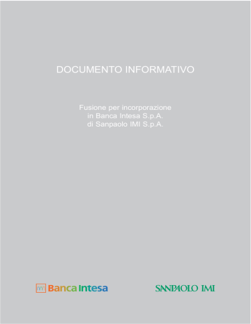 DOCUMENTO INFORMATIVO Fusione per incorporazione in Banca Intesa S.p.A. di Sanpaolo IMI S.p.A. I titoli di Banca Intesa citati nel presente documento verranno emessi in relazione alla fusione descritta e non sono stati, né si prevede saranno in futuro, registrati ai sensi della legge statunitense Securities Act of 1933 (“il Securities Act”), pertanto non possono essere offerti o venduti, direttamente o indirettamente, negli Stati Uniti eccetto in regime di deroga. È intenzione dell’emittente distribuire negli Stati Uniti i titoli di Banca Intesa in relazione alla fusione in regime di esenzione dall’obbligo di registrazione previsto dal Securities Act. La fusione in oggetto riguarda i titoli di una società straniera. L’offerta è subordinata agli obblighi di informativa imposti alle società di paesi stranieri, diversi da quelli vigenti negli Stati Uniti. I rendiconti finanziari eventualmente acclusi al documento sono stati predisposti in conformità con i principi contabili di tali paesi e pertanto potrebbero non essere comparabili con i rendiconti finanziari redatti dalle società statunitensi. Gli investitori statunitensi potrebbero incontrare difficoltà nel far valere all’estero i propri diritti e le forme di tutela previste dalle leggi statunitensi disciplinanti i mercati finanziari dato che Banca Intesa e Sanpaolo IMI hanno sede in Italia e alcuni o tutti i rispettivi funzionari ed amministratori potrebbero essere residenti in Italia o altri paesi stranieri. Gli investitori statunitensi potrebbero non essere in grado di perseguire legalmente le società straniere o i rispettivi funzionari o amministratori in tribunali di giurisdizioni estere in caso di violazione delle Securities laws statunitensi. Potrebbe inoltre risultare difficile costringere una società straniera e le relative consociate ad ottemperare alla sentenza emessa da un tribunale statunitense. Si fa presente che Banca Intesa potrebbe acquistare titoli di Sanpaolo IMI in operazioni non connesse alla fusione aziendale in oggetto, ad esempio sul mercato aperto o in trattative private. Si fa presente che Sanpaolo IMI potrebbe acquistare titoli di Banca Intesa in operazioni non connesse alla fusione aziendale in oggetto, ad esempio sul mercato aperto o in trattative private. PREVISIONI E STIME La presente comunicazione contiene stime e calcoli previsionali circa Sanpaolo IMI S.p.A. e Banca Intesa S.p.A. e le loro attività combinate a fusione conclusa. Queste informazioni di natura indicativa non rappresentano dati di fatto e comprendono le proiezioni e le stime finanziarie e i relativi assunti di base, le dichiarazioni concernenti piani, obiettivi e attese in relazione ad operazioni, prodotti e servizi futuri e le previsioni relative all’andamento economico-patrimoniale degli esercizi a venire. Previsioni e dati stimati sono in genere identificati da espressioni come “si prevede,” “si ritiene”, “è possibile,” “è previsto che”, ecc. Sebbene il management di Sanpaolo IMI S.p.A. e Banca Intesa S.p.A. consideri ragionevoli le attese rispecchiate da tali previsioni e stime, si avvisano gli investitori e i detentori di azioni di Sanpaolo IMI S.p.A. e di Banca Intesa S.p.A. che tali dati sono soggetti a rischi spesso difficili da prevedere ed in genere al di fuori del controllo di Sanpaolo IMI S.p.A. e Banca Intesa S.p.A., i quali potrebbero determinare risultati e sviluppi sostanzialmente differenti da quelli esplicitamente o implicitamente descritti o calcolati nelle previsioni e stime in questione. Tali rischi e incertezze comprendono gli aspetti discussi o identificati nei documenti pubblici inviati da Sanpaolo IMI S.p.A. e Banca Intesa S.p.A. alla CONSOB e quelli riportati nella sezione “Risk Factors” (“Fattori di Rischio”) della relazione annuale sul Modulo 20-F (Form 20-F) per l’esercizio al 31 dicembre 2005 depositata da Sanpaolo IMI S.p.A. presso la SEC il 29 giugno 2006. Eccettuati i casi previsti dalle leggi applicabili, né Sanpaolo IMI S.p.A. né Banca Intesa S.p.A. si assumono alcun obbligo circa l’aggiornamento di tali stime e previsioni. I [QUESTA PAGINA È STATA LASCIATA INTENZIONALMENTE IN BIANCO] DOCUMENTO INFORMATIVO REDATTO AI SENSI DELL’ART. 70, COMMA 4, DEL REGOLAMENTO APPROVATO CON DELIBERAZIONE CONSOB N. 11971 DEL 14 MAGGIO 1999, COME SUCCESSIVAMENTE MODIFICATO, RELATIVO ALLA FUSIONE PER INCORPORAZIONE IN BANCA INTESA S.P.A. DI SANPAOLO IMI S.P.A. Assemblea Straordinaria di Banca Intesa 30 novembre/1° dicembre 2006 Assemblea straordinaria di Sanpaolo IMI 30 novembre/1° dicembre 2006 1 [QUESTA PAGINA È STATA LASCIATA INTENZIONALMENTE IN BIANCO] Dati di sintesi al 30 giugno 2006 (milioni di euro) Voci di bilancio Gruppo Intesa Gruppo Sanpaolo IMI Rettifiche (a) Nuovo Gruppo (Pro Forma) (b) Dati economici (milioni di euro) Margine di interesse 2.640 2.434 -415 4.659 Commissioni nette 1.845 1.643 -291 3.197 Risultato della gestione finanziaria e assicurativa 4.825 4.062 -694 8.193 -2.713 -2.352 368 -4.697 Utile dell'attività corrente al lordo delle imposte 2.241 1.769 -330 3.680 Utile di periodo di pertinenza della capogruppo 1.476 1.140 -191 2.425 Oneri operativi Dati patrimoniali (milioni di euro) Attività finanziarie di negoziazione 51.160 21.645 -3.268 69.537 Crediti verso clientela 176.023 147.330 -21.504 301.849 Totale attività 280.197 270.243 -3.909 546.531 Debiti verso clientela e titoli in circolazione 193.761 146.518 -19.582 320.697 Patrimonio netto di pertinenza del Gruppo 16.832 13.949 20.255 51.036 Indicatori per azione Numero complessivo delle azioni (c) 6.948.079.223 1.874.856.336 Utile netto per azione (euro) 0,21 0,61 (d) 12.788.256.710 0,19 Patrimonio netto per azione (euro) 2,42 7,44 (d) 3,99 (a) La colonna comprende lo scorporo degli asset da cedere a Crédit Agricole S.A., le elisioni intragruppo e le rettifiche di fusione. (b) Per l'illustrazione dei criteri di redazione dei dati pro-forma si rinvia al capitolo 5. (c) Il numero non
