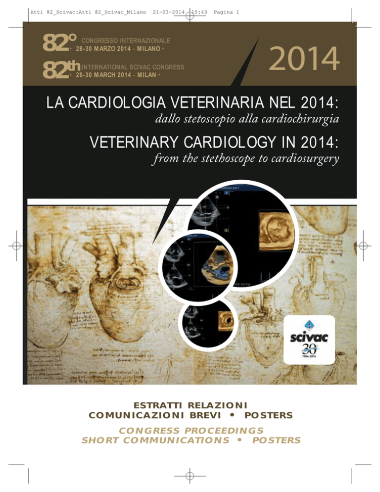Atti 82_Scivac:Atti 82_Scivac_Milano 82° 82th 21-03-2014 CONGRESSO INTERNAZIONALE • 28-30 MARZO 2014 - MILANO • INTERNATIONAL SCIVAC CONGRESS • 28-30 MARCH 2014 - MILAN • 15:43 Pagina 1 2014 LA CARDIOLOGIA VETERINARIA NEL 2014: dallo stetoscopio alla cardiochirurgia VETERINARY CARDIOLOGY IN 2014: from the stethoscope to cardiosurgery E S T R AT T I R E L A Z I O N I COMUNICAZIONI BREVI • POSTERS CONGRESS PROCEEDINGS S H O R T C O M M U N I C AT I O N S • P O S T E R S Atti 82_Scivac:Atti 82_Scivac_Milano 21-03-2014 15:43 Pagina 2 Atti 82_Scivac:Atti 82_Scivac_Milano 21-03-2014 15:43 Pagina 3 SOCIETÀ CULTURALE ITALIANA VETERINARI PER ANIMALI DA COMPAGNIA organizzato da Soc. Cons. a r.l. Azienda con sistema qualità certificato ISO 9001:2008 82° INTERNATIONAL CONGRESS LA CARDIOLOGIA VETERINARIA NEL 2014: DALLO STETOSCOPIO ALLA CARDIOCHIRURGIA 28-30 MARZO 2014 - MILANO E S T R AT T I R E L A Z I O N I COMUNICAZIONI BREVI • POSTERS 82° INTERNATIONAL CONGRESS VETERINARY CARDIOLOGY IN 2014: FROM THE STETHOSCOPE TO CARDIOSURGERY 2 0 1 4 , 2 8 th - 3 0 th M A R C H - M I L A N CONGRESS PROCEEDINGS S H O R T C O M M U N I C AT I O N S • P O S T E R S Atti 82_Scivac:Atti 82_Scivac_Milano 21-03-2014 15:43 Pagina 4 Atti 82_Scivac:Atti 82_Scivac_Milano 21-03-2014 15:43 Pagina 5 Atti 82_Scivac:Atti 82_Scivac_Milano 21-03-2014 COMITATO SCIENTIFICO CONGRESSUALE / SCIENTIFIC CONGRESS COMMITTEE MICHELE BORGARELLI DVM, DrRic, Dipl ECVIM-CA (Cardiology), Virginia (USA) DAVID CHIAVEGATO, DVM, Dr Ric, Padova LUCA FERASIN DVM, PhD, CertVC, PGCert (HE), Dipl ECVIM-CA (Card) GPCert (B&PS) MRCVS, UK MARCO POGGI, DVM, Imperia FEDERICA ROSSI, DVM, SVR, Dipl ECVDI, Bologna ROBERTO SANTILLI DVM, Dr Ric, Dipl ECVIM-CA (Cardiology), Samarate (VA) CONSIGLIO DIRETTIVO SCIVAC / SCIVAC BOARD Alberto Crotti Presidente / President Federica Rossi Presidente Senior / Senior President Walter Bertazzolo Vice Presidente / Vice President Ludovica Dragone Segretario / Secretary Guido Pisani Tesoriere / Treasurer Bruno Peirone Consigliere / Fellow member Marco Poggi Consigliere / Fellow member 15:43 Pagina 6 DIRETTORE SCIENTIFICO / SCIENTIFIC DIRECTOR FULVIO STANGA, DVM, Cremona COORDINATORE CONGRESSUALE / SCIVAC CONGRESS COORDINATOR MONICA VILLA Tel: +39 0372 403504 E mail: [email protected] SEGRETERIA MARKETING, SPONSOR E AZIENDE ESPOSITRICI / MARKETING SECRETARY FRANCESCA MANFREDI Tel: +39 0372 403538 - E mail: [email protected] SEGRETERIA ISCRIZIONI / REGISTRATION SECRETARY PAOLA GAMBAROTTI Tel: +39 0372 403508 - Fax: +39 0372 403512 E mail: [email protected] ORGANIZZAZIONE CONGRESSUALE / CONGRESS ORGANIZATION Soc. Cons. a r.l. Company with a certified quality system ISO 9001:2008 EV - Eventi Veterinari Via Trecchi 20 - 26100 CREMONA (Italia) Società Federata ANMVI SCIVAC ringrazia gli Sponsor per il sostegno dato all’evento SCIVAC wishes to thank all the key Sponsors for their support Atti 82_Scivac:Atti 82_Scivac_Milano 21-03-2014 15:43 Pagina 7 Atti 82_Scivac:Atti 82_Scivac_Milano 21-03-2014 15:43 Pagina 8 Atti 82_Scivac:Atti 82_Scivac_Milano 21-03-2014 15:43 Pagina 9 82° CONGRESSO INTERNAZIONALE SCIVAC • 28/30 MARZO 2014 - MILANO LA CARDIOLOGIA VETERINARIA NEL 2014: DALLO STETOSCOPIO ALLA CARDIOCHIRURGIA 82th INTERNATIONAL SCIVAC CONGRESS • 28/30 MARCH 2014 - MILAN VETERINARY CARDIOLOGY IN 2014: FROM THE STETHOSCOPE TO CARDIOSURGERY RELATORI / SPEAKERS RAFFAELLA BLOISE Cardiologo, IRCCS Fondazione Maugeri, Pavia, ITALY LUCA FERASIN DVM, PhD, CertVC, PGCert (HE), Dipl ECVIM-CA (Cardiology), GPCert (B&PS), MRCVS di Bristol, UK MARCO POGGI DVM, Imperia, ITALY MICHELE BORGARELLI DVM, Dott Ric, Dipl ECVIM-CA (Cardiology), Blacksburg, VA, USA JENS HÄGGSTRÖM DVM, PhD, Dipl ACVIM-CA (Cardiology), Uppsala, SWEDEN CECILIA QUINTAVALLA DVM, Dr Ric, Parma, ITALY CLAUDIO MARIA BUSSADORI DVM, DM, Dipl ECVIM (Cardiology), Milano, ITALY ANDREA MAZZANTI Cardiologo, IRCCS Fondazione Maugeri, Pavia, ITALY FEDERICA ROSSI DVM, SRV, Dipl ECVDI, Sasso Marconi (BO), ITALY DAVID CHIAVEGATO DVM, Dr Ric, Padova, ITALY NICOLA MONTEFORTE Cardiologo, IRCCS Fondazione Maugeri, Pavia, ITALY ROBERTO SANTILLI DVM, Dipl ECVIM-CA (Cardiology), Samarate (VA), ITALY SERENA CROSARA DVM, Dr Ric, Dipl ECVIMCA (Cardiology), Torino, ITALY CHRISTOPHER ORTON DVM, PhD, DIPL ACVS, Fort Collins, (CO), USA MASAMI UECHI DVM (Cardiology), PhD, Tokyo, JAPAN Atti 82_Scivac:Atti 82_Scivac_Milano 21-03-2014 15:43 Pagina 10 Atti 82_Scivac:Atti 82_Scivac_Milano 21-03-2014 15:43 Pagina 11 82° CONGRESSO INTERNAZIONALE SCIVAC • 28/30 MARZO 2014 - MILANO LA CARDIOLOGIA VETERINARIA NEL 2014: DALLO STETOSCOPIO ALLA CARDIOCHIRURGIA 82th INTERNATIONAL SCIVAC CONGRESS • 28/30 MARCH 2014 - MILAN VETERINARY CARDIOLOGY IN 2014: FROM THE STETHOSCOPE TO CARDIOSURGERY PROGRAMMA PRELIMINARE / SCIENTIFIC PROGRAM VENERDì 28 MARZO 2014 / FRIDAY, 28th MARCH 2014 CONTINUING EDUCATION Chairperson: Marco Poggi SESSIONE AVANZATA / ADVANCED SESSION Chairperson: Francesco Migliorini 10.00 Auscultazione cardiaca: tutto quello che si deve sapere Cardiac Auscultation Crash Course J. Häggström (S) Cardiomiopatia aritmogena del ventricolo destro nell’uomo Arrhythmogenic right ventricular cardiomyopathy in humans - A. Mazzanti (I) 10.50 Perché i cani con malattia cardiaca tossiscono? Why do dogs with heart disease cough? L. Ferasin (I) Cardiomiopatia aritmogena del ventricolo destro nel cane - R. Santilli (I) Arrhythmogenic right ventricular cardiomyopathy in the dog 11.40 12.10 PAUSA CAFFÈ ED ESPOSIZIONE COMMERCIALE / COFFEE BREAK AND COMMERCIAL EXPOSITION Quando e come utilizzare la radiologia in un animale cardiopatico? Radiology in heart diseases: when and how? F. Rossi (I) Canalopatie cardiache nell’uomo: dalla fisiologia al management clinico Cardiac channelopathies in humans: from mechanisms to clinical management - R. Bloise (I) PAUSA PRANZO / LUNCH TIME 13.00 CONTINUING EDUCATION Chairperson: Francesco Migliorini SESSIONE AVANZATA / ADVANCED SESSION Chairperson