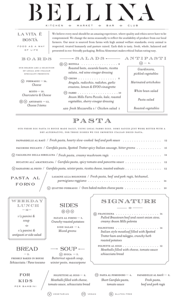 L A V I TA È We believe every meal should be an amazing experience, where quality and ethics never have to be compromised. We change the menu seasonally to reflect the availability of produce from our local farmers. Our meat is sourced from farms with high animal welfare standards; every animal is respected, treated humanely and pasture raised. Each dish is tasty, fresh, whole, balanced and presented in eco-friendly packaging. Bellina Alimentari makes ethical Italian eating easy. BON TÀ food a s a way of life salad s boards ou r b o a r d s a r e a se l e c t ion of l o c a l a n d i t a l i a n sp e c i a l t y p r oduc t s antipasti crudo . . . . . . . . . . . . . . . . . 8 Arugula, radicchio, radishes, garlic croutons, lemon & EVOO vinaigrette formaggi — 16. Cheese misto — 18. Charcuterie & Cheese antipasti — 12. Choose 3 items — 4. bietola . . . . . . . . . . . . . . . . 8 Roasted beets, escarole hearts, ricotta salata, red wine vinegar dressing Giardiniera, pickled vegetables Marinated artichokes farro . . . . . . . . . . . . . . . . . . 10 Anson Mills Farro Piccolo, kale, roasted vegetables, sherry vinegar dressing add fresh Mozzarella 3 / Chicken salad 5 White bean salad Pasta salad Roasted vegetables pa s t a our fresh egg p a sta is hou s e made d a il y, using lo cal farms egg s . so m e sa u c es just w o r k bett e r w ith a dr y alte r native, f or thos e d i shes we u s e impo r ted italian d ried p ast a. pappardelle al ragù / Fresh pasta, hearty slow-cooked beef and pork sauce . . . . . . . . . . . . . . . . . 12 paccheri piccanti / Garofalo pasta, Spotted Trotter spicy Italian sausage, bitter greens . . . . . . . . . . . 15 tagliolini della sorellina / Fresh pasta, creamy mushroom ragù . . . . . . . . . . . . . . . . . . . . . . 14 bucatini all’ amatriciana / Garofalo pasta, spicy tomato and pancetta sauce . . . . . . . . . . . . . . . . 12 radiatori al pesto / Garofalo pasta, winter pesto, ricotta cheese, toasted walnuts . . . . . . . . . . . . . . . . 12 p a st a a l f o rn o we ekd ay lun c h lasagne alla bolognese / Fresh pasta, beef and pork ragù, béchamel, parmigiano reggiano . . . . . . . . . . . . . . . . . . . . . . . . . . . . . . . . 14 quattro formaggi / Oven baked molten cheese pasta . . . . . . . . . . . . . . . . 10 s ignature SI DES — 12 — 1/2 panini & soup 1/2 panini & antipasti or side salad BREA D SOU P — 2. freshly baked in house Schiacciata / Pane toscano zucca — 5. Butternut squash soup, winter pesto, mascarpone for kids per bambini francesina . . . . . . . . . . . . . . . . . . . 16 Pulled Brasstown beef and sweet onion stew, creamy Anson Mills polenta patate al forno — 3. Crunchy roasted potatoes side salad — 4. Mixed greens polpettone . . . . . . . . . . . . . . . . . . . 14 Italian style meatloaf filled with Spotted Trotter ham and taleggio, crunchy herb roasted potatoes polpette al sugo . . . . . . . . . . . . . . . . 12 Meatballs filled with cheese, tomato sauce schiacciata bread polpettine al sugo — 8. Meatballs filled with cheese, tomato sauce, schiacciata bread v v eg e ta ri a n VE v eg a n pasta al pomodoro — 6. Short Garofalo pasta, tomato sauce g g lut en free papardelle al ragù — 8. Fresh pasta, beef and pork ragù SANDWICHES ou r a r t i s a n pa n e t o s c a no a n d s c h i a c c i a t a , a t u s c a n v e r sion of f o c a c c i a , a r e f r e sh l y b a k e d i n hou se pollo . . . . . . . . . . . . . . . . . . . . . . . . . . . . . . . . . . . 11 Schiacciata, Italian chicken salad, arugula, artichok e spread porchetta . . . . . . . . . . . . . . . . . . . . . . . . . . . . . . . 12 Pane Toscano, succulent boneless Riverview Farms pork and herb roast, salsa verde prosciutto cotto . . . . . . . . . . . . . . . . . . . . . . . . . 12 Schiacciata, Spotted Trotter rosemary ham, mushroom spread, taleggio cheese Desserts salsiccia . . . . . . . . . . . . . . . . . . . . . . . . . . . . . . . . 13 Pane Toscano, spicy Spotted Trotter Italian sausage, roasted fennel, house-made mayo fiorentino . . . . . . . . . . . . . . . . . . . . . . . . . . . . . . 12 Schiacciata, Bellina’s finocchiona, arugula, pecorino toscano funghi . . . . . . . . . . . . . . . . . . . . . . . . . . . . . . . . . . 12 Pane toscano, shiitake mushrooms, fontina, chestnut spread, radicchio, winter pesto panna cotta / Italian custard, fruit coulis torta al cioccolato / Flourless chocolate hazelnut cake torta della nonna / Custard and pine nut tart 5 ea. drinks h o u s e ma d e s odas hous e wi n e s — 4 ea. — vino della casa APPLE & ROSEMARY pinot grigio — 6. Venezia, Montelvini, Veneto 2013 LEMON & THYME POMEGRANATE & BALSAMIC sangiovese — 7. Montello Colli Asolani, Montelvini, Veneto 2013 cioccolata cacao atl sipping hot chocolate . . 4.5 add grappa . . . . . . . . . . . . . . . 4 draft libations ca ff è espresso . . ristretto . doppio . . . macchiato . cappuccino latte . . . . americano . shakerato . THE CULINARY CLUB Join us for cooking classes, workshops, and private events . . . . . . . . . . . . . . . . . . . . . . . . . . . . . . . . . . . . . . . . . . . . . . . . . . . . . . . . . . . . . . . . . . . . . . . . . . . . . . . . . . . . . . . . . . . . . . . . . . . . . . . . . . . . . . . . 2 2 3 3 4 4 3 4 negroni — 7. gin, cocchi torino, campari the 404 — 7. bourbon, sweet vermouth, cardamom w e a r e p r ou d t o c ol l a b or a t e w i t h t h e f ol l o w i ng fa r ms a n d p u r v e y or s a ns on mil l s – g r a ins br a s s to w n beef – beef southern swiss dairy - milk decim a l pl ac e fa rm, m a n y fo ld fa rm, s w ee t g r a s s da iry, nature’s harmony - chee s e s ri v erv ie w fa rms - heritag e po rk the s pot t ed t rot t er – cured me at s the turnip t ruc k – s e a s on a l pro duc e w hit e oa k pa s ture s – eg g s Due to the seasonal, local and ecological nature of our ingredients, some products may not always be available. Consuming raw or undercooked foods such as meat, pou