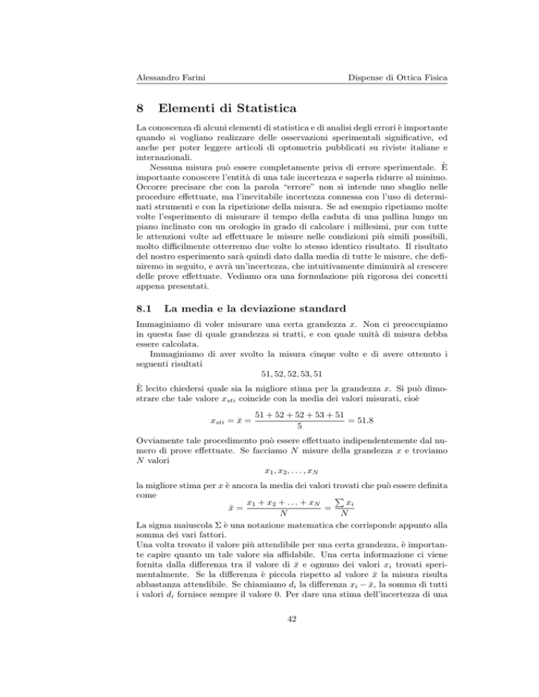 Alessandro Farini 8 Dispense di Ottica Fisica Elementi di Statistica La conoscenza di alcuni elementi di statistica e di analisi degli errori è importante quando si vogliano realizzare delle osservazioni sperimentali significative, ed anche per poter leggere articoli di optometria pubblicati su riviste italiane e internazionali. Nessuna misura può essere completamente priva di errore sperimentale. È importante conoscere l’entità di una tale incertezza e saperla ridurre al minimo. Occorre precisare che con la parola “errore” non si intende uno sbaglio nelle procedure effettuate, ma l’inevitabile incertezza connessa con l’uso di determinati strumenti e con la ripetizione della misura. Se ad esempio ripetiamo molte volte l’esperimento di misurare il tempo della caduta di una pallina lungo un piano inclinato con un orologio in grado di calcolare i millesimi, pur con tutte le attenzioni volte ad effettuare le misure nelle condizioni più simili possibili, molto difficilmente otterremo due volte lo stesso identico risultato. Il risultato del nostro esperimento sarà quindi dato dalla media di tutte le misure, che definiremo in seguito, e avrà un’incertezza, che intuitivamente diminuirà al crescere delle prove effettuate. Vediamo ora una formulazione più rigorosa dei concetti appena presentati. 8.1 La media e la deviazione standard Immaginiamo di voler misurare una certa grandezza x. Non ci preoccupiamo in questa fase di quale grandezza si tratti, e con quale unità di misura debba essere calcolata. Immaginiamo di aver svolto la misura cinque volte e di avere ottenuto i seguenti risultati 51, 52, 52, 53, 51 È lecito chiedersi quale sia la migliore stima per la grandezza x. Si può dimostrare che tale valore xsti coincide con la media dei valori misurati, cioè xsti = x̄ = 51 + 52 + 52 + 53 + 51 = 51.8 5 Ovviamente tale procedimento può essere effettuato indipendentemente dal numero di prove effettuate. Se facciamo N misure della grandezza x e troviamo N valori x1 , x2 , . . . , xN la migliore stima per x è ancora la media dei valori trovati che può essere definita come ! x1 + x2 + . . . + xN xi x̄ = = N N La sigma maiuscola Σ è una notazione matematica che corrisponde appunto alla somma dei vari fattori. Una volta trovato il valore più attendibile per una certa grandezza, è importante capire quanto un tale valore sia affidabile. Una certa informazione ci viene fornita dalla differenza tra il valore di x̄ e ognuno dei valori xi trovati sperimentalmente. Se la differenza è piccola rispetto al valore x̄ la misura risulta abbastanza attendibile. Se chiamiamo di la differenza xi − x̄, la somma di tutti i valori di fornisce sempre il valore 0. Per dare una stima dell’incertezza di una 42 Alessandro Farini Dispense di Ottica Fisica data misura si ricorre a sommare il quadrato delle differenze di per poi farne la radice quadrata dopo aver diviso per il numero di prove effettuate meno uno. La corretta definizione per l’incertezza della misura è quindi " 1 # σx = (xi − x̄)2 N −1 che per l’esempio precedente viene a valere 0.8. Molte prove hanno mostrato che tale valore σ, detto “standard deviation” è una buona stima per l’errore sperimentale. Nel dare il valore finale della misura si tende quindi a scrivere che x = x̄ ± σx Ad esempio nel caso visto prima scriveremmo x = 51.8 ± 0.8 Considerazioni matematiche ci permettono di affermare che se andassimo a ripetere la nostra misura di x, abbiamo circa il sessantotto per cento di probabilità che essa venga a cadere nell’intervallo indicato dalle espressioni precedenti. 8.2 Alcune definizioni • Popolazione: è il gruppo di individui di interesse in un particolare studio. Esempio: tutti i portatori di lenti a contatto miopi • Campione: è un gruppo di individui, selezionato all’interno della popolazione e che puó rappresentare la popolazione all’interno del nostro studio Esempio: 100 portatori di lenti a contatto miopi 8.3 La distribuzione gaussiana Immaginiamo di dover misurare una determinata grandezza (che potrebbe anche essere ad esempio lo spessore di una lente oftalmica, o il suo peso). Per i motivi precedentemente accennati se ripetiamo molte volte la misura otterremo sempre valori diversi, a causa dell’incertezza della misura stessa. Immaginiamo di aver svolto la misura 30 volte e di rappresentare i valori ottenuti in un istogramma che riporta sull’asse delle ascisse i valori ottenuti suddivisi in intervalli e sull’asse delle ordinate quante volte stato ottenuto un valore all’interno di quell’intervallo. L’istogramma è riportato in Fig.36. Se poi ripetiamo la misura 100 volte il risultato potrebbe essere quello riportato in Fig.37. Già dopo 100 misure ci si può accorgere che la dstribuzione dei risultati assume una forma interessante, con un picco centrale e le misure che si diradano via via che ci allontaniamo dal centro. Questo tipo di distribuzione risulta ancora più evidente dopo 1000 misure (Fig.38). Se poi decidiamo di svolgere centomila misure e di creare intervalli molto più piccoli ecco che l’istogramma assume una forma estremamente nota in statistica (Fig.39) e che si definisce una gaussiana. Si può dimostrare che il valore di picco della gaussiana coincide proprio con la media della misura. La gaussiana è una curva che non ha limiti sull’asse x, anche se la probabilit di ottenre una misura via via che ci allontaniamo dal valor medio scende sempre pi. Si può dimostrare che circa il 68 % circa delle misure stanno tra x̄ − σx e x̄ + σx , mentre il 95 % 43 Alessandro Farini Dispense di Ottica Fisica Figura 36: Istogramma di una misura ripetuta 30 volte (si tratta di una misura ipotetica generata al calcolatore con valore atteso zero) Figura 37: Istogramma di una misura ripetuta 100 volte 44 Alessandro Farini Dispense di Ottica Fisica Figura 38: Istogramma di una misura ripetuta 1000 volte circa stanno tra x̄ − 2σx e x̄ + 2σx , e il 99.7% 