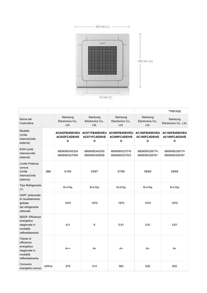 *TRIFASE Samsung Electronics Co., Ltd. Nome del Costruttore Modello (Unità interna/Unità esterna) Samsung Electronics Co., Ltd. Samsung Electronics Co., Ltd. Samsung Electronics Co., Ltd. Samsung Electronics Co., Ltd. AC052FB4DEH/EU AC071FB4DEH/EU AC090FB4DEH/EU AC100FB4DEH/EU AC100FB4DEH/EU AC052FCADEH/E AC071FCADEH/E AC090FCADEH/E AC100FCADEH/E AC100FCADGH/E U U U U U EAN (unità interna/unità esterna) 8806085345324 8806085327009 8806085345355 8806085329508 8806085327016 8806085327023 8806085326774 8806085326781 8806085326774 8806085326767 51/64 53/67 57/68 58/69 58/69 Tipo Refrigerante (1) R-410a R-410a R-410a R-410a R-410a GWP: potenziale di riscaldamento globale del refrigerante utilizzato 1975 1975 1975 1975 1975 SEER: Efficienza energetica stagionale in modalità raffreddamento 6,4 6 5,61 5,61 5,61 Classe di efficienza energetica stagionale in modalità raffreddamento A++ A+ A+ A+ A+ 279 414 563 625 625 Livello Potenza sonora (Unità interna/Unità esterna) Consumo energetico annuo dBA kWh/a indicativo (2) (QCE Stagione di raffreddamento) Carico termico teorico in modalità raffreddamento (Pdesignc) 5,1 7,1 9 10 10 SCOP: Efficienza energetica stagionale in modalità riscaldamento (Stagione media) 4 3,9 3,81 3,81 3,81 Classe di efficienza energetica stagionale in modalità riscaldamento (Stagione media) A+ A A A A kWh/a 1050 1615 2432 2800 2800 Carico termico teorico in modalità riscaldamento (Pdesignh Stagione di riscaldamento media) kW 3 4,5 6,6 7,6 7,6 Potenza termica di sicurezza elettrica elbu(Tj) (Stagione di riscaldamento media) kW 0 0 0 0 0 Capacità dichiarata in condizioni di progettazione di riferimento kW 3 4,5 6,6 7,6 7,6 Capacità ipotizzata di riscaldamento del sistema di backup in condizioni di progettazione di riferimento kW 0 0 0 0 0 Assorbimento (Raff reddamento) Std kW 1,54 (0,33~2,1) 2,21 (0,35~4,0) 2,99 (0,6~3,7) 3,32 (0,6~4,7) 3,32 (0,9~4,7) Consumo energetico annuo indicativo (3) (QHE Stagione di riscaldamento media) kW (Min~Max) (4) Assorbimento (Riscaldamento) Std (Min~Max) (4) kW 1,46 (0,25~1,9) 2,22 (0,35~4,0) 2,93 (0,46~5,2) 3,32 (0,5~5,2) 3,32 (0,5~5,2) Capacità (Raff reddamento) Std (Min~Max) (4) kW 5,1 (1,0~6,0) 7,1 (2,2~8,0) 9,0 (3,0~10,0) 10,0 (3,2~12,0) 10,0 (4,0~12,0) Capacità (Riscaldamento) Std (Min~Max) (4) kW 5,7 (1,0~7,0) 8,0 (1,9~9,0) 10,0 (2,2~13,9) 11,2 (2,2~15,5) 11,2 (3,5~15,5) Pressione Statica Min-Std-Max mmH2 O - - - - - Aria trattata (max) m3/min 17 19,5 24,5 28 28 Dimensioni Unità interna (LxAxP) mm 840x204x840 840x204x840 840x246x840 840x246x840 840x246x840 Dimensioni Pannello (LxAxP) mm 950x45x950 950x45x950 950x45x950 950x45x950 950x45x950 Dimensioni Unità esterna (LxAxP) mm 790x548x285 880x798x310 940x998x330 940x998x330 940x998x330 Peso Unità interna Kg 15,5 15 16 16 16 Peso Pannello Kg 5,9 5,9 5,9 5,9 5,9 Peso Unità esterna Kg 38,5 55 72 72 72 Tubo liquido OD Ø6.35mm (1/4”) Ø6.35mm (1/4”) Ø9.52mm (3/8”) Ø9.52mm (3/8”) Ø9.52mm (3/8”) Tubo gas OD Ø12.7mm (1/2”) Ø15.88mm (5/8”) Ø15.88mm (5/8”) Ø15.88mm (5/8”) Ø15.88mm (5/8”) Lunghezza tubazioni Max m 30 50 50 50 50 Lunghezza tubazioni Max senza aggiunta di refrigerante m 5 5 30 30 30 Dislivello max (Unità interna/Unità esterna) m 20 30 30 30 30 Refrigerante g 1400 1800 3000 3000 3000 Carica aggiuntiva refrigerante g/m 10 25 30~40m: 500g; 40~50m:1000g 30~40m: 500g; 40~50m:1000g 30~40m: 500g; 40~50m:1000g Intervallo di funzionamento (Raffreddamento ) °C -10~46 -15~50 -15~50 -15~50 -15~50 Intervallo di funzionamento (Riscaldamento) °C -15~24 -20~24 -20~24 -20~24 -20~24 2) Consumo di energia 2) Consumo di energia 2) Consumo di energia 2) Consumo di energia 2) Consumo di energia 279 kWh/anno in base 414 kWh/anno in base 563 kWh/anno in base 625 kWh/anno in base 625 kWh/anno in base ai risultati di prove ai risultati di prove ai risultati di prove ai risultati di prove ai risultati di prove standard. Il consumo effettivo dipende dalle modalità di utilizzo dell’apparecchio e dal luogo in cui è installato. standard Il consumo effettivo dipende dalle modalità di utilizzo dell’apparecchio e dal luogo in cui è installato. standard. Il consumo effettivo dipende dalle modalità di utilizzo dell’apparecchio e dal luogo in cui è installato. standard. Il consumo effettivo dipende dalle modalità di utilizzo dell’apparecchio e dal luogo in cui è installato. standard. Il consumo effettivo dipende dalle modalità di utilizzo dell’apparecchio e dal luogo in cui è installato. 3) Consumo di energia 1050 kWh/anno in base ai risultati di prove standard. Il consumo effettivo dipende dalle modalità di utilizzo dell’apparecchio e dal luogo in cui è installato. 3) Consumo di energia 1615 kWh/anno in base ai risultati di prove standard. Il consumo effettivo dipende dalle modalità di utilizzo dell’apparecchio e dal luogo in cui è installato. 3) Consumo di energia 2432 kWh/anno in base ai risultati di prove standard. Il consumo effettivo dipende dalle modalità di utilizzo dell’apparecchio e dal luogo in cui è installato. 3) Consumo di energia 2800 kWh/anno in base ai risultati di prove standard. Il consumo effettivo dipende dalle modalità di utilizzo dell’apparecchio e dal luogo in cui è installato. 3) Consumo di energia 2800 kWh/anno in base ai risultati di prove standard. Il consumo effettivo dipende dalle modalità di utilizzo dell’apparecchio e dal luogo in cui è installato. 1) La perdita di refrigerante contribuisce al cambiamento climatico. In caso di rilascio nell’atmosfera, i refrigeranti con un potenziale di riscaldamento globale (GWP) più basso contribuiscono in misura minore al riscaldamento globale rispetto a quelli con un GWP più elevato. Questo apparecchio contiene un fluido refrigerante con un GWP di 1975. Se 1 kg di questo fluido refrigerante fosse rilasciato nell’atmosfera, quindi, l’impatto sul riscaldamento globale sarebbe 1975 volte più elevato rispetto a 1 kg di CO2, per un periodo di 100 anni. In nes