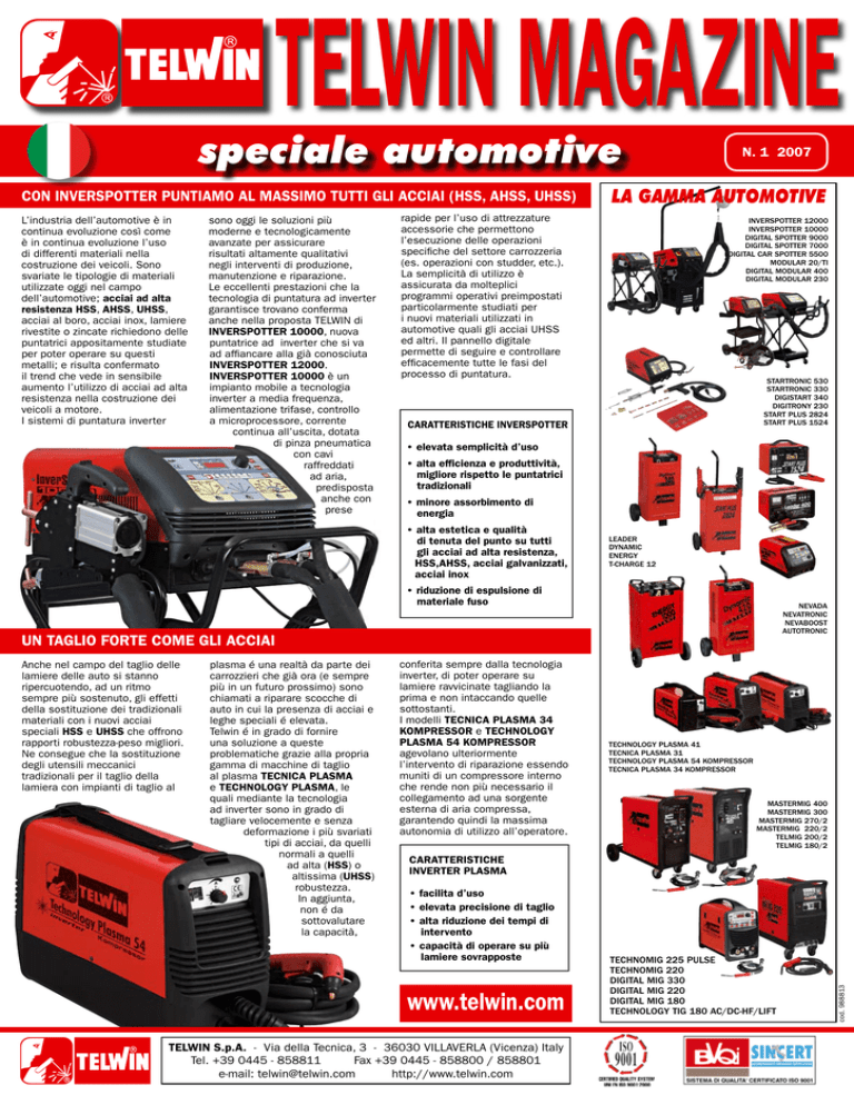 TELWIN MAGAZINE speciale automotive CON INVERSPOTTER PUNTIAMO AL MASSIMO TUTTI GLI ACCIAI (HSS, AHSS, UHSS) sono oggi le soluzioni più moderne e tecnologicamente avanzate per assicurare risultati altamente qualitativi negli interventi di produzione, manutenzione e riparazione. Le eccellenti prestazioni che la tecnologia di puntatura ad inverter garantisce trovano conferma anche nella proposta TELWIN di INVERSPOTTER 10000, nuova puntatrice ad inverter che si va ad affiancare alla già conosciuta INVERSPOTTER 12000. INVERSPOTTER 10000 è un impianto mobile a tecnologia inverter a media frequenza, alimentazione trifase, controllo a microprocessore, corrente continua all’uscita, dotata di pinza pneumatica con cavi raffreddati ad aria, predisposta anche con prese LA GAMMA AUTOMOTIVE rapide per l’uso di attrezzature accessorie che permettono l’esecuzione delle operazioni specifiche del settore carrozzeria (es. operazioni con studder, etc.). La semplicità di utilizzo è assicurata da molteplici programmi operativi preimpostati particolarmente studiati per i nuovi materiali utilizzati in automotive quali gli acciai UHSS ed altri. Il pannello digitale permette di seguire e controllare efficacemente tutte le fasi del processo di puntatura. INVERSPOTTER 12000 INVERSPOTTER 10000 DIGITAL SPOTTER 9000 DIGITAL SPOTTER 7000 DIGITAL CAR SPOTTER 5500 MODULAR 20/TI DIGITAL MODULAR 400 DIGITAL MODULAR 230 STARTRONIC 530 STARTRONIC 330 DIGISTART 340 DIGITRONY 230 start plus 2824 START PLUS 1524 CARATTERISTICHE INVERSPOTTER • elevata semplicità d’uso • alta efficienza e produttività, migliore rispetto le puntatrici tradizionali • minore assorbimento di energia • alta estetica e qualità di tenuta del punto su tutti gli acciai ad alta resistenza, HSS,AHSS, acciai galvanizzati, acciai inox LEADER DYNAMIC ENERGY T-CHARGE 12 • riduzione di espulsione di materiale fuso NEVADA NEVATRONIC NEVABOOST AUTOTRONIC UN TAGLIO FORTE COME GLI ACCIAI Anche nel campo del taglio delle lamiere delle auto si stanno ripercuotendo, ad un ritmo sempre più sostenuto, gli effetti della sostituzione dei tradizionali materiali con i nuovi acciai speciali HSS e UHSS che offrono rapporti robustezza-peso migliori. Ne consegue che la sostituzione degli utensili meccanici tradizionali per il taglio della lamiera con impianti di taglio al plasma é una realtà da parte dei carrozzieri che già ora (e sempre più in un futuro prossimo) sono chiamati a riparare scocche di auto in cui la presenza di acciai e leghe speciali é elevata. Telwin é in grado di fornire una soluzione a queste problematiche grazie alla propria gamma di macchine di taglio al plasma TECNICA PLASMA e TECHNOLOGY PLASMA, le quali mediante la tecnologia ad inverter sono in grado di tagliare velocemente e senza deformazione i più svariati tipi di acciai, da quelli normali a quelli ad alta (HSS) o altissima (UHSS) robustezza. In aggiunta, non é da sottovalutare la capacità, conferita sempre dalla tecnologia inverter, di poter operare su lamiere ravvicinate tagliando la prima e non intaccando quelle sottostanti. I modelli TECNICA PLASMA 34 KOMPRESSOR e TECHNOLOGY PLASMA 54 KOMPRESSOR agevolano ulteriormente l’intervento di riparazione essendo muniti di un compressore interno che rende non più necessario il collegamento ad una sorgente esterna di aria compressa, garantendo quindi la massima autonomia di utilizzo all’operatore. TECHNOLOGY PLASMA 41 TECNICA PLASMA 31 TECHNOLOGY PLASMA 54 KOMPRESSOR TECNICA PLASMA 34 KOMPRESSOR MASTERMIG 400 MASTERMIG 300 MASTERMIG 270/2 MASTERMIG 220/2 TELMIG 200/2 TELMIG 180/2 CARATTERISTICHE INVERTER PLASMA • • • • facilita d’uso elevata precisione di taglio alta riduzione dei tempi di intervento capacità di operare su più lamiere sovrapposte www.telwin.com TELWIN S.p.A. - Via della Tecnica, 3 - 36030 VILLAVERLA (Vicenza) Italy Tel. +39 0445 - 858811 Fax +39 0445 - 858800 / 858801 e-mail: [email protected] http://www.telwin.com TECHNOMIG 225 PULSE TECHNOMIG 220 DIGITAL MIG 330 DIGITAL MIG 220 DIGITAL MIG 180 TECHNOLOGY TIG 180 AC/DC-HF/LIFT cod. 988813 L’industria dell’automotive è in continua evoluzione così come è in continua evoluzione l’uso di differenti materiali nella costruzione dei veicoli. Sono svariate le tipologie di materiali utilizzate oggi nel campo dell’automotive; acciai ad alta resistenza HSS, AHSS, UHSS, acciai al boro, acciai inox, lamiere rivestite o zincate richiedono delle puntatrici appositamente studiate per poter operare su questi metalli; e risulta confermato il trend che vede in sensibile aumento l’utilizzo di acciai ad alta resistenza nella costruzione dei veicoli a motore. I sistemi di puntatura inverter N. 1 2007 TELWIN MAGAZINE speciale automotive N. 1 2007 LA GAMMA TECHNOMIG: MULTIFUNZIONALITÁ INTELLIGENTE AL SERVIZIO DELL’ AUTOMOTIVE La migliore risposta a tutte le necessità di saldatura MIG-MAG e saldobrasatura MIG in carrozzeria, una gamma di saldatrici che garantisce qualità e prestazioni su tutti gli interventi di riparazione. Progettate specificatamente per operare con tutti i materiali oggi presenti nel campo dell’automotive, le saldatrici ad inverter TECHNOMIG 225 PULSE e TECHNOMIG 200 consentono un notevole risparmio nei tempi di intervento quindi nei costi di riparazione, dove l’alta tecnologia propria di questi prodotti si integra perfettamente con la grande semplicità d’uso, grazie ad una serie di specifiche funzionalità studiate da TELWIN ed integrate al loro interno. TECHNOMIG 200 e 225 PULSE, grazie ad un numero elevato di programmi sinergici memorizzati nel microprocessore, permettono anche al saldatore meno esperto di impostare rapidamente i parametri di saldatura agendo su di una unica regolazione consentendo di affrontare nel modo più efficiente tutte le situazioni operative in cui ci si imbatte in carrozeria. Gli acciai ad alta resistenza (HSS, AHSS, UHSS) es. acciaio al boro, acciai inox, alluminio, lamiere rivestite, lamier