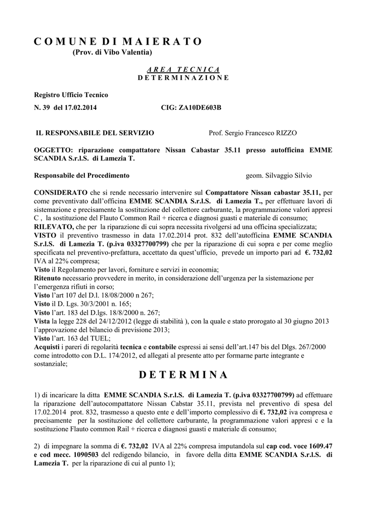 COMUNE DI MAIERATO (Prov. di Vibo Valentia) AREA TECNICA DETERMINAZIONE Registro Ufficio Tecnico N. 39 del 17.02.2014 CIG: ZA10DE603B IL RESPONSABILE DEL SERVIZIO Prof. Sergio Francesco RIZZO OGGETTO: riparazione compattatore Nissan Cabastar 35.11 presso autofficina EMME SCANDIA S.r.l.S. di Lamezia T. Responsabile del Procedimento geom. Silvaggio Silvio CONSIDERATO che si rende necessario intervenire sul Compattatore Nissan cabastar 35.11, per come preventivato dall’officina EMME SCANDIA S.r.l.S. di Lamezia T., per effettuare lavori di sistemazione e precisamente la sostituzione del collettore carburante, la programmazione valori appresi C , la sostituzione del Flauto Common Rail + ricerca e diagnosi guasti e materiale di consumo; RILEVATO, che per la riparazione di cui sopra necessita rivolgersi ad una officina specializzata; VISTO il preventivo trasmesso in data 17.02.2014 prot. 832 dell’autofficina EMME SCANDIA S.r.l.S. di Lamezia T. (p.iva 03327700799) che per la riparazione di cui sopra e per come meglio specificata nel preventivo-prefattura, accettato da quest’ufficio, prevede un importo pari ad €. 732,02 IVA al 22% compresa; Visto il Regolamento per lavori, forniture e servizi in economia; Ritenuto necessario provvedere in merito, in considerazione dell’urgenza per la sistemazione per l’emergenza rifiuti in corso; Visto l’art 107 del D.l. 18/08/2000 n 267; Visto il D. Lgs. 30/3/2001 n. 165; Visto l’art. 183 del D.lgs. 18/8/2000 n. 267; Vista la legge 228 del 24/12/2012 (legge di stabilità ), con la quale e stato prorogato al 30 giugno 2013 l’approvazione del bilancio di previsione 2013; Visto l’art. 163 del TUEL; Acquisti i pareri di regolarità tecnica e contabile espressi ai sensi dell’art.147 bis del Dlgs. 267/2000 come introdotto con D.L. 174/2012, ed allegati al presente atto per formarne parte integrante e sostanziale; DETERMINA 1) di incaricare la ditta EMME SCANDIA S.r.l.S. di Lamezia T. (p.iva 03327700799) ad effettuare la riparazione dell’autocompattatore Nissan Cabstar 35.11, prevista nel preventivo di spesa del 17.02.2014 prot. 832, trasmesso a questo ente e dell’importo complessivo di €. 732,02 iva compresa e precisamente per la sostituzione del collettore carburante, la programmazione valori appresi c e la sostituzione Flauto common Rail + ricerca e diagnosi guasti e materiale di consumo; 2) di impegnare la somma di €. 732,02 IVA al 22% compresa imputandola sul cap cod. voce 1609.47 e cod mecc. 1090503 del redigendo bilancio, in favore della ditta EMME SCANDIA S.r.l.S. di Lamezia T. per la riparazione di cui al punto 1); 3) di trasmettere copia della presente al Responsabile dell’Ufficio Ragioneria (R.U.R.) per il visto di regolarità contabile e copia per la prescritta pubblicazione all’Albo Pretorio on line e sul sito dell’Amministrazione Trasparente. Il Responsabile del Procedimento F.to geom. Silvaggio Silvio IL RESPONSABILE DEL SERVIZIO F.to Prof. Sergio Francesco RIZZO ^^^^^^^^^^^^^^^^^^^^^^^^^^^^^^^^^^^^^^^^^^^^^^^^^^^^^^^^^^^^^^^^^^^^^^^^^^^^^^^^^ Proposta di determinazione avente ad oggetto: riparazione compattatore Nissan cabastar 35.11 presso autofficina EMME SCANDIA S.r.l.S. di Lamezia T. ^^^^^^^^^^^^^^^^^^^^^^^^^^^^^^^^^^^^^^^^^^^^^^^^^^^^^^^^^^^^^^^^^ PARERE DI REGOLARITA’ TECNICA Ai sensi dell’art. 147 bis Dlgs 267/2000 così come modificato dalla legge 213/2012 si esprime parere favorevole di regolarità tecnica sulla su indicata proposta Maierato 17.02.2014 Il Responsabile del Servizio F.to Prof. Sergio Francesco Rizzo PARERE DI REGOLARITA’ CONTABILE Ai sensi dell’art. 147 bis Dlgs 267/2000 così come modificato dalla legge 213/2012 si esprime parere favorevole di regolarità contabile sulla proposta su indicata. Maierato 17.02.2014 Il Responsabile del Servizio Economico Finanziario F.F. F.to Serrao Vincenzino C E R T I F I C A T O di P U B B L I C A Z I O N E N° ___________ Dal ______.02.2014 al ______.03.2014 Copia della presente determinazione viene pubblicata mediante affissione all’Albo Pretorio Comunale in data odierna per rimanervi quindici giorni consecutivi. Maierato lì _____.02.2014 L’INCARICATO COMUNALE