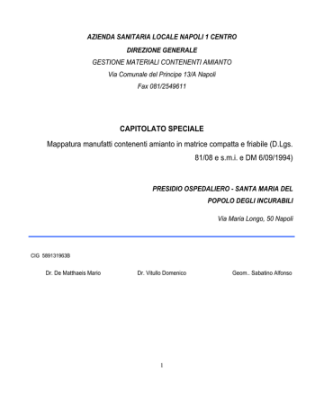 AZIENDA SANITARIA LOCALE NAPOLI 1 CENTRO DIREZIONE GENERALE GESTIONE MATERIALI CONTENENTI AMIANTO Via Comunale del Principe 13/A Napoli Fax 081/2549611 CAPITOLATO SPECIALE Mappatura manufatti contenenti amianto in matrice compatta e friabile (D.Lgs. 81/08 e s.m.i. e DM 6/09/1994) PRESIDIO OSPEDALIERO - SANTA MARIA DEL POPOLO DEGLI INCURABILI Via Maria Longo, 50 Napoli CIG 589131963B Dr. De Matthaeis Mario Dr. Vitullo Domenico 1 Geom.. Sabatino Alfonso ART. 1 – NORME PRELIMINARI Il presente Capitolato stabilisce norme, prescrizioni ed oneri generali e determina le condizioni tecniche normali per l’esecuzione e la valutazione dei lavori e delle relative provviste. Tutti i lavori pertanto verranno eseguiti con la piena osservanza sia delle prescrizioni particolari che delle norme. ART. 2 – OGGETTO DELL’APPALTO L’appalto riguarda la rimozione e bonifica di manufatti di amianto e contestuale sostituzione di materiale presente presso il PO Santa Maria del Popolo degli Incurabili, sito in Via Maria Longo n. 50 Napoli. Sono compresi nell’appalto tutte le prestazioni, i mezzi d’opera, le attrezzature e i materiali necessari per dare il lavoro completamente compiuto e secondo le condizioni stabilite dal capitolato speciale d’appalto, con le caratteristiche tecniche, qualitative e quantitative previste dallo stesso di cui l’appaltatore dichiara di aver preso completa ed esatta conoscenza. L’esecuzione del servizio è sempre e comunque effettuata secondo le regole dell’arte e l’appaltatore deve conformarsi alla massima diligenza nell’adempimento dei propri obblighi. Trova sempre applicazione l’articolo 1374 del codice civile. ART 3 - DESCRIZIONE DEI LAVORI. L’appalto consiste nella rimozione – bonifica – trasporto a discarica di manufatti contenenti amianto, con contestuale sostituzione di idoneo materiale in PVC e coibentante. Le opere saranno realizzate in conformità con le prescrizioni del presente Capitolato. Il dettaglio delle opere da realizzare è contenuto nell’allegato Computo Metrico Estimativo. La tipologia dei lavori prevede: 1. Redazione di apposito piano di lavoro (art. 256 comma 2, D.lgs. 9 aprile 2008, n.81). Il piano, in particolare, prevede e contiene informazioni sui seguenti punti: a) rimozione dei manufatti di amianto prima dell'applicazione delle tecniche di demolizione, a meno che tale rimozione non possa costituire per i lavoratori un rischio maggiore di quello rappresentato dal fatto che l'amianto o i materiali contenenti amianto vengano lasciati sul posto; b) fornitura ai lavoratori di idonei dispositivi di protezione individuale; c) verifica dell'assenza di rischi dovuti all'esposizione all'amianto sul luogo di lavoro, al termine dei lavori di demolizione o di rimozione dell'amianto; d) adeguate misure per la protezione e la decontaminazione del personale incaricato dei lavori; e) adeguate misure per la protezione dei terzi e per la raccolta e lo smaltimento dei materiali; 2 f) adozione, nel caso in cui sia previsto il superamento dei valori limite di cui all'articolo 254 del D. Lgs. n. 81/2008 e delle misure di cui all'articolo 255 del D. Lgs. n. 81/2008, adattandole alle particolari esigenze del lavoro specifico; g) natura dei lavori, data di inizio e loro durata presumibile; h) luogo ove i lavori verranno effettuati; i) tecniche lavorative adottate per la rimozione dell'amianto; l) caratteristiche delle attrezzature o dispositivi che si intendono utilizzare per attuare quanto previsto dalle lettere d) ed e). Il Piano di Lavoro sarà inviato all'Organo di Vigilanza, almeno 30 giorni prima dell'inizio dei lavori. Se entro il periodo di cui al precedente capoverso l’organo di vigilanza non formula motivata richiesta di integrazione o modifica del piano di lavoro e non rilascia prescrizione operativa, il datore di lavoro può eseguire i lavori. L’obbligo del preavviso di trenta giorni prima dell’inizio dei lavori non si applica nei casi di urgenza. In tale ultima ipotesi, oltre alla data di inizio, deve essere fornita dal datore di lavoro indicazione dell’orario di inizio delle attività. 2. Delimitazione dell’area di cantiere dedicata allo stoccaggio temporaneo dei materiali trattati e rimossi. Installazione dell'unità di decontaminazione, del deposito dei D.P.I. da impiegarsi da parte del personale addetto allo smaltimento, e quant'altro previsto dalla vigente normativa. I trasporti di qualunque genere fino al cantiere e entro l’ambito del medesimo, lo scarico, il tiro in alto, il calo in basso e lo spostamento dei materiali pertinenti alle opere oggetto dell’appalto; 3. Campionamenti ambientali per il rilevamento delle fibre di amianto aerodisperse prima, durante e dopo gli interventi per le aree cantierizzate e relative alla rimozione di manufatti in matrice friabile; 4. Confezionamento, carico e trasporto con mezzo autorizzato (eventualmente conto terzi) dei rifiuti contenenti amianto; 5. Conferimento a discarica autorizzata; 6. Bonifica finale dell’area, consistente nella raccolta dei frammenti a terra, confezionamento, trasporto con mezzo autorizzato e smaltimento del terreno in impianto autorizzato; 7. Rilascio della documentazione prevista dalla normativa vigente: certificati di analisi di caratterizzazione del rifiuto e campionamenti ambientali, copia del formulario di avvenuto smaltimento del rifiuto timbrato e firmato dall’impianto ricettore. Eventuali situazioni impreviste, che dovessero sopraggiungere nel corso delle attività, verranno condivise con la Direzione Lavori della Stazione Appaltante e valorizzate sulla base delle corrispondenti voci e tariffe indicate nel computo metrico estimativo allegato, coerentemente alla percentuale di ribasso aggiudicata. Inoltre, le attività da realizzare per la rimozione, bonifica e sostituzione dei manufatti saranno eseguite secondo le indicazioni e la disponibilità fornita dalla Stazione Appaltante, intendendo quindi, oltre ai giorni lavorativi, anche eventuali g