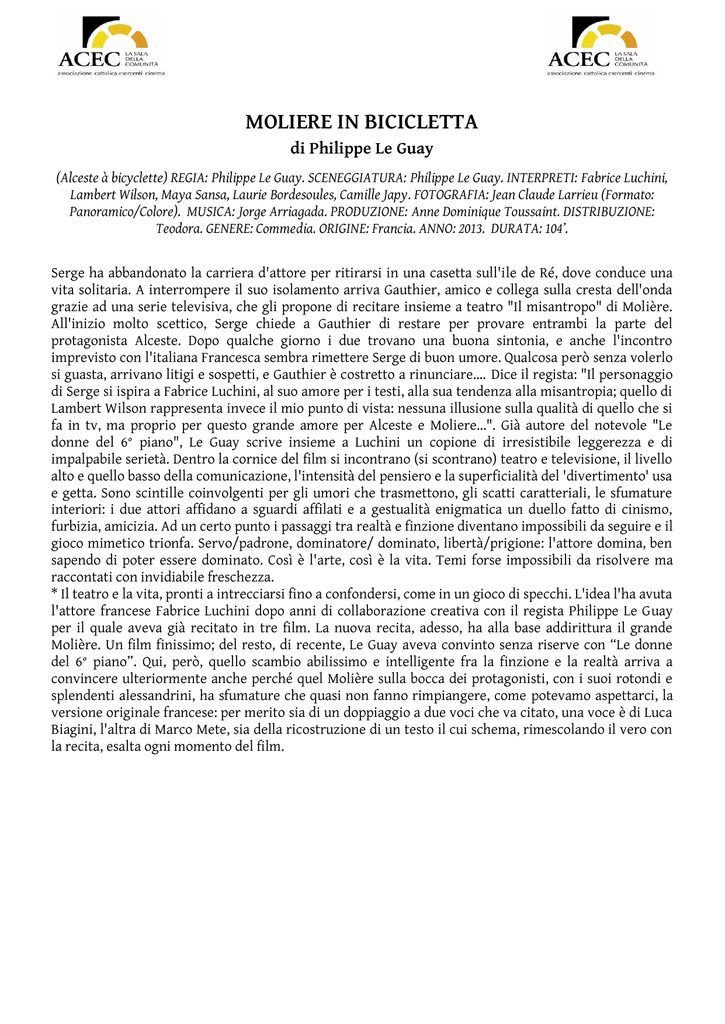MOLIERE IN BICICLETTA di Philippe Le Guay (Alceste à bicyclette) REGIA: Philippe Le Guay. SCENEGGIATURA: Philippe Le Guay. INTERPRETI: Fabrice Luchini, Lambert Wilson, Maya Sansa, Laurie Bordesoules, Camille Japy. FOTOGRAFIA: Jean Claude Larrieu (Formato: Panoramico/Colore). MUSICA: Jorge Arriagada. PRODUZIONE: Anne Dominique Toussaint. DISTRIBUZIONE: Teodora. GENERE: Commedia. ORIGINE: Francia. ANNO: 2013. DURATA: 104’. Serge ha abbandonato la carriera d'attore per ritirarsi in una casetta sull'ile de Ré, dove conduce una vita solitaria. A interrompere il suo isolamento arriva Gauthier, amico e collega sulla cresta dell'onda grazie ad una serie televisiva, che gli propone di recitare insieme a teatro "Il misantropo" di Molière. All'inizio molto scettico, Serge chiede a Gauthier di restare per provare entrambi la parte del protagonista Alceste. Dopo qualche giorno i due trovano una buona sintonia, e anche l'incontro imprevisto con l'italiana Francesca sembra rimettere Serge di buon umore. Qualcosa però senza volerlo si guasta, arrivano litigi e sospetti, e Gauthier è costretto a rinunciare…. Dice il regista: "Il personaggio di Serge si ispira a Fabrice Luchini, al suo amore per i testi, alla sua tendenza alla misantropia; quello di Lambert Wilson rappresenta invece il mio punto di vista: nessuna illusione sulla qualità di quello che si fa in tv, ma proprio per questo grande amore per Alceste e Moliere...". Già autore del notevole "Le donne del 6° piano", Le Guay scrive insieme a Luchini un copione di irresistibile leggerezza e di impalpabile serietà. Dentro la cornice del film si incontrano (si scontrano) teatro e televisione, il livello alto e quello basso della comunicazione, l'intensità del pensiero e la superficialità del 'divertimento' usa e getta. Sono scintille coinvolgenti per gli umori che trasmettono, gli scatti caratteriali, le sfumature interiori: i due attori affidano a sguardi affilati e a gestualità enigmatica un duello fatto di cinismo, furbizia, amicizia. Ad un certo punto i passaggi tra realtà e finzione diventano impossibili da seguire e il gioco mimetico trionfa. Servo/padrone, dominatore/ dominato, libertà/prigione: l'attore domina, ben sapendo di poter essere dominato. Così è l'arte, così è la vita. Temi forse impossibili da risolvere ma raccontati con invidiabile freschezza. * Il teatro e la vita, pronti a intrecciarsi fino a confondersi, come in un gioco di specchi. L'idea l'ha avuta l'attore francese Fabrice Luchini dopo anni di collaborazione creativa con il regista Philippe Le Guay per il quale aveva già recitato in tre film. La nuova recita, adesso, ha alla base addirittura il grande Molière. Un film finissimo; del resto, di recente, Le Guay aveva convinto senza riserve con “Le donne del 6° piano”. Qui, però, quello scambio abilissimo e intelligente fra la finzione e la realtà arriva a convincere ulteriormente anche perché quel Molière sulla bocca dei protagonisti, con i suoi rotondi e splendenti alessandrini, ha sfumature che quasi non fanno rimpiangere, come potevamo aspettarci, la versione originale francese: per merito sia di un doppiaggio a due voci che va citato, una voce è di Luca Biagini, l'altra di Marco Mete, sia della ricostruzione di un testo il cui schema, rimescolando il vero con la recita, esalta ogni momento del film.