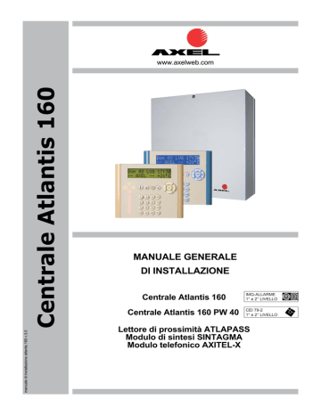 manuale di installazione atlantis 160 v.3.0 Centrale Atlantis 160 www.axelweb.com MANUALE GENERALE DI INSTALLAZIONE Centrale Atlantis 160 IMQ-ALLARME 1° e 2° LIVELLO Centrale Atlantis 160 PW 40 CEI 79-2 1° e 2° LIVELLO Lettore di prossimità ATLAPASS Modulo di sintesi SINTAGMA Modulo telefonico AXITEL-X PT 1 taratura di fabbrica NON USATI 2 L 230V~ N 230V~ TERRA NON USATO MODULO DI SINTESI VOCALE MOD. SINTAGMA RESET RS485 n°1 RS485 n°3 NON USATO COLLEGAMENTO ATLA-LINK ATLA-LAN COLLEGAMENTO ATLA-PRINT COLLEGAMENTO PER TELEFONICO DIGITALE MOD. AXITEL USCITE O.C. S1 ESCLUSIONE TAMPER ANTIAPERTURA ESCLUSIONE TAMPER ANTISTRAPPO S2 COLLEGAMENTO GENERALE ATLANTIS 160 SCHEDA RELE’ MOD. AXIREL AXEL Atlantis 160 - Atlantis 160 PW40 NON USATI 3 L 230V~ N 230V~ TERRA NON USATO MODULO DI SINTESI VOCALE MOD. SINTAGMA RESET RS485 n°1 RS485 n°3 NON USATO COLLEGAMENTO ATLA-LINK ATLA-LAN COLLEGAMENTO ATLA-PRINT COLLEGAMENTO PER TELEFONICO DIGITALE MOD. AXITEL USCITE O.C. S1 ESCLUSIONE TAMPER ANTIAPERTURA ESCLUSIONE TAMPER ANTISTRAPPO S2 COLLEGAMENTO GENERALE ATLANTIS 160 - PW 40 Atlantis 160 - Atlantis 160 PW40 AXEL AXEL Atlantis 160 - Atlantis 160 PW40 CENTRALE ATLANTIS 160 - ATLANTIS 160 PW40 Centrale a microprocessore a 8 linee di ingresso, espandibili a 160, gestione con tastiera VENICE, X-PAD e con lettore di prossimità ATLAREAD, predisposta al collegamento con combinatore telefonico digitale e all’inserimento del modulo di sintesivocale SINTAGMA e al modulo GSM mod. ATLACALL. La tastiera a display con retroilluminazione permette un dialogo diretto e facilitato da parte dell'utente per tutte le funzioni di gestione dell'impianto. Il combinatore telefonico può gestire comunicazioni digitali di tutti gli eventi, sia di allarme che tecnici, verso computer ecentri di controllo; permette, inoltre, il collegamento interattivo dell’installatore con la centrale per la completa telegestione di tutte le funzioni. La scheda supplementare di sintesi vocale permette di inviare in fonia tutte le comunicazioni sia di allarme che tecniche, combinando messaggi preregistrati. La programmazione può avvenire direttamente sulla centrale utilizzando i menù facilitati della tastiera oppure con collegamento bidirezionale attraverso la linea telefonica o in linea diretta con computer remoto dotato di software OBERON. Caratteristiche tecniche Linee di ingresso w n° 8, espandibili a 160, a singolo o doppio bilanciamento con riconoscimento del mascheramento del sensore w n° 1 linea di protezione di antimanomissione Gruppi w ingressi associabili a n° 8 GRUPPI di appartenenza per ottenere la gestione di 8 diversi impianti Tastiera w w w w Lettori: w n° 32 lettori di prossimità mod. ATLAREAD collegabili su seriale RS 485 dedicata fino a 600 metri di distanza Uscite w n° 2 relè di allarme programmabili separatamente di cui uno a 2 scambi a sicurezza positiva w n° 8 uscite attive O.C. programmabili Moduli ingressi w modulo ingressi AMI-4 e AMI-8 rispettivamente a 4 e 8 linee di ingresso a singolo o doppio bilanciamento con rico- compatibile con modelli X-PAD e VENICE. a display con retroilluminazione fino a 16 collegabili su due seriali RS 485 fino a 600 metri di distanza per ciascun ramo segnalazione diretta mediante led dello stato delle alimentazioni, dello stato dell’impianto e della prova circuito noscimento del mascheramento del sensore w modulo AMI-816 RADIO a 8-16 zone a singolo o doppio bilanciamento con gestione della supervisione del sensore, programmabili con le stesse modalità delle zone di base Moduli uscite w modulo uscite ATI-4 a 4 uscite con relè a scambi liberi da tensione programmabili w modulo uscite ATI-8 a 8 uscite Open Collector programmabili Macro w n° 20 macroistruzioni a 10 comandi ciascuna, attivabili da: • • • sbilanciamento e allarme di zona, evento di sistema programmatore orario funzione RFA utente Codici w n° 100 Codici Utente con limitazione programmabile delle funzioni w n° 100 Codici di Emergenza w n° 2 Codici Installatore Accensioni w w w w Orologio w orologio settimanale a 64 operazioni giornaliere con gestione delle festività w possibilità di accensioni e spegnimenti, inibizione codici e tastiere, attivazioni di macro w attivazione a tempo ed a stato di uscite attive Telefonico w n° 24 numeri di telefono per comunicazioni con protocolli: • AXIA per comunicazioni verso computer con modem Hayes compatibile • SIA per comunicazioni verso ricevitori SIA standard • CONTACT ID per comunicazioni verso ricevitori CONTACT standard w modulo di sintesi vocale SINTAGMA con protocollo VOXIA per comunicazioni automatiche che consente l’invio di n° 3 modalità di accensione per ogni Gruppo possibilità di attivazioni esterne con lettore di prossimità in 3 modalità per ogni Gruppo da Telegestione Utente, guidata da menù vocale o da SMS. da programmatore orario settimanale nelle 3 modalità per ogni Gruppo tutte le segnalazioni di allarme e di controllo della centrale ad Utenti privati w modulo per comunicazioni ATLACALL per comunicazioni automatiche che consente l’invio su rete GSM in tutti i protocolli e mediante messaggi SMS di tutte le segnalazioni di allarme e di controllo della centrale Programmazione w da tastiera con menù semplificati con gestione degli errori w da computer con collegamento interattivo con software OBERON su Windows XP e Vista. Alimentatore w in Atlantis 160: separato da 1,5A effettivi totali w in Atlantis 160 PW40: separato da 4A effettivi totali • segnalazione della mancanza della batteria, di livello insufficiente della carica della batteria e della mancanza della tensione di rete Cond. ambientali w +5°C .. +40°C Contenitore w Dimensioni: 345 x 435 x 125 mm. - Peso: 4,5 Kg. Omologazione w Atlantis 160: • • CEI 79/2: 1° e 2° livello (con kit antistrappo opzionale) IMQ ALLARME: 1° livello - 2° livello con kit antistrappo (a richiesta) w Atlantis 160 PW40: • CEI 79/2: 1° e 2° livello (con kit antistrappo opzionale) 