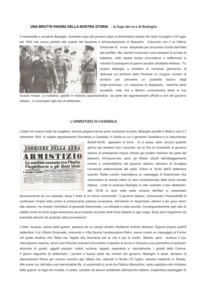 UNA BRUTTA PAGINA DELLA NOSTRA STORIA : la fuga del re e di Badoglio Il maresciallo e senatore Badoglio, diventato capo del governo dopo la drammatica seduta del Gran Consiglio il 25 luglio del 1943 che aveva portato alla caduta del fascismo e all’esautorazione di Mussolini, d’accordo con il re Vittorio Emanuele III, si era adoperato per procurare l’uscita dell’Italia dal conflitto. Ma, mentre incaricava i suoi emissari di avviare le trattative, nello stesso tempo provvedeva a riaffermare la volontà di proseguire la guerra accanto all’alleato tedesco. Fu proprio Badoglio a chiedere al comando germanico di dislocare sul territorio della Penisola un congruo numero di divisioni per prevenire un possibile sbarco degli anglo-americani. Un campione di doppiezza, neanche tanto avveduto, visto che a Berlino conoscevano bene le sue incaute mosse. Le trattative, gestite in maniera approssimativa da parte dei rappresentanti ufficiali e non del governo italiano , si conclusero agli inizi di settembre. L’ARMISTIZIO DI CASSIBILE L’Italia non aveva molto da scegliere: doveva piegarsi senza porre condizioni di sorta. Badoglio accettò il diktat e così il 3 settembre 1943 fu siglato segretamente l’Armistizio a Cassibile, in Sicilia su cui il generale Castellano e lo statunitense Bedell-Smith apposero le firme . Ci si prese, però, ancora qualche giorno per rendere noto l’accordo: ciò al fine di consentire al governo italiano di predisporre misure idonee per evitare ritorsioni da parte dei tedeschi. All’improvviso, però, gli Alleati, stizziti dall’atteggiamento incerto e contraddittorio del governo italiano, decisero di divulgare l’avvenuta sottoscrizione del patto. Erano le 18.45 dell’8 settembre quando ‘Radio Londra’ trasmetteva un messaggio di Eisenhower che annunciava al mondo intero la resa incondizionata delle forze armate italiane. Colto di sorpresa Badoglio si vide costretto a fare altrettanto: alle 19.30 si recò nella sede romana dell’Eiar e, presentato laconicamente da uno speaker, lesse il testo di un breve comunicato: “Il governo italiano, riconosciuta l’impossibilità di continuare l’impari lotta contro la schiacciante potenza avversaria, nell’intento di risparmiare ulteriori e più gravi danni alla nazione, ha chiesto l’armistizio al generale Eisenhower. La richiesta è stata accolta. Conseguentemente ogni atto di ostilità contro le forze anglo-americane deve cessare da parte delle forze italiane in ogni luogo. Esse però reagiranno ad eventuali attacchi da qualsiasi altra provenienza”. L’Italia, dunque, usciva dalla guerra passava da un campo all’altro ribaltando antiche alleanze. Eppure proprio quell’8 settembre, il re Vittorio Emanuele, ricevendo a Villa Savoia l’ambasciatore Rahn, aveva inviato un messaggio al Fuhrer nel quale ribadiva che l’Italia era “legata alla Germania per la vita e per la morte”. Mentre, però, recitava il suo menzognero copione, alcuni suoi fiduciari avevano provveduto a spedire al sicuro in Svizzera una quarantina di autocarri stracolmi di quadri, oggetti preziosi, mobili, sculture, tappeti, argenterie e, naturalmente, i gioielli della Corona. Il giorno seguente (9 settembre) i sovrani e buona parte dei ministri del governo, Badoglio in testa, decisero di abbandonare Roma per correre incontro agli Alleati che, sbarcati in Sicilia (10 luglio), stavano risalendo lo Stivale. Alle prime luci dell’alba una interminabile fila di automobili si avviò da Palazzo Baracchini, sede capitolina del ministero della guerra: la fuga era iniziata. Il corteo, scortato da alcune autoblindo dell’esercito italiano, trasportava passeggeri di rango assai elevato: il re Vittorio Emanuele III, la regina, il ministro della Real Casa Acquarone, il maresciallo Badoglio, Umberto di Savoia, i generali Ambrosio e Roatta, rispettivamente capo di Stato Maggiore generale e capo di Stato Maggiore dell’esercito, il ministro della marina De Courten ed altri numerosi militari e funzionari governativi. LA FUGA Badoglio e De Courten , dopo aver fissato per la mezzanotte il ritrovo presso il molo di Ortona, nel pomeriggio si diressero all’aeroporto di Pescara dove Badoglio e il Principe Umberto discussero animatamente insieme agli altri fuggiaschi , circa la scelta dei mezzi da utilizzare per raggiungere il sud dell'Italia : aerei o nave?. Ma, nonostante la presenza di diversi aerei il principe Ruspoli con il Comandante dell'aeroporto e con il portavoce dei piloti , comunicò al Ministro della Real Casa , sia pure a malincuore , che con quei mezzi disponibili, tutti leggeri e nessuno da trasporto , non se la sentivano di assumersi nessuna responsabilità in quanto non c' erano apparecchi idonei a trasportare passeggeri sia pure.. reali. In pratica si trattò di un diniego bello e buono da parte degli aviatori che non mutò minimante neppure di fronte all'invito loro rivolto personalmente da Badoglio e dal Ministro dell'aeronautica Sandali. . Mossero poi alla volta di Pescara dove giunsero alle 21 qui però, la popolazione dimostrò di gradire molto poco la precipitosa fuga dei reali . Poiché mancavano diverse ore all’imbarco i reali e i loro dignitari si recarono a Crecchio dove furono ospiti del Duca di Bovino Giovanni De Riseis (proprietario dell’omonima villa a Pescara) e della duchessa Antonia Gaetani nel loro castello nobiliare . Durante il pranzo e nelle ore successive trascorse dai Bovino si ebbe modo di parlare di ciò che stava accadendo in Italia e della precipitosa partenza. Fu proprio la duchessa Gaetani , pur essendo molto legata ai Savoia ad introdurre l’argomento facendo osservare loro, anche se con cautela e deferenza , che si trattava molto probabilmente di una scelta sbagliata, anzi la nobildonna si fece in seguito più ardita suggerendo a Sua Maestà imperiale di fare marcia indietro , secondo alcuni storici, su suggerimento del Principe Umberto che era notoriamente contrario all’abbandono del Quirinale .