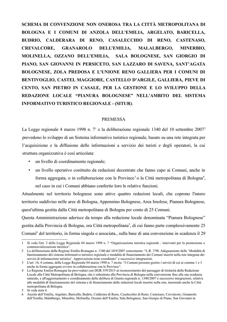 SCHEMA DI CONVENZIONE NON ONEROSA TRA LA CITTÀ METROPOLITANA DI BOLOGNA E I COMUNI DI ANZOLA DELL'EMILIA, ARGELATO, BARICELLA, BUDRIO, CALDERARA DI CREVALCORE, RENO, GRANAROLO CASALECCHIO DELL’EMILIA, MOLINELLA, OZZANO DELL’EMILIA, DI RENO, MALALBERGO, CASTENASO, MINERBIO, SALA BOLOGNESE, SAN GIORGIO DI PIANO, SAN GIOVANNI IN PERSICETO, SAN LAZZARO DI SAVENA, SANT’AGATA BOLOGNESE, ZOLA PREDOSA E L'UNIONE RENO GALLIERA PER I COMUNI DI BENTIVOGLIO, CASTEL MAGGIORE, CASTELLO D'ARGILE, GALLIERA, PIEVE DI CENTO, SAN PIETRO IN CASALE, PER LA GESTIONE E LO SVILUPPO DELLA REDAZIONE LOCALE “PIANURA BOLOGNESE” NELL'AMBITO DEL SISTEMA INFORMATIVO TURISTICO REGIONALE - (SITUR). PREMESSA La Legge regionale 4 marzo 1998 n. 71 e la deliberazione regionale 1340 del 10 settembre 20072 prevedono lo sviluppo di un Sistema informativo turistico regionale, basato su una rete integrata per l’acquisizione e la diffusione delle informazioni a servizio dei turisti e degli operatori, la cui struttura organizzativa è così articolata: • un livello di coordinamento regionale; • un livello operativo costituito da redazioni decentrate che fanno capo ai Comuni, anche in forma aggregata, o in collaborazione con le Province 3 o la Città metropolitana di Bologna 4, nel caso in cui i Comuni abbiano conferito loro le relative funzioni. Attualmente nel territorio bolognese sono attive quattro redazioni locali, che coprono l'intero territorio suddiviso nelle aree di Bologna, Appennino Bolognese, Area Imolese, Pianura Bolognese, quest'ultima gestita dalla Città metropolitana di Bologna per conto di 25 Comuni. Questa Amministrazione aderisce da tempo alla redazione locale denominata “Pianura Bolognese” gestita dalla Provincia di Bologna, ora Città metropolitana5, di cui fanno parte complessivamente 25 Comuni6 del territorio, in forma singola o associata., sulla base di una convenzione in scadenza il 29 1 2 3 4 5 6 Si veda l'art. 2 della Legge Regionale 04 marzo 1998 n. 7 “Organizzazione turistica regionale - interventi per la promozione e commercializzazione turistica”. La deliberazione della Regione Emilia-Romagna n. 1340 del 10/9/2007 concernente: “L.R. 7/98. Adeguamento delle ‘Modalità di funzionamento del sistema informativo turistico regionale e modalità di finanziamento dei Comuni inseriti nella rete integrata dei servizi di informazione turistica’. Approvazione testo coordinato” e successive integrazioni. L'art. 14, 4 comma, della Legge Regionale 04 marzo 1998 n. 7 recita: “I Comuni possono gestire i servizi di cui ai comma 1 e 3 anche in forma aggregata ovvero in collaborazione con le Province”. La Regione Emilia-Romagna ha provveduto con DGR 359/2015 al riconoscimento del passaggio di titolarità della Redazione Locale alla Città Metropolitana di Bologna, che è subentrata alla Provincia di Bologna nella convenzione fino alla sua scadenza naturale, e all'aggiornamento e coordinamento della delibera di Giunta regionale n. 1340/2007 e successive integrazioni, relativa alle modalità di funzionamento del sistema e di finanziamento delle redazioni locali inserite nella rete, inserendo anche la Città metropolitana di Bologna. Si veda nota 4. Anzola dell’Emilia, Argelato, Baricella, Budrio, Calderara di Reno, Casalecchio di Reno, Castenaso, Crevalcore, Granarolo dell’Emilia, Malalbergo, Minerbio, Molinella, Ozzano dell’Emilia, Sala Bolognese, San Giorgio di Piano, San Giovanni in dicembre 20157. L'adesione alla redazione locale di pianura assicura, senza spese a carico di questa Amministrazione, il mantenimento e lo sviluppo di un sistema di informazione turistico locale, conforme alle indicazioni regionali8, in grado di fornire ampia visibilità alle risorse artisticoculturali e ambientali, ai luoghi e agli appuntamenti del territorio e pertanto, si ritiene opportuno procedere alla prosecuzione del rapporto convenzionale, al fine di assicurare la continuità dell'attività TUTTO CIÒ PREMESSO, la Città metropolitana di Bologna e: i Comuni di Anzola dell’Emilia, Argelato, Baricella, Budrio, Calderara di Reno, Casalecchio di Reno, Castenaso, Crevalcore, Granarolo dell’Emilia, Malalbergo, Minerbio, Molinella, Ozzano dell’Emilia, Sala Bolognese, San Giorgio di Piano, San Giovanni in Persiceto, San Lazzaro di Savena, Sant’Agata Bolognese, Zola Predosa, nonché l'Unione Reno Galliera per i Comuni di Bentivoglio, Castel Maggiore, Castello d'Argile, Galliera, Pieve di Cento, San Pietro in Casale, CONVENGONO QUANTO SEGUE: Art. 1 - Oggetto della convenzione La presente convenzione disciplina i rapporti per la gestione della redazione locale “Pianura Bolognese” afferente al Sistema informativo regionale per il turista (SITur), ai fini dell’acquisizione e la diffusione di informazioni a carattere turistico, fra la Città metropolitana di Bologna e i Comuni indicati, in forma singola o associata. Art. 2 - Impegni della Città metropolitana di Bologna La Città metropolitana di Bologna svolge il ruolo di redazione locale nei confronti della Regione Emilia-Romagna a favore dei Comuni/Unione di Comuni sottoscrittori. A tal fine si impegna a: • tenere i rapporti con la Regione Emilia-Romagna per il coordinamento del sistema garantendo qualità, completezza tecnica ed efficacia comunicativa dei contenuti; • 7 8 mantenere e sviluppare il sistema di informazione turistico locale conformemente alle Persiceto, San Lazzaro di Savena, Sant’Agata Bolognese, Zola Predosa, Unione Reno Galliera per i Comuni di Bentivoglio, Castel Maggiore, Castello d'Argile, Galliera, Pieve di Cento, San Pietro in Casale. La convenzione (PG 20189 del 17/02/2015) ha allineato la data di scadenza della precedente convenzione (PG 436996/2009 della Provincia di Bologna), con la convenzione tra la Regione Emilia-Romagna e la Città metropolitana in scadenza al 29 dicembre 2015. Si veda nota 2. indicazioni regionali9 facendosi carico della gestione della redazione; • collaborare con la redazione del 