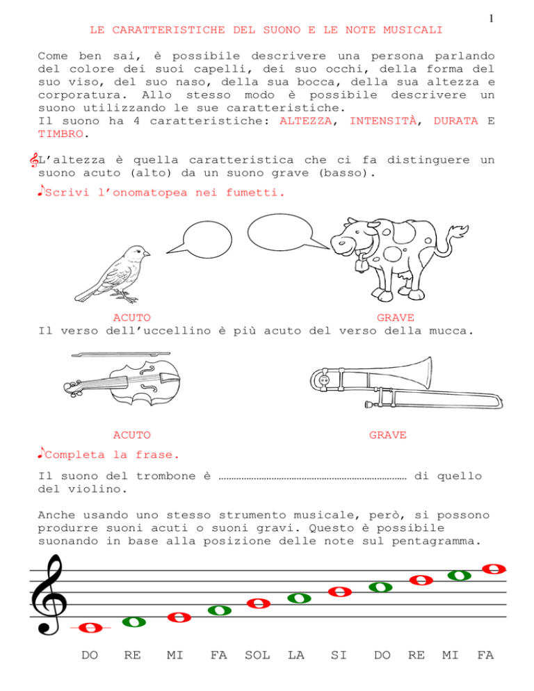 1 LE CARATTERISTICHE DEL SUONO E LE NOTE MUSICALI Come ben sai, è possibile descrivere una persona parlando del colore dei suoi capelli, dei suo occhi, della forma del suo viso, del suo naso, della sua bocca, della sua altezza e corporatura. Allo stesso modo è possibile descrivere un suono utilizzando le sue caratteristiche. Il suono ha 4 caratteristiche: ALTEZZA, INTENSITÀ, DURATA E TIMBRO. L’altezza è quella caratteristica che ci fa distinguere un suono acuto (alto) da un suono grave (basso). eScrivi l’onomatopea nei fumetti. ACUTO GRAVE Il verso dell’uccellino è più acuto del verso della mucca. ACUTO GRAVE eCompleta la frase. Il suono del trombone è ………………………………………………………………… di quello del violino. Anche usando uno stesso strumento musicale, però, si possono produrre suoni acuti o suoni gravi. Questo è possibile suonando in base alla posizione delle note sul pentagramma. DO RE MI FA SOL LA SI DO RE MI FA 2 Come in una scala, mano a mano che si sale dal basso verso l’alto i suoni si fanno più acuti. Viceversa, scendendo dall’alto verso il basso i suoni si fanno più gravi. L’intensità è quella caratteristica del suono che ci fa riconoscere un suono forte da uno debole (piano). eScrivi l’onomatopea nei fumetti. FORTE PIANO VERO O FALSO? 1. Il rombo di un aereo è più forte del fruscio di 4.La voce del papà è più acuta di quella della una foglia. 2. Il fischio del treno è più grave della sirena mamma. 5. Il suono del tamburo è più debole di quello della nave. 3. Il suono della batteria è più forte di quello del della chitarra. 6. La voce di un bambino è più acuta di quella del triangolo. nonno. La durata del suono è la caratteristica che ti permette di distinguere i suoni lunghi da quelli corti. In musica, per rappresentare la durata si da una forma diversa alle note, usando le figure di valore. SUONO LUNGO SUONO MEDIO SUONO CORTO SUONO CORTISSIMO 3 Per dare un ordine alle note e permettere al musicista di leggerle e suonarle più facilmente, il pentagramma viene diviso con stanghette verticali; lo spazio tra una stanghetta e l’altra si chiama battuta. All’inizio del pentagramma si trova un numero che indica quanti tempi devono essere contenuti in ogni battuta. 4/4 1° tempo 2° 3° 4° 1° e 2° 3° 4° Attento! La battuta è come una scatola molto ordinata: non può contenere un numero di tempi né inferiore né superiore a quello indicato all’inizio del pentagramma. eSistema le stanghette. 4/4 eSistema le stanghette. 4/4 Il timbro è la caratteristica del suono che ci fa distinguere uno strumento musicale da un altro, una voce da un’altra. Prova a giocare con i tuoi compagni così: uno di voi si benda, un altro parla e dice ad alta voce <<Anche se tu sei bendato, indovina chi ha parlato!>>. Il bambino bendato deve indovinare il nome del bambino che ha parlato; se indovina, il bambino che ha parlato prende il suo posto, altrimenti egli ascolta la voce di un altro compagno. Lo stesso gioco si può fare riconoscendo gli strumenti ritmici e melodici che hai a scuola in base al loro suono.