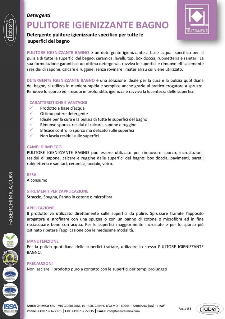 Detergenti PULITORE IGIENIZZANTE BAGNO Detergente pulitore igienizzante specifico per tutte le superfici del bagno PULITORE IGIENIZZANTE BAGNO è un detergente igienizzante a base acqua specifico per la pulizia di tutte le superfici del bagno: ceramica, lavelli, top, box doccia, rubinetteria e sanitari. La sua formulazione garantisce un ottima detergenza, ravviva le superfici e rimuove efficacemente i residui di sapone, calcare e ruggine, senza rovinare i materiali su cui viene utilizzato. DETERGENTE IGIENIZZANTE BAGNO è una soluzione ideale per la cura e la pulizia quotidiana del bagno, si utilizza in maniera rapida e semplice anche grazie al pratico erogatore a spruzzo. Rimuove lo sporco ed i residui in profondità, igienizza e ravviva la lucentezza delle superfici. CARATTERISTICHE E VANTAGGI Prodotto a base d’acqua Ottimo potere detergente Ideale per la cura e la pulizia di tutte le superfici del bagno Rimuove sporco, residui di calcare, sapone e ruggine Efficace contro lo sporco ma delicato sulle superfici Non lascia residui sulle superfici CAMPI D’IMPIEGO PULITORE IGIENIZZANTE BAGNO può essere utilizzato per rimuovere sporco, incrostazioni, residui di sapone, calcare e ruggine dalle superfici del bagno: box doccia, pavimenti, pareti, rubinetteria e sanitari, ceramica, acciaio, vetro. RESA A consumo STRUMENTI PER L’APPLICAZIONE Straccio, Spugna, Panno in cotone o microfibra APPLICAZIONE: Il prodotto va utilizzato direttamente sulle superfici da pulire. Spruzzare tramite l’apposito erogatore e strofinare con una spugna o con un panno di cotone o microfibra ed in fine risciacquare bene con acqua. Per le superfici maggiormente incrostate e per lo sporco più ostinato ripetere l’applicazione con le medesime modalità. MANUTENZIONE Per la pulizia quotidiana delle superfici trattate, utilizzare lo stesso PULITORE IGIENIZZANTE BAGNO. PRECAUZIONI Non lasciare il prodotto puro a contatto con le superfici per tempi prolungati FABER CHIMICA SRL – VIA G.CERESANI, 10 – LOC.CAMPO D’OLMO – 60044 – FABRIANO (AN) – ITALY Phone: +39 0732 627178 | Fax: +39 0732 22935 | Email: [email protected] Pag. 1 di 2 Detergenti PULITORE IGIENIZZANTE BAGNO- Detergente pulitore igienizzante specifico per tutte le superfici del bagno DATI FISICO-TECNICI Aspetto: Colore: Odore: pH: Peso specifico a 20°C: Biodegradabilità Liquido Rosa Caratteristico 11,0 ± 0,5 1010 ± 10 g/l > 90% STOCCAGGIO Conservare i recipienti ben chiusi ed in luogo fresco e asciutto. PERIODO DI CONSERVAZIONE 36 mesi nelle confezioni originali sigillate e conservate in luogo fresco e asciutto. CONFEZIONI Confezionato in flaconi da 750 ml con erogatore spray. IDENTIFICAZIONE DEI PERICOLI H319 Provoca gravi ustioni cutanee e gravi lesioni oculari. P264 Lavare accuratamente dopo l'uso. P280 Indossare guanti / indumenti protettivi / Proteggere gli occhi / il viso. P305 + P351 + IN CASO DI CONTATTO CON GLI OCCHI: sciacquare accuratamente per P338 parecchi minuti. Togliere le eventuali lenti a contatto se è agevole farlo. Continuare a sciacquare. P337 + P313 Se l'irritazione degli occhi persiste, consultare un medico. Revisione 1.0 – 31/03/2016 La presente scheda tecnica annulla e sostituisce ogni altra versione precedente. Fare sempre riferimento alla versione più aggiornata della scheda tecnica, disponibile sul sito www.faberchimica.com. Faber Chimica si riserva il diritto di aggiornare e/o modificare i dati e le informazioni presenti nella scheda tecnica. Le informazioni riportate nella presente scheda tecnica sono frutto della nostra più ampia esperienza sia di ricerca sia tecnico-operativa. In ogni caso si consiglia di effettuare sempre una prova preventiva al fine di verificare l’idoneità del prodotto sia all'impiego previsto sia alla tipologia di materiale su cui si intende applicarlo. Le informazioni ed i suggerimenti indicati non possono in alcun modo essere considerate impegnative o comportare una nostra responsabilità in quanto le condizioni e le modalità d'uso del prodotto non possono da noi essere controllate. Pertanto Faber Chimica Srl declina ogni responsabilità in relazione all'uso di tali dati e suggerimenti. FABER CHIMICA SRL – VIA G.CERESANI, 10 – LOC.CAMPO D’OLMO – 60044 – FABRIANO (AN) – ITALY Phone: +39 0732 627178 | Fax: +39 0732 22935 | Email: [email protected] Pag. 2 di 2