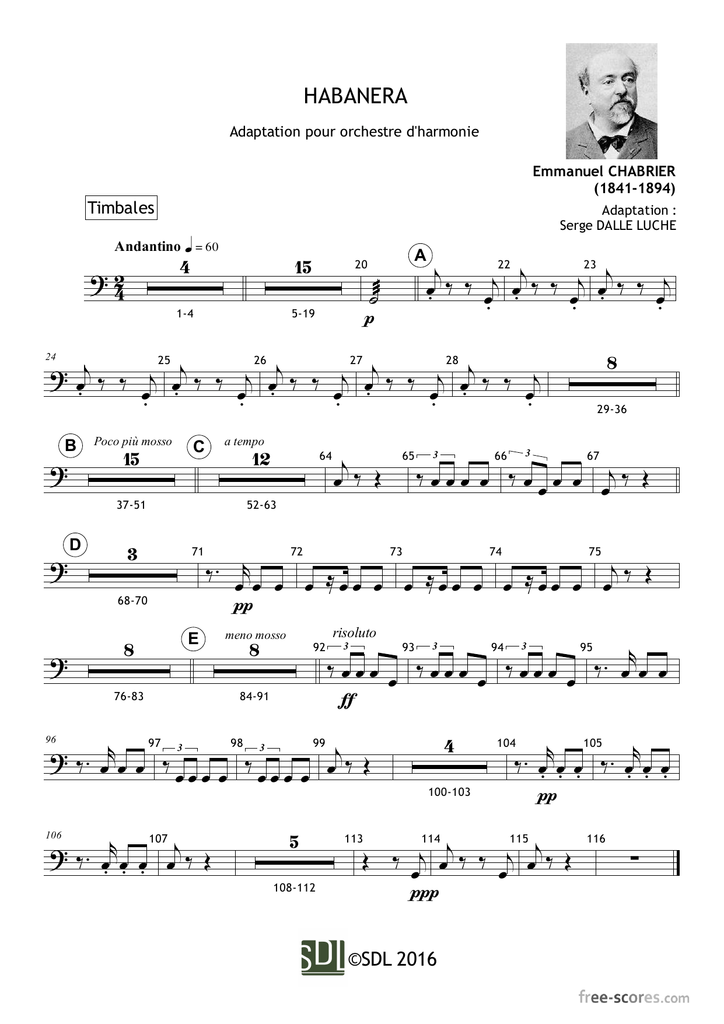 HABANERA Adaptation pour orchestre d'harmonie Emmanuel CHABRIER (1841-1894) Timbales 3 04 1-4 5-19 Andantino q = 60 > 13 Adaptation : Serge DALLE LUCHE A 20 ˙æ ο ι 22 23 ι ι ι ι œ− ‰ ‰ œ œ− ‰ ‰ œ œ− ‰ ‰ œι − − − 7 25 26 27 28 > œι ‰ ‰ ι œι ‰ ‰ ι œι ‰ ‰ ι œι ‰ ‰ ι œι ‰ ‰ ι − œ− − œ− − œ− − œ− − œ− 24 B > 04 Poco più mosso 01 a tempo C 37-51 > D 52-63 2 71 68-70 > 64 7 E ι œ ‰ Œ 72 3 66 7 73 67 92 84-91 97 107 > ‰ − œθ œ œ œι ‰ Œ − − − 98 74 3 93 3 108-112 3 94 3 99 4 75 θ ‰œœœ ‰œœœ ‰œœœ ‰− œ œ œ œ œ œ ƒ risoluto meno mosso 3 ι > ‰ − œθ œ œ ‰ 3 ‰ ‰ Œ œ œœœ œ œœœ œ 106 ‰ œ œ œ œ ‰ œ œ œ ι‰ Œ œ œ 3 ι‰ Œ ‰− θ œ œ œ œ ≈œœ œ œ ≈œœ œ œ ≈œœ œ œ π 76-83 96 65 29-36 100-103 105 θ θ ‰ − œ− œ− œ− ‰ − œ− œ− œ− π 104 114 115 ι ι‰ Œ ι ι Œ ‰ ‰ ‰ œ œ œ œ ∏ 113 ©SDL 2016 95 116 ∑
