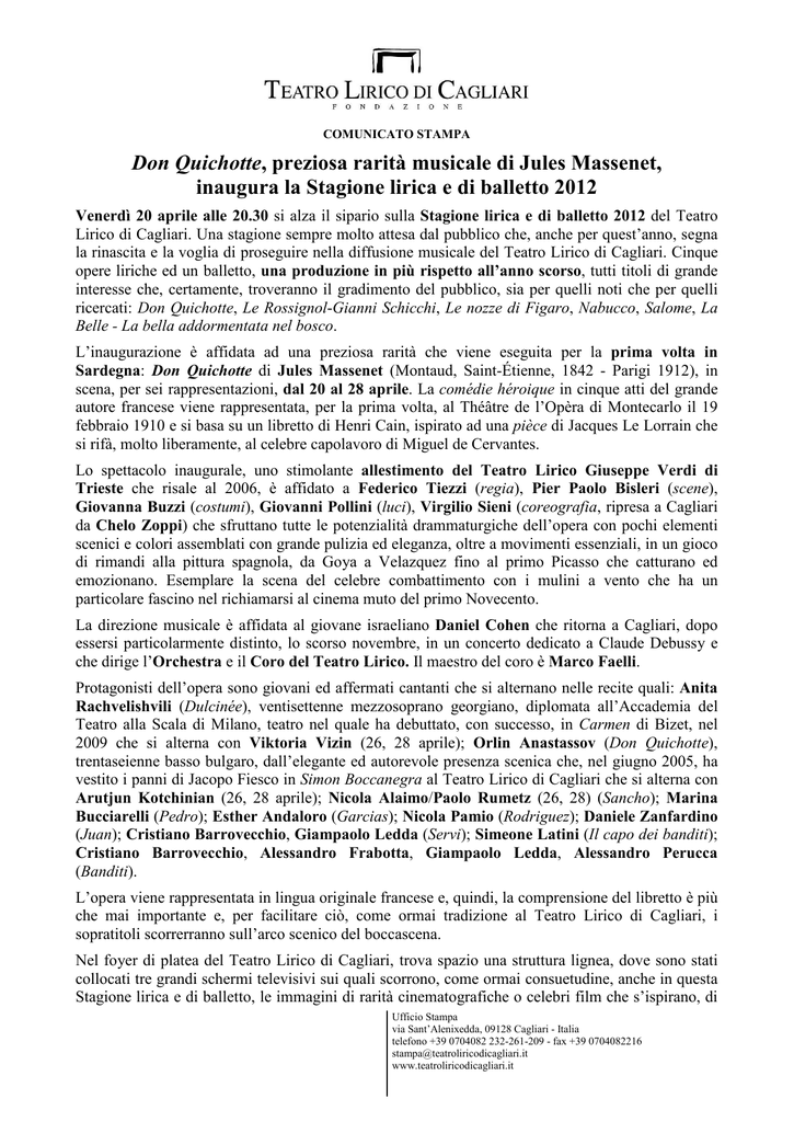 COMUNICATO STAMPA Don Quichotte, preziosa rarità musicale di Jules Massenet, inaugura la Stagione lirica e di balletto 2012 Venerdì 20 aprile alle 20.30 si alza il sipario sulla Stagione lirica e di balletto 2012 del Teatro Lirico di Cagliari. Una stagione sempre molto attesa dal pubblico che, anche per quest’anno, segna la rinascita e la voglia di proseguire nella diffusione musicale del Teatro Lirico di Cagliari. Cinque opere liriche ed un balletto, una produzione in più rispetto all’anno scorso, tutti titoli di grande interesse che, certamente, troveranno il gradimento del pubblico, sia per quelli noti che per quelli ricercati: Don Quichotte, Le Rossignol-Gianni Schicchi, Le nozze di Figaro, Nabucco, Salome, La Belle - La bella addormentata nel bosco. L’inaugurazione è affidata ad una preziosa rarità che viene eseguita per la prima volta in Sardegna: Don Quichotte di Jules Massenet (Montaud, Saint-Étienne, 1842 - Parigi 1912), in scena, per sei rappresentazioni, dal 20 al 28 aprile. La comédie héroique in cinque atti del grande autore francese viene rappresentata, per la prima volta, al Théâtre de l’Opèra di Montecarlo il 19 febbraio 1910 e si basa su un libretto di Henri Cain, ispirato ad una pièce di Jacques Le Lorrain che si rifà, molto liberamente, al celebre capolavoro di Miguel de Cervantes. Lo spettacolo inaugurale, uno stimolante allestimento del Teatro Lirico Giuseppe Verdi di Trieste che risale al 2006, è affidato a Federico Tiezzi (regia), Pier Paolo Bisleri (scene), Giovanna Buzzi (costumi), Giovanni Pollini (luci), Virgilio Sieni (coreografia, ripresa a Cagliari da Chelo Zoppi) che sfruttano tutte le potenzialità drammaturgiche dell’opera con pochi elementi scenici e colori assemblati con grande pulizia ed eleganza, oltre a movimenti essenziali, in un gioco di rimandi alla pittura spagnola, da Goya a Velazquez fino al primo Picasso che catturano ed emozionano. Esemplare la scena del celebre combattimento con i mulini a vento che ha un particolare fascino nel richiamarsi al cinema muto del primo Novecento. La direzione musicale è affidata al giovane israeliano Daniel Cohen che ritorna a Cagliari, dopo essersi particolarmente distinto, lo scorso novembre, in un concerto dedicato a Claude Debussy e che dirige l’Orchestra e il Coro del Teatro Lirico. Il maestro del coro è Marco Faelli. Protagonisti dell’opera sono giovani ed affermati cantanti che si alternano nelle recite quali: Anita Rachvelishvili (Dulcinée), ventisettenne mezzosoprano georgiano, diplomata all’Accademia del Teatro alla Scala di Milano, teatro nel quale ha debuttato, con successo, in Carmen di Bizet, nel 2009 che si alterna con Viktoria Vizin (26, 28 aprile); Orlin Anastassov (Don Quichotte), trentaseienne basso bulgaro, dall’elegante ed autorevole presenza scenica che, nel giugno 2005, ha vestito i panni di Jacopo Fiesco in Simon Boccanegra al Teatro Lirico di Cagliari che si alterna con Arutjun Kotchinian (26, 28 aprile); Nicola Alaimo/Paolo Rumetz (26, 28) (Sancho); Marina Bucciarelli (Pedro); Esther Andaloro (Garcias); Nicola Pamio (Rodriguez); Daniele Zanfardino (Juan); Cristiano Barrovecchio, Giampaolo Ledda (Servi); Simeone Latini (Il capo dei banditi); Cristiano Barrovecchio, Alessandro Frabotta, Giampaolo Ledda, Alessandro Perucca (Banditi). L’opera viene rappresentata in lingua originale francese e, quindi, la comprensione del libretto è più che mai importante e, per facilitare ciò, come ormai tradizione al Teatro Lirico di Cagliari, i sopratitoli scorrerranno sull’arco scenico del boccascena. Nel foyer di platea del Teatro Lirico di Cagliari, trova spazio una struttura lignea, dove sono stati collocati tre grandi schermi televisivi sui quali scorrono, come ormai consuetudine, anche in questa Stagione lirica e di balletto, le immagini di rarità cinematografiche o celebri film che s’ispirano, di Ufficio Stampa via Sant’Alenixedda, 09128 Cagliari - Italia telefono +39 0704082 232-261-209 - fax +39 0704082216 [email protected] www.teatroliricodicagliari.it volta in volta, al titolo in programmazione. In occasione di quest’allestimento di Don Quichotte, si potranno ammirare brani da: L’uomo della Mancha (1972), commedia americana con i divi hollywoodiani Peter O’ Toole e Sophia Loren nei ruoli protagonisti; Don Chisciotte (1992), il più celebre dei grandi film incompiuti che Orson Welles, dopo 14 anni, non riuscì a terminare e che venne completato e montato dal suo collaboratore Jesus Franco; Quijote (2006), il film visionario di Mimmo Paladino, uscito nelle sale soltanto a marzo 2012, con Peppe Servillo e Lucio Dalla. Si intende, così, suggerire al pubblico un percorso di approfondimento più vasto e non scontato ed, allo stesso tempo, sollecitare un arricchimento della conoscenza dell’autore. Don Quichotte viene replicato: domenica 22 aprile alle 17 (turno D), martedì 24 aprile alle 20.30 (turno B), giovedì 26 aprile alle 20.30 (turno F), venerdì 27 aprile alle 20.30 (turno C), sabato 28 aprile alle 19 (turno G). Prezzi abbonamenti: platea da € 255,00 a € 195,00 (settore giallo), da € 225,00 a € 175,00 (settore rosso), da € 195,00 a € 130,00 (settore blu); I loggia da € 205,00 a € 145,00 (settore giallo), da € 165,00 a € 120,00 (settore rosso), da € 150,00 a € 105,00 (settore blu); II loggia da € 120,00 a € 105,00 (settore giallo), da € 100,00 a € 80,00 (settore rosso), da € 75,00 a € 50,00 (settore blu). Prezzi biglietti: platea da € 70,00 a € 45,00 (settore giallo), da € 55,00 a € 35,00 (settore rosso), da € 40,00 a € 25,00 (settore blu); I loggia da € 50,00 a € 30,00 (settore giallo), da € 40,00 a € 25,00 (settore rosso), da € 35,00 a € 20,00 (settore blu); II loggia da € 30,00 a € 20,00 (settore giallo), da € 20,00 a € 15,00 (settore rosso), da € 15,00 a € 10,00 (settore blu). La Biglietteria del Teatro Lirico è aperta dal lunedì al venerdì, dalle 10 alle 13 e 