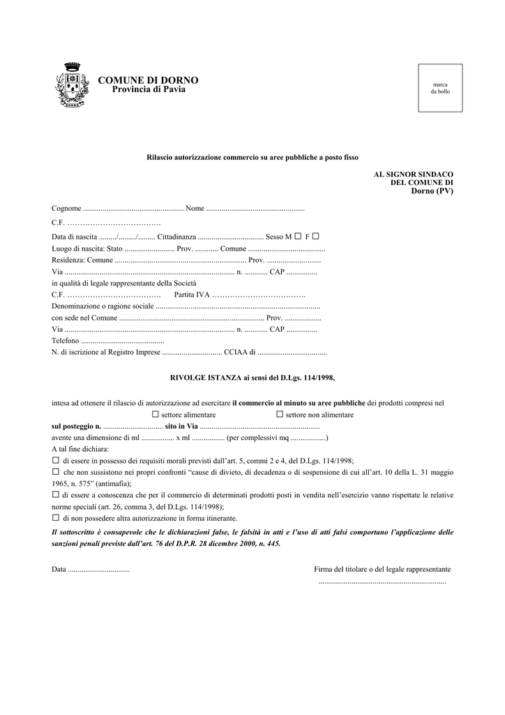 COMUNE DI DORNO marca da bollo Provincia di Pavia Rilascio autorizzazione commercio su aree pubbliche a posto fisso AL SIGNOR SINDACO DEL COMUNE DI Dorno (PV) Cognome .................................................... Nome ................................................... C.F. ………………………………. Data di nascita ........./........./......... Cittadinanza .................................. Sesso M □ F□ Luogo di nascita: Stato .......................... Prov. ............ Comune ........................................ Residenza: Comune .................................................................... Prov. ............................ Via ........................................................................................ n. ............ CAP ................ in qualità di legale rappresentante della Società C.F. ………………………………. Partita IVA ………………………………. Denominazione o ragione sociale ..................................................................................... con sede nel Comune ........................................................................... Prov. ................... Via ........................................................................................ n. ............ CAP ................ Telefono ........................................... N. di iscrizione al Registro Imprese ............................... CCIAA di .................................... RIVOLGE ISTANZA ai sensi del D.Lgs. 114/1998, intesa ad ottenere il rilascio di autorizzazione ad esercitare il commercio al minuto su aree pubbliche dei prodotti compresi nel □ settore alimentare □ settore non alimentare sul posteggio n. ............................... sito in Via .............................................................. avente una dimensione di ml ................. x ml ................. (per complessivi mq ..................) A tal fine dichiara: □ di essere in possesso dei requisiti morali previsti dall’art. 5, commi 2 e 4, del D.Lgs. 114/1998; □ che non sussistono nei propri confronti “cause di divieto, di decadenza o di sospensione di cui all’art. 10 della L. 31 maggio 1965, n. 575” (antimafia); □ di essere a conoscenza che per il commercio di determinati prodotti posti in vendita nell’esercizio vanno rispettate le relative norme speciali (art. 26, comma 3, del D.Lgs. 114/1998); □ di non possedere altra autorizzazione in forma itinerante. Il sottoscritto è consapevole che le dichiarazioni false, le falsità in atti e l’uso di atti falsi comportano l’applicazione delle sanzioni penali previste dall’art. 76 del D.P.R. 28 dicembre 2000, n. 445. Data ................................ Firma del titolare o del legale rappresentante .................................................................. DICHIARAZIONI DI ALTRE PERSONE (AMMINISTRATORI, SOCI) INDICATE ALL’ART. 2 D.P.R. 252/1998 Cognome .......................... Nome ....................... C.F. ………………………………. Data di nascita ........./........./......... Cittadinanza ..................................... Sesso M F Luogo di nascita: Stato .......................... Prov. ............ Comune ........................................ Residenza: Comune .................................................................... Prov. ............................ Via ....................................................................... n. ............ CAP ................ □ □ DICHIARA Di essere in possesso dei requisiti morali previsti dall’art. 5 comma 2 e 4 del D.Lgs. 114/1998. Che non sussistono nei propri confronti “cause di divieto, di decadenza o di sospensione di cui all’art. 10 della legge 31 maggio 1965, n. 575” (antimafia). Il sottoscritto è consapevole che le dichiarazioni false, le falsità in atti e l’uso di atti falsi comportano l’applicazione delle sanzioni penali previste dall’art. 76 del D.P.R. 28 dicembre 2000, n. 445. Data ................................ Firma ............................................................ Cognome .......................... Nome ....................... C.F. ………………………………. Data di nascita ........./........./......... Cittadinanza ..................................... Sesso M F Luogo di nascita: Stato .......................... Prov. ............ Comune ........................................ Residenza: Comune .................................................................... Prov. ............................ Via ....................................................................... n. ............ CAP ................ □ □ DICHIARA Di essere in possesso dei requisiti morali previsti dall’art. 5 comma 2 e 4 del D.Lgs. 114/1998. Che non sussistono nei propri confronti “cause di divieto, di decadenza o di sospensione di cui all’art. 10 della legge 31 maggio 1965, n. 575” (antimafia). Il sottoscritto è consapevole che le dichiarazioni false, le falsità in atti e l’uso di atti falsi comportano l’applicazione delle sanzioni penali previste dall’art. 76 del D.P.R. 28 dicembre 2000, n. 445. Data ................................ Firma ............................................................ Cognome .......................... Nome ....................... C.F. ………………………………. Data di nascita ........./........./......... Cittadinanza ..................................... Sesso M F Luogo di nascita: Stato .......................... Prov. ............ Comune ........................................ Residenza: Comune .................................................................... Prov. ............................ Via ....................................................................... n. ............ CAP ................ □ □ DICHIARA Di essere in possesso dei requisiti morali previsti dall’art. 5 comma 2 e 4 del D.Lgs. 114/1998. Che non sussistono nei propri confronti 