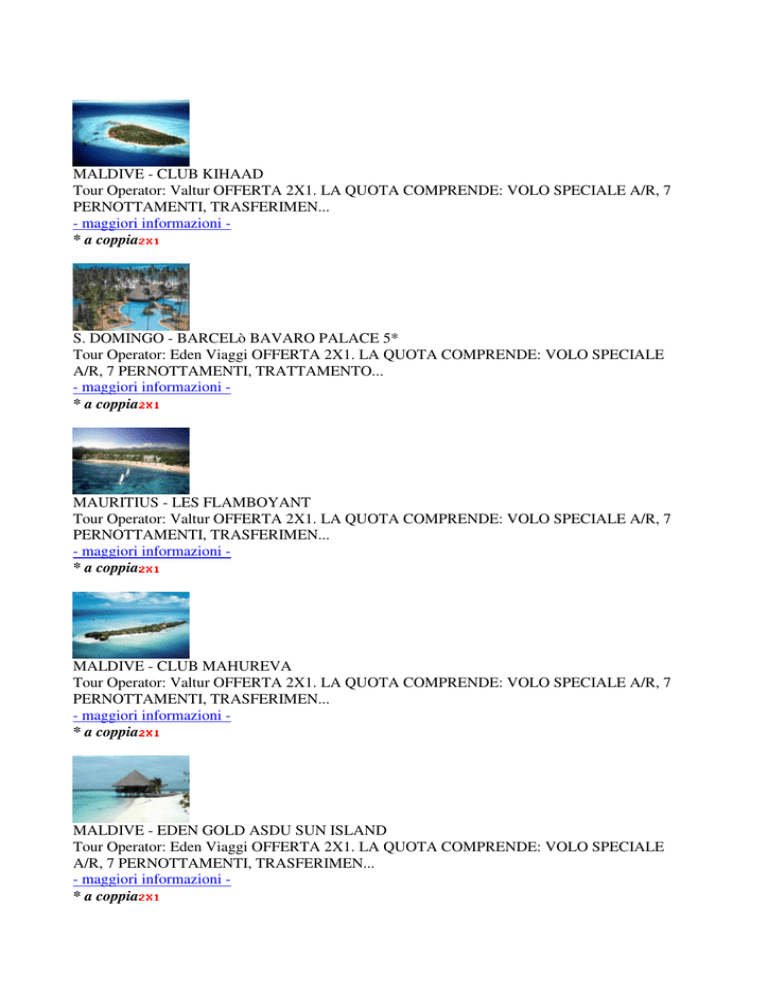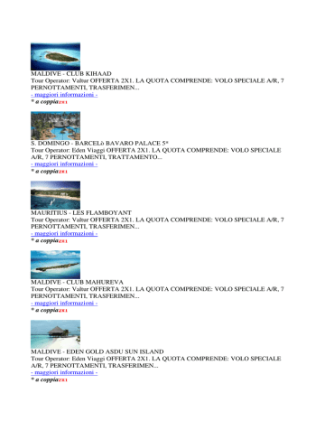 MALDIVE - CLUB KIHAAD Tour Operator: Valtur OFFERTA 2X1. LA QUOTA COMPRENDE: VOLO SPECIALE A/R, 7 PERNOTTAMENTI, TRASFERIMEN... - maggiori informazioni * a coppia S. DOMINGO - BARCELò BAVARO PALACE 5* Tour Operator: Eden Viaggi OFFERTA 2X1. LA QUOTA COMPRENDE: VOLO SPECIALE A/R, 7 PERNOTTAMENTI, TRATTAMENTO... - maggiori informazioni * a coppia MAURITIUS - LES FLAMBOYANT Tour Operator: Valtur OFFERTA 2X1. LA QUOTA COMPRENDE: VOLO SPECIALE A/R, 7 PERNOTTAMENTI, TRASFERIMEN... - maggiori informazioni * a coppia MALDIVE - CLUB MAHUREVA Tour Operator: Valtur OFFERTA 2X1. LA QUOTA COMPRENDE: VOLO SPECIALE A/R, 7 PERNOTTAMENTI, TRASFERIMEN... - maggiori informazioni * a coppia MALDIVE - EDEN GOLD ASDU SUN ISLAND Tour Operator: Eden Viaggi OFFERTA 2X1. LA QUOTA COMPRENDE: VOLO SPECIALE A/R, 7 PERNOTTAMENTI, TRASFERIMEN... - maggiori informazioni * a coppia S. DOMINGO - BARCELO CAPELLA BEACH RESORT 5* Tour Operator: Eden Viaggi OFFERTA 2X1. LA QUOTA COMPRENDE: VOLO SPECIALE A/R, 7 PERNOTTAMENTI, TRATTAMENTO... - maggiori informazioni * a coppia MINORCA - SOL MENORCA Tour Operator: Reliance OFFERTA 2X1. LA QUOTA COMPRENDE: VOLO SPECIALE A/R, 7 PERNOTTAMENTI CON TRATTAME... - maggiori informazioni * a coppia MAURITIUS - VILLAGGIO ITALIANO Tour Operator: Eden Viaggi OFFERTA 2X1. LA QUOTA COMPRENDE: VOLO SPECIALE A/R, 7 PERNOTTAMENTI, TRASFERIMEN... - maggiori informazioni – * a coppia S. DOMINGO - EDEN SPECIAL CLUB VIVA DOMINICUS BEACH Tour Operator: Eden Viaggi OFFERTA 2X1. LA QUOTA COMPRENDE: VOLO SPECIALE A/R, 7 PERNOTTAMENTI, TRASFERIMEN... - maggiori informazioni * a coppia S. DOMINGO - EDEN GOLD BARCELO' BAVARO GOLF & CASINO’ Tour Operator: Eden Viaggi OFFERTA 2X1. LA QUOTA COMPRENDE: VOLO SPECIALE A/R, 7 PERNOTTAMENTI, TRATTAMENTO... - maggiori informazioni * a coppia S. DOMINGO - EDEN GOLD BARCELO' BAVARO GOLF & CASINO’ Tour Operator: Eden Viaggi OFFERTA 2X1. LA QUOTA COMPRENDE: VOLO SPECIALE A/R, 7 PERNOTTAMENTI, TRATTAMENTO... - maggiori informazioni * a coppia MINORCA - SOL GAVILANES Tour Operator: Reliance OFFERTA 2X1. LA QUOTA COMPRENDE: VOLO SPECIALE A/R, 7 PERNOTTAMENTI CON TRATTAME... - maggiori informazioni * a coppia KENYA - SUN PALM RESORT Tour Operator: Eledofe ha selezionato per Voi OFFERTA 2X1 VERONA. LA QUOTA COMPRENDE: VOLO SPECIALE A/R, 7 PERNOTTAMENTI CON T... - maggiori informazioni * a coppia ZANZIBAR - ATLANTIS CLUB MICHAMVI Tour Operator: I Viaggi di Atlantide OFFERTA 2X1 PACCHETTO 8 NOTTI. LA QUOTA COMPRENDE: TRASFERIMENTI DA E PER L'AERO... - maggiori informazioni * a coppia MINORCA - AUDAX HOTEL Tour Operator: Reliance OFFERTA 2X1. LA QUOTA COMPRENDE: VOLO SPECIALE A/R, 7 PERNOTTAMENTI CON TRATTAME... - maggiori informazioni * a coppia MINORCA - SOL MILANOS PINGUINOS Tour Operator: Reliance OFFERTA 2X1. LA QUOTA COMPRENDE: VOLO SPECIALE A/R, 7 PERNOTTAMENTI CON TRATTAME... - maggiori informazioni * a coppia MINORCA - APARTHOTEL CAREMA SIESTA PLAYA Tour Operator: Reliance OFFERTA 2X1. ATTENZIONE PACCHETTO 8 NOTTI !!! LA QUOTA COMPRENDE: VOLO SPECIALE ... - maggiori informazioni * a coppia MALDIVE - HOTEL GIRAVARU Tour Operator: Albatour-Many Tours srl OFFERTA 2X1. LA QUOTA COMPRENDE:VOLO SPECIALE A/R, 7 PERNOTTAMENTI, TRASFERIMENT... - maggiori informazioni * a coppia S. DOMINGO - VIVA DOMINICUS BEACH Tour Operator: Un altro sole OFFERTA 2X1. LA QUOTA COMPRENDE: VOLO SPECIALE A/R SU LA ROMANA, 7 PERNOTTAMENTI... - maggiori informazioni * a coppia MINORCA - SUR MENORCA HOTEL Tour Operator: Reliance OFFERTA 2X1. LA QUOTA COMPRENDE: VOLO SPECIALE A/R, 7 PERNOTTAMENTI CON TRATTAME... - maggiori informazioni * a coppia CUBA - BARCELO CAYO SANTA MARIA 5* Tour Operator: Un altro sole OFFERTA 2X1. CAYO SANTA MARIA. LA QUOTA COMPRENDE: VOLO SPECIALE A/R SU SANTA CL... - maggiori informazioni * a coppia CUBA - BARCELO SOLYMAR 5* Tour Operator: Un altro sole OFFERTA 2X1. LA QUOTA COMPRENDE: VOLO SPECIALE A/R, 7 PERNOTTAMENTI, TRASFERIMEN... - maggiori informazioni * a coppia CRETA - EDEN SPECIAL RETHYMNO MARE HOTEL CAT.A Tour Operator: Eden Viaggi OFFERTA 2X1. LA QUOTA COMPRENDE: VOLO SPECIALE A/R, 7 PERNOTTAMENTI CON TRATTAME... - maggiori informazioni * a coppia MINORCA - APARTHOTEL JARDIN DE MENORCA Tour Operator: Reliance OFFERTA 2X1. LA QUOTA COMPRENDE: VOLO SPECIALE A/R, 7 PERNOTTAMENTI CON TRATTAME... - maggiori informazioni * a coppia SARDEGNA - HOTEL STINTINO Tour Operator: Eledofe ha selezionato per Voi OFFERTA 2X1. LA QUOTA COMPRENDE: VOLO SPECIALE A/R, 7 PERNOTTAMENTI CON TRATTAME... - maggiori informazioni * a coppia IBIZA - VILLAGGIO ITALIANO Tour Operator: Eden Viaggi OFFERTA 2X1. LA QUOTA COMPRENDE: VOLO SPECIALE A/R, 7 PERNOTTAMENTI, TRASFERIMEN... - maggiori informazioni * a coppia EGITTO - MARSA ALAM - VILLAGGIO ITALIANO Tour Operator: Eden Viaggi OFFERTA 2X1. LA QUOTA COMPRENDE: VOLO SPECIALE A/R, 7 PERNOTTAMENTI, TRASFERIMEN... - maggiori informazioni * a coppia IBIZA - EDEN GOLD BOSSA PARK Tour Operator: Eden Viaggi OFFERTA 2X1. LA QUOTA COMPRENDE: VOLO SPECIALE A/R, 7 PERNOTTAMENTI, TRASFERIMEN... - maggiori informazioni * a coppia RODI - EDEN GOLD LINDIAN GULF HOTEL CAT. B Tour Operator: Eden Viaggi OFFERTA 2X1. LA QUOTA COMPRENDE: 7 PERNOTTAMENTI, TRASFERIMENTI DA/PER L'HOTEL, ... - maggiori informazioni * a coppia KOS - SPRINCLUB KIPRIOTIS MARIS 5* Tour Operator: Sprintours OFFERTA 2X1. LA QUOTA COMPRENDE: VOLO SPECIALE A/R, 7 PERNOTTAMENTI, TRASFERIMEN... - maggiori informazioni * a coppia PALMA DI MAIORCA - VILLAGGIO ITALIANO Tour Operator: Eden Viaggi OFFERTA 2X1. LA QUOTA COMPRENDE: VOLO SPECIALE A/R, 7 PERNOTTAMENTI, TRASFERIMEN... - maggiori informazioni * a coppia MINORCA - VILLAGGIO ITALIANO Tour Operator: Eden Viaggi OFFERTA 2X1. LA QUOTA COMPRENDE: VOLO SPECIALE A/R, 7 PERNOTTAMENTI, TRASFERIMEN... - maggiori informazioni – * a coppia EGITTO - SHARM EL SHEIKH - VILLAGGIO ITALIANO Tour Operator: Eden Viaggi OFFERTA 2X1. LA QUOTA COMPRENDE: VOLO SPECIALE A/R, 7 PERNOTTAMENTI, TRASFERIMEN... - maggiori informazioni * a coppia CALABRIA -