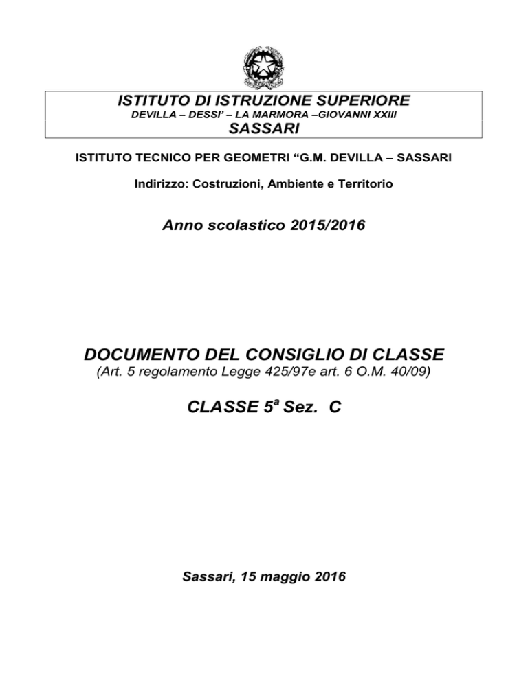 ISTITUTO DI ISTRUZIONE SUPERIORE DEVILLA – DESSI’ – LA MARMORA –GIOVANNI XXIII SASSARI ISTITUTO TECNICO PER GEOMETRI “G.M. DEVILLA – SASSARI Indirizzo: Costruzioni, Ambiente e Territorio Anno scolastico 2015/2016 DOCUMENTO DEL CONSIGLIO DI CLASSE (Art. 5 regolamento Legge 425/97e art. 6 O.M. 40/09) CLASSE 5a Sez. C Sassari, 15 maggio 2016 Indice ♦ ELENCO DOCENTI – STABILITA' DEI DOCENTI DEL CORSO - pag. 3 ♦ ELENCO ALUNNI – pag. 4 ♦ BREVE STORIA DELLA SCUOLA – pag.5 - Presentazione della scuola - pag.5 Profilo culturale e risultati di apprendimento dei percorsi del settore tecnologico - pag.6 Profilo in uscita del diplomato nell’indirizzo “Costruzioni, Ambiente e Territorio”- pag.7 ♦ 1. PROFILO DELLA CLASSE IN USCITA RISPETTO ALLA SITUAZIONE DI PARTENZA -pag. 8 ♦ 2.OBIETTIVI GENERALI RAGGIUNTI DALLA CLASSE NEL SUO COMPLESSO - pag. 9 OBIETTIVI TRASVERSALI - pag. 9 a. obiettivi cognitivi b. obiettivi formativi c. obiettivi educativi d. obiettivi di orientamento ♦ 3. I CONTENUTI TRATTATI E LE ATTIVITA’ SVOLTE - pag. 10 ♦ 4. METODOLOGIE E STRUMENTI - pag.11 Metodologie adottate e modalità di lavoro nelle varie discipline Mezzi e strumenti Mezzi-strumenti-spazi ♦ 5) CRITERI DI VALUTAZIONE E VERIFICHE - pag. 12 Definizione di criteri comuni per la corrispondenza tra voti e livelli di conoscenze e abilità Griglia generale - pag. 13 Iniziative per la preparazione alle prove scritte dell’esame di Stato - pag.14 ♦ 6) ATTIVITA’ INTEGRATIVE – EXTRACURRICULARI E COLLATERALI - pag. 14 ♦ 7) RAPPORTI CON LE FAMIGLIE - pag. 15 ♦ 8) CRITERI ESSENZIALI DEL COLLOQUIO D’ESAME - pag. 15 ♦ 9) ATTIVITA’ DEL CONSIGLIO DI CLASSE - pag.15 ♦ ALLEGATI - Testo di simulazione seconda prova - Testi di simulazione terze prove (risposta multipla e aperta) - Griglie di valutazione - Relazioni e programmi dei docenti 2 ISTITUTO TECNICO PER GEOMETRI “ G.M. DEVILLA “ SASSARI ANNO SCOLASTICO 2015/2016 ELENCO DOCENTI DEL CONSIGLIO DI CLASSE 5a Sez. C DOCENTE ARRU PIERPAOLO NESTI A. PAOLA TANDA MAURIZIO FIORI M. LETIZIA GANADU VALENTINA PUGGIONI ROBERTA MUREDDU M. CONSUELO DETTORI GIOVANNI STRUSI ROBERTO MATERIA PROGETTAZIONE COSTRUZIONE IMPIANTI SCIENZE MOTORIE E SPORT MATEMATICA RELIGIONE LINGUA STRANIERA TL01-IMO7 LINGUA E LETT. ITALIANE TLOO, STORIA - ED CIVICA TL00 GESTIONE DEL CANTIERE E SICUREZZA DELL'AMBIENTE DI LAVORO GEOPEDOLOGIA ECONOMIA ED ESTIMO TOPOGRAFIA E FOTOGRAMMETRIA LABORATORIO TOPOGRAFIA E FOTOGRAMMETRIA, ZIRANU SALVATORE LABORATORIO PROGETTAZIONE COSTRUZIONE IMPIANTI, LABORATORIO GEOPEDOLOGIA ECONOMIA ED ESTIMO STABILITA’ DEI DOCENTI DEL CORSO Nel corso del triennio, diversi motivi soprattutto di ordine burocratico relativi alla contrazione delle classi, alla variazione degli orari e all’assegnazione delle cattedre, hanno determinato la mancanza di continuità didattica nelle diverse discipline. Nella classe quarta hanno mantenuto la continuità didattica gli insegnanti di Lingua e Letteratura Italiane e Storia, Topografia, Matematica edEd. Fisica. Nella classe quinta sono stati assegnati nuovi docenti nei diversi insegnamenti ad eccezione di Lingua e Letteratura Italiane e Storia. 3 ISTITUTO TECNICO PER GEOMETRI “ G.M. DEVILLA “ SASSARI ANNO SCOLASTICO 2015/2016 ELENCO DEGLI STUDENTI - CLASSE Alunno 1. ARA FABIO 2. BECCIU ERIKA 3. CHIGHINI ALESSIO 4. COLOMBINO DANILO ANTONELLO 5. COSTANZO GABRIELE 6. DACHENA ELEONORA 7. DERUDAS MICHELE 8. FILADELLI PAOLO 9. LAI MANUEL 10. MADAU ANDREA 11. PINNA MARIA 12. ROGGIO PIERGIUSEPPE 13. RUIU ELETTRA 14. SECHI GIOVANNA LAURA 4 5a Sez. C ISTITUTO TECNICO PER GEOMETRI “G.M. DEVILLA” SASSARI ANNO SCOLASTICO 2015/2016 DOCUMENTO DEL CONSIGLIO DI CLASSE DELLA 5 a SEZ. C (Art.5 regolamento Legge 425/97) BREVE STORIA DELLA SCUOLA Presentazione della scuola L'Istituto Tecnico per Geometri "G.M.Devilla" di Sassari è di antica tradizione ed ha formato generazioni di geometri che hanno operato ed operano nella città e nella provincia. Con il riordino degli Istituti Tecnici, l’Istituto Tecnico per Geometri “G.M. Devilla” di Sassari ha assunto la nuova denominazione di Istituto Tecnico per il Settore Tecnologico, con indirizzo Costruzioni, Ambiente e Territorio. Inoltre, già dallo scorso anno, l’offerta formativa si è arricchita con il nuovo indirizzo Logistica e Trasporti – Costruzione del mezzo aereo. Quest’anno con la razionalizzazione delle Istituzioni scolastiche è stata costituita unanuova scuola che comprende i seguenti Istituti: Istituto Tecnico per Geometri Devilla, Istituto Tecnico Commerciale Dessì, Istituto La Marmora e Istituto Professionale Servizi Commerciali Giovanni XXIII. L’Istituto Tecnico G. M. Devilla”, dall’anno scolastico 1998/99, è ubicato nella nuova sede di via Donizetti n.1, nel quartiere del Latte Dolce – Santa Maria di Pisa, in un edificio di recente costruzione, che risponde a tutte le caratteristiche previste per un istituto tecnico moderno. E’ raggiungibileda tutti i quartieri della città con i bus dell'ATP, con la metropolitana di superficie Sirio e dai comuni limitrofi mediante il trenino delle Ferroviedella Sardegna, con gli autobus dell'ARST e con i pullman delle aziende private. Oltre a locali comuni ampi e aule luminose, ha in dotazione aule speciali, laboratori, palestra e spazi per attività sportive anche all’aperto, auditorium e la biblioteca, che attualmente è dotata di circa 10.000 volumi. Funzionano con regolarità, tre aule di informatica, due aule da disegno (Costruzioni e Topografia), un laboratorio di Scienze, Fisica e Chimica e altre aule. E’ presente in Istituto un locale bar/ristoro sia per gli studenti pendolari, sia per gli studenti impegnati in attività pomeridiane come corsi integrativi e di recupero. 5 Gli studenti pendolari residenti nei comuni vicini costituiscono circa il 50% della popolazione scolastica dell’istituto. Tutte le classi dell’istituto rientrano nel nuovo ordinamento previsto dalla Riforma 