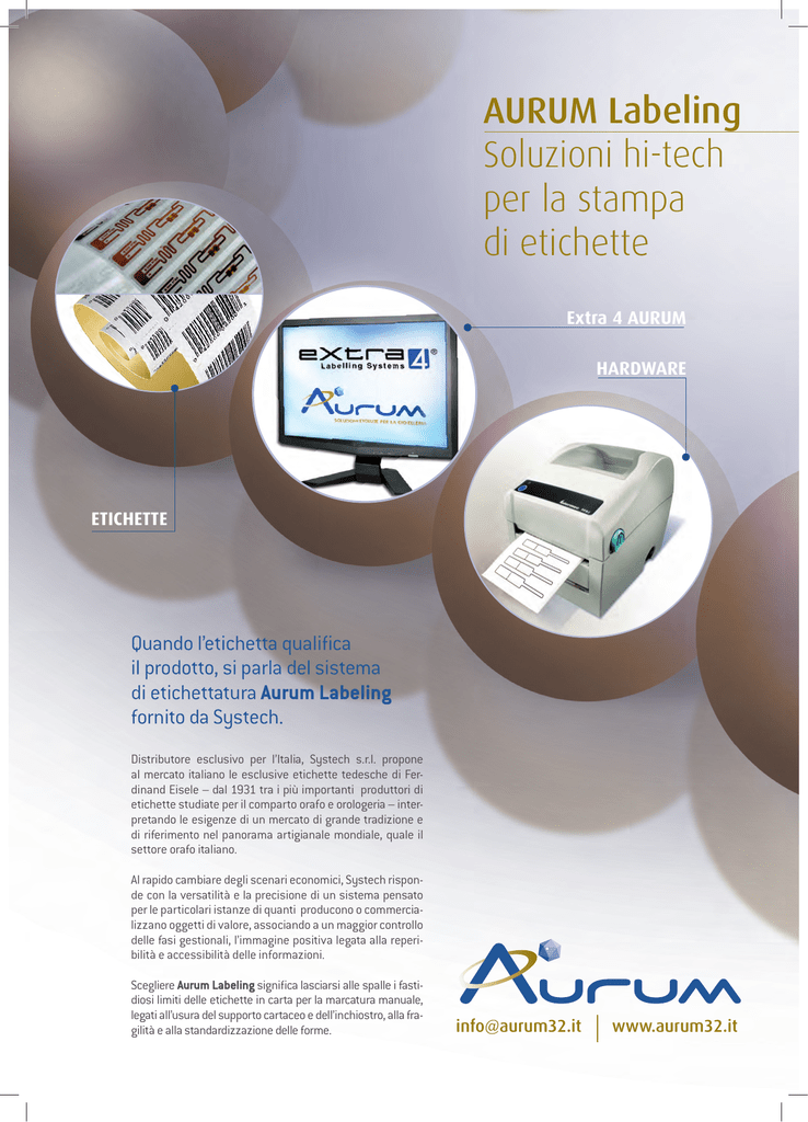 AURUM Labeling Soluzioni hi-tech per la stampa di etichette Extra 4 AURUM HARDWARE ETICHETTE Quando l’etichetta qualifica il prodotto, si parla del sistema di etichettatura Aurum Labeling fornito da Systech. Distributore esclusivo per l’Italia, Systech s.r.l. propone al mercato italiano le esclusive etichette tedesche di Ferdinand Eisele – dal 1931 tra i più importanti produttori di etichette studiate per il comparto orafo e orologeria – interpretando le esigenze di un mercato di grande tradizione e di riferimento nel panorama artigianale mondiale, quale il settore orafo italiano. Al rapido cambiare degli scenari economici, Systech risponde con la versatilità e la precisione di un sistema pensato per le particolari istanze di quanti producono o commercializzano oggetti di valore, associando a un maggior controllo delle fasi gestionali, l’immagine positiva legata alla reperibilità e accessibilità delle informazioni. Scegliere Aurum Labeling significa lasciarsi alle spalle i fastidiosi limiti delle etichette in carta per la marcatura manuale, legati all’usura del supporto cartaceo e dell’inchiostro, alla fragilità e alla standardizzazione delle forme. [email protected] www.aurum32.it AURUM Labeling Soluzioni hi-tech per la stampa di etichette > Extra 4 Aurum Le etichette: personalizzazione e versatilità Le etichette Aurum possono essere stampate da un pc. Le stampanti fornite allo scopo contengono speciali Carbon ribbons (nastri carbonati) predisposti per la stampa a trasferimento termico. La composizione chimica dell’inchiostro, abbinata alla tecnica e al supporto di stampa, assicura un ottimo rendimento rispetto alla conservazione dei dati stampati sull’etichetta, nonostante i molteplici trattamenti cui sono sottoposti i prodotti di gioielleria. Il sistema di stampa prevede due differenti soluzioni – la prima hardware, la seconda software - secondo le diverse esigenze dell’operatore, per ognuna delle quali è prevista – oltre all’installazione – una attenta formazione all’utilizzo e un contratto di manutenzione e assistenza. Extra 4 Aurum > Software “Extra 4 Aurum” > Stampante a trasferimento termico > Etichette e ribbon, accessori per l’applicazione Scegliere Aurum Labeling consente di: > Identificare i singoli prodotti in modo univoco; > Gestire con efficacia la varietà di prodotto; > Razionalizzare e velocizzare il flusso dei prodotti in entrata e in uscita; > Certificare la qualità e la provenienza dei prodotti; > Garantire una effettiva sicurezza. Con Aurum Labeling è l’operatore del settore a decidere la tipologia di etichetta più vicina alle proprie esigenze funzionali e comunicative. Caratteristiche salienti delle etichette Aurum sono: > formato > dimensione > colore (anche trasparente) > materiale (lucido od opaco) > rifinitura > contenuto L’innovativo materiale impiegato per le etichette Aurum è una particolare carta plastificata, con un elevato grado di resistenza all’usura, al calore, agli strappi, al bagno ad ultrasuoni, all’umidità e agli agenti chimici. Ulteriore vantaggio, la possibilità di realizzare etichette autoadesive con colla permanente o facilmente removibili che non lasciano residui sulla superficie marcata. L’applicazione delle etichette è resa agevole e rapida da sistemi di incollatura specifici (per anelli, collane, orecchini e spille, orologi, occhiali) da effettuare manualmente e da sistemi non adesivi con l’ausilio di fili – in cotone o nylon – o supporti in plastica dedicati. Come conciliare l’identificazione del prodotto con una accresciuta sicurezza relativa alla sua movimentazione? La risposta sono le etichette RFID (Radio Frequency IDentification) contenenti un microchip per l’identificazione a radiofrequenza. La trasmissione delle informazioni inserite elettronicamente nell’etichetta avviene tramite onde radio recepite da appositi lettori dotati di antenna, rendendo superfluo il contatto visivo con la stessa etichetta. Distributore ufficiale in Italia via S.Quasimodo, 42 40013 Castel Maggiore (Bo) Tel. +39 051 0563050 Fax +39 051 0563064 Via Firenze, 80 71036 Lucera (Fg) Tel. +39 0881 546817 Fax +39 0881 526245 [email protected] www.systechteam.it Nata nel 1994, Systech s.r.l. è un’azienda specializzata nella progettazione e nello sviluppo di soluzioni software ed hardware personalizzate per le aziende. L’integrazione con le più innovative tecnologie per l’Identificazione Automatica dei Dati (barcode, rfid e voice) fa di Systech una delle realtà di punta del settore. gennaio 2013 Le esclusive etichette Aurum sono raccolte in un ampio catalogo accessibile anche dal web all’indirizzo www.aurum32.it