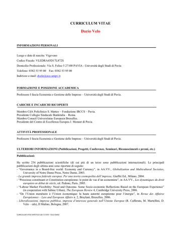 CURRICULUM VITAE Dario Velo INFORMAZIONI PERSONALI Luogo e data di nascita: Vigevano Codice Fiscale: VLEDRA45D17L872S Domicilio Professionale: Via S. Felice 5 27100 PAVIA - Università degli Studi di Pavia Telefono: 0382 53 95 00 Fax: 0382 53 95 00 Indirizzo e-mail: [email protected] FORMAZIONE E POSIZIONE ACCADEMICA Professore I fascia Economia e Gestione delle Imprese – Università degli Studi di Pavia. CARICHE E INCARICHI RICOPERTI Membro CdA Policlinico S. Matteo – Fondazione IRCCS – Pavia. Presidente Collegio Sindacale Bankitalia – Roma. Membro Conseil Universitaias Europeen Bruxelles. Presidente del Centro di Eccellenza Europea J. Monnet di Pavia. ATTIVITÀ PROFESSIONALE Professore I fascia Economia e Gestione delle Imprese – Università degli Studi di Pavia. ULTERIORI INFORMAZIONI (Pubblicazioni, Progetti, Conferenze, Seminari, Riconoscimenti e premi, etc.) Pubblicazioni: Ha scritto 254 pubblicazioni scientifiche (di cui più di un terzo sono pubblicazioni internazionali). Le principali pubblicazioni degli ultima anni sono riportate di seguito: - “Governance in a Board-free world: Economy and Currency”, in AA.VV., Globalization and Multicultural Societies, University of Notre Dame Press, Notre Dame, 2003. - La grande impresa federale europea. Per una teoria cosmopolita dell’impresa, Giuffrè Ed., Milano, 2004. - “Processus constituant et Constitution européenne: le point de vue d’un economiste”, in AA.VV., Les dynamiques du droit européen en début de siècle, ed. Pedone, Paris, 2005. - “Labour Market Flexibility: Need and Outcome. Some Socio-economic Reflections Based on the European Experience” (in cooperation with Sabine Urban), The European Review 4, Cambridge University Press, 2006. - “De l’Union monétaire à l’Union économique: la haute autorité européenne pour l’énergie”, in Revue des Affaires Européennes – Law and European Affairs n. 2, Bruylant, Bruxelles, 2006. - Liberalizzazioni, impresa pubblica, impresa d’interesse generale nell’Unione Europea (R. Cafferata, M. Martellini, D. Velo – eds), Il Mulino, Bologna, 2007. CURRICULUM VITAE SINTETICO CdA CUEIM – VELO DARIO - “The European Enterprise of General Interest: a Tool for Balanced Development”, in AA.VV., The E.U. and the Economies of the Eastern European Enlargement, Physica-Verlag, Berlin, 2008. - “The Future for European Society: Subsidiarity, Federalism, New Humanism”, in AA.VV., Intercultural Dialogue and Multilevel Governance in Europe, Peter Lang, Berlin, 2012 - The European Social Market Economy and the European Economic-Monetary Union (with Francesco Velo), Peter Lang, Berlin, 2013 In ottemperanza del D. Lgs. n.33/2013 in materia di obblighi di pubblicità, trasparenza e diffusione di informazioni ed ai sensi del D.Lgs. n. 196/2013, il sottoscritto Dario Velo, autorizza al trattamento dei dati personali e alla loro pubblicazione sul sito istituzionale del Cueim (www.cueim.it). Pavia, 4 dicembre 2013. CURRICULUM VITAE SINTETICO CdA CUEIM – VELO DARIO