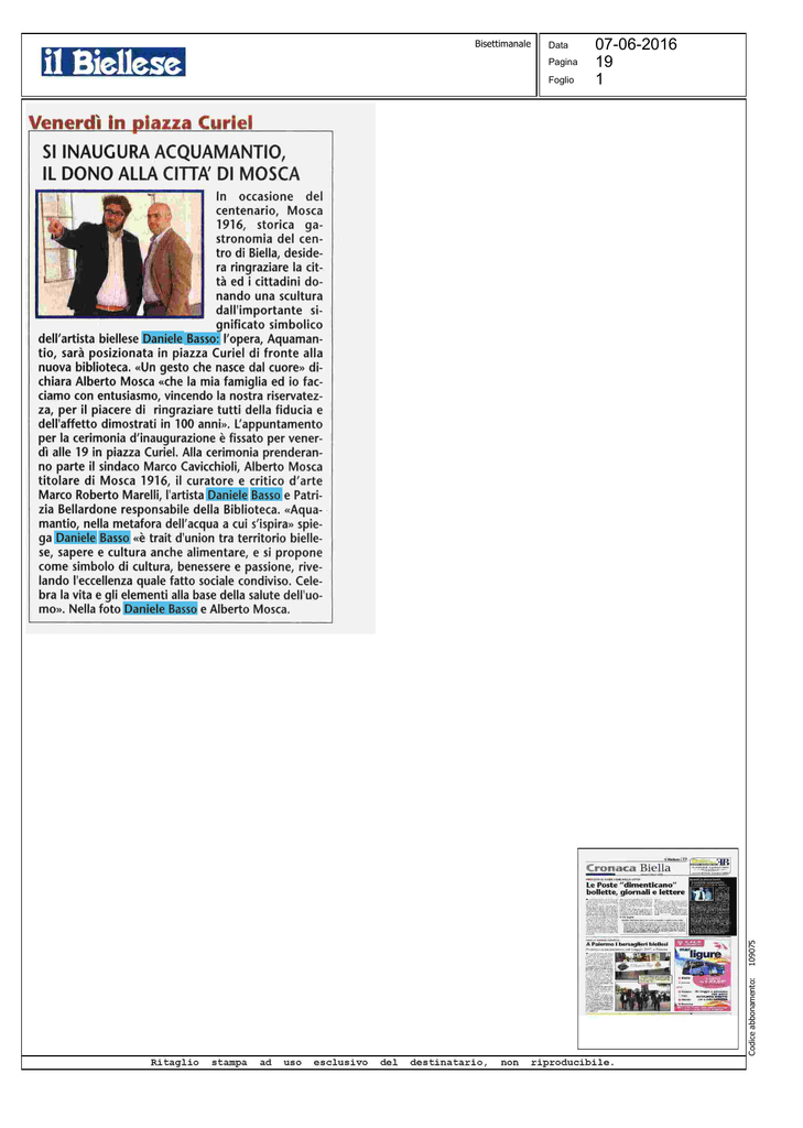 Pagina Foglio 07-06-2016 19 1 109075 Data Codice abbonamento: Bisettimanale