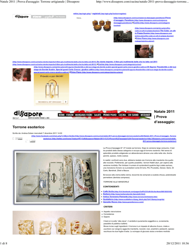 Natale 2011 | Prova d'assaggio: Torrone artigianale | Dissapore 1 di 8 http://www.dissapore.com/cucina/natale-2011-prova-dassaggio-torrone... entra (/wp-login.php) / registrati (/wp-login.php?action=register) (http://www.dissapore.com/cucina/prova-dassaggio-panettone/) Prova Cerca... d’assaggio: Panettone (http://www.dissapore.com/cucina/provadassaggio-panettone/) #Cucina (http://www.dissapore.com/categoria /cucina/) (http://www.dissapore.com/primo-piano/thecube-un-ufo-in-piazza-duomo/) The Cube: un ufo in Piazza Duomo (http://www.dissapore.com /primo-piano/the-cube-un-ufo-in-piazza-duomo/) #Primo Piano (http://www.dissapore.com /categoria/primo-piano/) (http://www.dissapore.com/cucina/se-niente-importa-il-libro-piu-inutilmente-bello-che-ho-letto-nel-2011/) Se niente importa: il libro più inutilmente bello che ho letto nel 2011 (http://www.dissapore.com/cucina/se-niente-importa-il-libro-piu-inutilmente-bello-che-ho-letto-nel-2011/) #Cucina (http://www.dissapore.com/categoria/cucina/) (http://www.dissapore.com/primo-piano/di-spyros-theodoridis-e-del-suo-stage-da-davide-scabin-special-guest-carlo-cracco-giudice-cattivo/) Di Spyros Theodoridis e del suo stage da Davide Scabin. Special guest Carlo Cracco: giudice cattivo (http://www.dissapore.com/primo-piano/di-spyros-theodoridis-e-del-suo-stage-da-davide-scabinspecial-guest-carlo-cracco-giudice-cattivo/) #Primo Piano (http://www.dissapore.com/categoria/primo-piano/) Natale 2011 | Prova d’assaggio: Torrone esoterico Scritto da: Andrea Soban mercoledì 7 dicembre 2011 14:03 (http://www.facebook.com/share.php?v=4&src=bm&u=http://www.dissapore.com/cucina/natale-2011-prova-dassaggio-torrone-esoterico/&t=Natale 2011 | Prova d’assaggio: Torrone esoterico) (http://twitter.com/home/?status=RT+%40dissapore+Natale+2011+%7C+Prova+d%27assaggio%3A+Torrone+esoterico+http://dissapore.com/cucina/natale2011-prova-dassaggio-torrone-esoterico/) La Prova d’assaggio N° 27 insiste sul torrone. Dopo la versione largo consumo, il test tra prodotti della stessa categoria si occupa oggi di torrone esoterico. Nel senso di splendido prodotto artigianale cui abbandonarsi almeno una volta nella vita. Anche perché, spesso, molto costosi. In realtà i confronti sono due, abbiamo testato sia il torrone alle mandorle che quello alle nocciole. Preferendo, per quanto possibile, i torroni friabili (duri, per capirci) alla versione morbida. Per limitare il numero di contendenti qualche big è stato escluso, una menzione d’onore va a produttori come Di Iorio, Pili, Pruneddu, Geraci, Serio, Di Carlo, Bandirali, Zilioli e Bauce. Ed eccoci alla crema della crema, leccornie da comprare a scatola chiusa, potendosele permettere (dentista compreso). TORRONE ALLE MANDORLE CONTENDENTI Caffè Sicilia (http://it-it.facebook.com/pages/Caff%C3%A9-Sicilia-Noto/59815635165) Barbero (http://www.barberodavide.it/prodotti.html) Antica Torroneria Piemonte (http://www.torrone.it/chisiamo.htm) Scaldaferro (http://www.scaldaferro.it/pag_black.php?id=11&lang=ita) Garzotto Rocco (http://www.garzottorocco.com/) CRITERI Aspetto visivo/colore Consistenza Sapore Il test si è svolto “alla cieca”, il verdetto è puramente soggettivo e, ovviamente, passibile di pubblico ludibrio. Breve inciso sugli ingredienti. Il torrone è un impasto di albume d’uovo, miele e zucchero cui vengono aggiunte mandorle, noccioli, noci, arachidi o pistacchi, spesso racchiuso tra due foglie d’ostia. Lo sciroppo di glucosio aiuta a rendere morbido 20/12/2011 10:36 Natale 2011 | Prova d'assaggio: Torrone artigianale | Dissapore 2 di 8 http://www.dissapore.com/cucina/natale-2011-prova-dassaggio-torrone... l’impasto, mentre la gelatina alimentare può sostituire l’albume d’uovo per abbreviare i tempi di cottura (ma il torrone sarà meno friabile). I 5 torroni alle mandorle non sono tutti friabili perché alcuni validi produttori realizzano solo la versione morbida (Caffè Sicilia). l torrone D. Barbero, si tratta di una tipologia completamente diversa dalle altre, inserita nel test esclusivamente perchè non è stato possibile acquistare la versione ‘classica’ alla mandorla. #5 Antica Torroneria Piemontese Formato 150gr. Ingredienti: mandorle (44%), miele, sciroppo di glucosio, ostia (fecola di patate, acqua, olio vegetale), gelatina alimentare. Può contenere tracce di altra frutta a guscio. Prodotto da Golosità dal 1885 s.p.A., via Piana Gallo 48 -12060 Grinzane Cavour (CN). Identikit: marchio gourmet creato da Sebaste, torronificio piemontese con 125 anni di storia. Giudizio: sapore un po’ deludente, manca la personalità. Packaging: barretta dall’incarto trasparente. Essenziale, anche troppo. Aspetto Visivo: classica stecca con le mandorle protagoniste. Gusto: delicato, equilibrato, senza lo spunto che ti aspetti da un torrone del genere. Domina la nota zuccherina. Prezzo: 22,6 € /al kg. Quindi € 3,40. Rapporto prezzo/felicità: corretto. In breve: onesto faticatore del centrocampo. VOTO: 7 #4 Caffe Sicilia Formato 200 gr. Ingredienti: mandorle di Noto pelate, miele degli Iblei, zucchero, ostia (amido di mais, acqua, oli vegetali), pistacchi di Bronte, albume. Mandorle minimo 55%. Caffè Sicilia s.r.l. – Noto – Italy. Identikit: Corrado Assenza è giustamente considerato un genio della pasticceria italiana. Un po’ scienziato pazzo, un po’ cuoco, panificatore e gelatiere, ha una missione: scardinare la dicotomia dolce-salato. Giudizio: solare, dal carattere marcatamente siciliano. Packaging: curata scatola in cartone che aperta svela il panetto di torrone sottovuoto. Aspetto Visivo: flusso copioso di mandorle con una nota di colore dovuta ai (pochi) pistacchi. Gusto: la mandorla N°1 esalta il sapore del torrone. Il pistacchio, malgrado tutto l’estro di Aseenza, sembra fuori luogo. Prezzo: 56 € /al kg. Quindi € 11,20. Rapporto prezzo/felicità: il più caro di tutti, le griffe, lo sappiamo, si pagano. In breve: estroso VOTO: 8 #3 Barbero Formato 100gr. Ingredienti: mandorle pizz