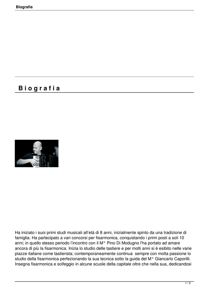 Biografia Biografia Ha iniziato i suoi primi studi musicali all’età di 8 anni, inizialmente spinto da una tradizione di famiglia. Ha partecipato a vari concorsi per fisarmonica, conquistando i primi posti a soli 10 anni; in quello stesso periodo l’incontro con il M° Pino Di Modugno l'ha portato ad amare ancora di più la fisarmonica. Inizia lo studio delle tastiere e per molti anni si è esibito nelle varie piazze italiane come tastierista; contemporaneamente continua sempre con molta passione lo studio della fisarmonica perfezionando la sua tecnica sotto la guida del M° Giancarlo Caporilli. Insegna fisarmonica e solfeggio in alcune scuole della capitale oltre che nella sua, dedicandosi 1/3 Biografia anche all’attività concertistica. Da anni si esibisce con la sua orchestra nelle più grandi balere romane e piazze del Lazio. Ha tenuto vari concerti e partecipato a diverse manifestazioni; nel 2008 è entrato a far parte della “Musictech Digital Accordion Orchestra”, la prima orchestra di fisarmoniche digitali che si è esibita per la prima volta il 15 ottobre 2008 al teatro Astra di Castelfidardo (Ancona) in occasione del 33° “Festival Internazionale della Fisarmonica”. Nell'aprile del 2009 in Germania si è esibito al Musikmesse di Francoforte dove ha tenuto un concerto presso l' Acoustic Stage ; a settembre 2009 ha tenuto 2 concerti presso il Teatro Comunale di Recoaro Terme (Vicenza). Ad ottobre 2009 ha partecipato al 34° “Festival Internazionale della Fisarmonica” di Castelfidardo e a novembre si è esibito in concerto in Inghilterra al “Seacroft Accordions International”. A dicembre 2009 ha partecipato all’ottava edizione del concorso “Musica senza parole”; nello stesso periodo si è esibito in teatro con la compagnia Rinascimento 2000 nello spettacolo “Il giudice Fausto e l’avvocato Mefisto. Storia di straordinaria corruzione” curando e interpretando la parte musicale dell’ opera. A marzo 2010 ha tenuto un concerto a Francoforte in occasione del Musikmesse 2010 e ad aprile ha partecipato al 1° festival “Fisarmoniche in crociera” esibendosi in concerto in Grecia, a Pireo e a Corfù, e a Dubrovnik in Croazia; ad agosto 2010 ha partecipato al 1° festival “Fisarmoniche nel Parco” tenendo un concerto a Pescasseroli (Aq). In occasione del 35° “Festival Internazionale della Fisarmonica”, tenutosi a Castelfidardo dal 5 al 10 Ottobre 2010, ha partecipato alla terza edizione del Music Reality Show durante il quale ha dato vita a varie jam sassions insieme a grandi artisti nazionali ed internazionale come Richard Galliano, Frank Marocco e Coba, inoltre si è esibito in concerto al teatro Astra e all’Auditorium di Castelfidardo. A novembre 2010 ha tenuto 2 concerti in Inghilterra al “Seacroft Accordions International. A gennaio 2011 si è esibito in concerto, accompagnato da un’orchestra di archi, al teatro “Il Mitreo” di Roma e a marzo dello stesso anno ha partecipato alla nona edizione del concorso “Musica senza parole” dove si è esibito con un brano inedito da lui composto e arrangiato; ad aprile 2011 ha tenuto un concerto in Germania presso l'Acoustic Stage in occasione del Musikmesse di Francoforte. Entrato a far parte del quartetto di fisarmoniche “Antonio Vivaldi” ad agosto 2011 ha tenuto un concerto di musica classica presso l’ Anfiteatro Comunale di Pietrabbondante (Isernia) e a settembre dello stesso anno si è esibito in concerto durante il 36° “Festival Internazionale della Fisarmonica” di Castelfidardo. A dicembre 2011 si è esibito al teatro Orione di Roma con lo spettacolo “L’uomo dal fiore in bocca” di Luigi Pirandello, del quale ha curato e interpretato la parte musicale. Nel 2011 diventa promoter della Giustozzi Accordions e da questa collaborazione, nel 2012, viene realizzata una fisarmonica professionale di alto livello modello Gianni Mirizzi. Da gennaio a giugno 2012 si è esibito al teatro Trastevere di Roma con lo spettacolo “Posta prioritaria”, tratto dall’omonima opera di Gianfranco Calligarich, in cui si fondono recitazione e musica. Nell’estate del 2012 nasce, dalla passione per la musica jazz e per l’improvvisazione, il “Gianni Mirizzi Project” trio composto da contrabbasso, batteria e fisarmonica. Nell’ aprile 2013 è in concerto al Musikmesse di Francoforte mentre a settembre è in concerto al “Festival Internazionale della Fisarmonica” di Castelfidardo, i primi di Ottobre tiene un concerto all’11° “Festival Internazionale della Fisarmonica Città di Massafra” e a metà ottobre ha tenuto dei concerti al “Shetland Accordion and Fiddle Festival” di Lerwick nelle Isole Shetland (Scozia). A Dicembre partecipa a diversi spettacoli teatrali nei più importanti teatri di Roma e tiene un concerto al Salone Margherita sempre a Roma. Nel 2014 tiene concerti in molte città italiane registrando sempre il tutto esaurito; inoltre, nello stesso anno, è impegnato in alcuni spettacoli teatrali. Il suo repertorio spazia tra vari generi: varieté, swing, jazz, blues, classico, leggero, liscio e latino americano. E’ autore di numerosi brani di musica leggera, 2/3 Biografia latino-americana, per fisarmonica solista e per orchestra di fisarmoniche; collabora con le Edizioni Musicali Berbén, Physa, Musicomania, Bagutti, Casa dell’organetto, Edicta Music, GDE e con le Edizioni musicali Musikverlag Wurzburger in Germania. Ai primi due CD ballabili, "By Marco" e "Ritmo solare", sono seguiti due CD d’ascolto, "Semplicemente per te" e “Il volo immaginario”, in cui i brani sono eseguiti con la sola fisarmonica per esaltare la bellezza di questo strumento. Nel Luglio 2014 esce il nuovo CD "Rosa dei venti". 3/3