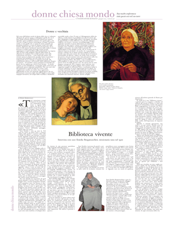 donne chiesa mondo Sua madre confrontava tutte queste cose nel suo cuore L’OSSERVATORE ROMANO giugno 2015 numero 36 Donne e vecchiaia Nel corso dell’ultimo secolo la durata della vita si è talmente allungata da arrivare quasi a raddoppiare quello che era il dato medio all’inizio dell’Ottocento, almeno per quanto riguarda i paesi cosiddetti avanzati. E in questa gara a chi vive più a lungo le donne mantengono ovunque il primato, anche se sono quelle che si curano di meno; quando poi prendono medicine, si tratta di farmaci testati solo sugli uomini. Qualcuno dice che è perché non lavorano, ma si tratta di una ipotesi facilmente smentita dalla realtà: le donne lavorano in media molto più degli uomini perché aggiungono ai ruoli familiari quelli professionali. La risposta vera sta forse nella maggiore capacità delle donne di affrontare la vecchiaia: non avendo puntato tutto sulla realizzazione nel lavoro — come fanno gli uomini, che entrano spesso in depressione quando vanno in pensione — accettano più facilmente una fase della vita in cui la realizzazione di sé è limitata ai rapporti personali, alle soddisfazioni affettive e all’esercizio della solidarietà. Proprio per questo — da quando è quasi scomparsa la mortalità per parto, che ha segnato per secoli il loro destino — le donne anziane si sono moltiplicate, assumendo anche ruoli nuovi ed esplorando spesso impensate possibilità. Che non sono solo fare ginnastica o curarsi di più di se stesse, come suggeriscono i media, ma anche, forse soprattutto, approfondire la loro vita spirituale. Quell’aspetto che era forzatamente trascurato negli anni del doppio se non triplo impegno lavorativo, nel tempo della vecchiaia è finalmente accessibile anche a loro. È come se l’allungamento della vita offrisse a molte donne la possibilità non solo di aiutare gli altri, allargando il raggio degli affetti e dei legami, ma anche di approfondire il senso della loro vita, del loro impegno religioso, con letture e incontri, con pellegrinaggi e ritiri spirituali, trovando in questa dimensione un nutrimento dell’anima di tipo nuovo. I primi a beneficiare di questo impegno sono i familiari, accompagnati nella preghiera con maggiore attenzione, ma anche tutte le persone che appartengono al loro gruppo sociale, che ne riconoscono la capacità rinnovata di aiuto e di ascolto. Se ci guardiamo intorno, vediamo che le donne anziane tengono in piedi il mondo: non solo come nonne che aiutano spesso in maniera insostituibile ad allevare i nipoti, ma anche come assistenti dei poveri e dei più anziani, come aiuto dei parroci nella vita di parrocchia, dove spesso impegnano il loro tempo improvvisamente libero. Ma anche, e non secondariamente, nella preghiera: le anziane sono capaci di sostenere per questa via la vita delle persone care, che spesso non ne sono neppure consapevoli. Ed è risaputo, come conferma suor Emidia, intervistata in prima pagina, che le donne sanno sopportare meglio la sofferenza fisica, e trasformare anche le crescenti sofferenze in nuove opportunità per lo spirito. La vecchiaia femminile quindi è potenzialmente carica di doni, tanto che gli uomini dovrebbero imparare da questo modello, come fa Simeone nel prendere in braccio il piccolo Gesù, rivelando una tenerezza materna. (lucetta scaraffia) Due famose pittrici alle prese con la vecchiaia al femminile: Frida Kahlo, «Ritratto di Donna Rosita Morillo» (1944, sopra) e Tamara de Lempicka, «La nonna» (1953, accanto). di MARIA BARBAGALLO utti conosciamo esempi eloquenti di anziani con una sorprendente giovinezza e vigoria dello spirito. Per chi li avvicina, essi sono di stimolo con le loro parole e di conforto con l’esempio. Possa la società valorizzare appieno gli anziani, che in alcune regioni del mondo — penso in particolare all’Africa — sono stimati giustamente come “biblioteche viventi” di saggezza, custodi di un patrimonio inestimabile di testimonianze umane e spirituali». Così scriveva nella Lettera agli anziani Giovanni Paolo II, e così riteniamo anche noi che abbiamo avuto la fortuna di vivere con persone anziane o molto anziane, capaci di insegnare ancora come vivere, come affrontare gli anni della decadenza fisica e psichica, come assumere l’attesa dell’ultimo passaggio, quello nella vita eterna. Suor Emidia è nata 95 anni fa. Nel 2004 ha avuto un grave ictus, è rimasta colpita nelle gambe e costretta sulla sedia a rotelle. La mente, per fortuna, è rimasta lucida. Qualche anno prima di ammalarsi, era ancora responsabile di una comunità e una scuola: con un po’ di ironia, a una consorella che le insinuava che era ormai troppo vecchia per fare la superiora aveva risposto che Papa Wojtyła e Carlo Azeglio Ciampi avevano la sua stessa età: uno dirigeva la Chiesa, l’altro l’Italia. Non credo ci sia stato orgoglio nella risposta di Emidia, era invece la dimostrazione che per lei la vecchiaia era una stagione della vita da vivere serenamente come se niente fosse. Era stata professoressa per molti anni, missionaria in Africa, segretaria generale, responsabile di un centro di spiritualità e tante altre cose: per questo le ho chiesto come ha vissuto questo cammino verso la vecchiaia, e come è coinciso con la malattia. «Non ho mai avuto la sensazione di diventare vecchia» ha risposto e riferendosi alla malattia ha aggiunto: «Tutto è stato un dono del Signore che è venuto improvvisamente; sentivo che veniva qualcosa di nuovo, avvertivo che la memoria non era più la stessa. Ma non sentivo fastidio, perché io ho donato tutto a Gesù per questo momento storico per la Chiesa, ma è un passaggio che sentivo venire lentamente». Poi suor Emidia ha raccontato di quel giorno quando è arrivato l’ictus: «Era il 31 maggio 2005, stavamo pregando il Vespro, avevo preparato tutto, ma durante le preghiere finali, a un tratto, non potevo più parlare, la bocca non si apriva più... la preghiera l’ha portata avanti un’altra suor