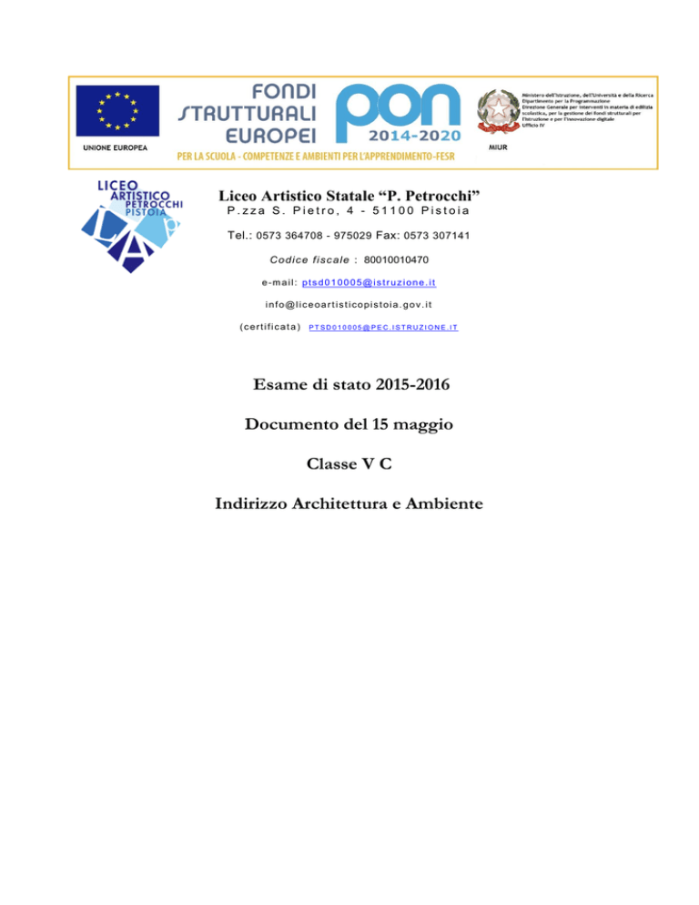 Liceo Artistico Statale “P. Petrocchi” P.zza S. Pietro, 4 - 51100 Pistoia Tel.: 0573 364708 - 975029 Fax: 0573 307141 C odice fisc ale : 80010010470 e-mail: [email protected] [email protected] (certificata) [email protected] Esame di stato 2015-2016 Documento del 15 maggio Classe V C Indirizzo Architettura e Ambiente Liceo Artistico P. Petrocchi Indice 1. Formazione consiglio di classe Consiglio di classe 2013/2014 Consiglio di classe 2014/2015 Consiglio di classe 2015/2016 2. Presentazione della scuola 3. Presentazione dell'Indirizzo di Architettura e Ambiente 4. Presentazione della classe V C 5. Obiettivi di apprendimento 6. Materia CLIL 7. Simulazioni delle prove d’esame 8. Metodologie didattiche e strumenti didattici funzionali all'insegnamento 9. Attività integrative e progetti 10. Allegati: – Allegato A: estratto del verbale del consiglio di classe – Allegato B: i programmi – Allegato C: curricula studenti – Allegato D: i crediti formativi – Allegato E: Simulazione prove – Allegato F: Griglie 11. Firme del C.d.c 2 Liceo Artistico P. Petrocchi Consiglio di classe 2013/2014 Docente Materia di insegnamento Ore settimanali Bruni Vinicio Laboratorio di Architettura Buscioni Piero Lingua e Letteratura Italiana, Storia Cappelli Elena Discipline Progettuali (Architettura e Ambiente) 6 Fiorentino Antonio Chimica 2 Fontani Roberto Scienze Motorie e Sportive 2 Giannessi Barbara Storia dell’Arte 3 Mancinelli Fabrizio Matematica, Fisica Mazzoncini Ilaria Lingua e Cultura Straniera (Inglese) 6 4, 2 2, 2 3 Michelucci Massimo Religione 1 Zarrella Andrea 2 Filosofia 3 Liceo Artistico P. Petrocchi Consiglio di classe 2014/2015 Docente Materia di insegnamento Ore settimanali Antonelli Roberto Scienze Motorie e Sportive 2 Bruni Vinicio Laboratorio di Architettura 6 Fiorentino Antonio Chimica 2 Mancinelli Fabrizio Matematica, Fisica Mazzoncini Ilaria Lingua e Cultura Straniera (Inglese) 3 Mazzoni Cecilia Maria Discipline Progettuali (Architettura e Ambiente) 6 Princi Eliana Storia dell’Arte 3 Ricciarelli Cristiano Religione 1 Tecleme Terenzio Filosofia 2 Tropea Antonella Lingua e Letteratura Italiana, Storia 2, 2 4 4, 2 Liceo Artistico P. Petrocchi Consiglio di classe 2015/2016 Docente Materia di insegnamento Ore settimanali Fallani Massimo Scienze Motorie e Sportive Mancinelli Fabrizio Matematica, Fisica Mazzoncini Ilaria Lingua e Cultura Straniera (Inglese) 3 Mazzoni Cecilia Maria Discipline Progettuali (Architettura e Ambiente) 6 Panelli Mario Laboratorio di Architettura 8 Princi Eliana Storia dell’Arte 3 Ricciarelli Cristiano Religione 1 Tavilla Igor Filosofia 2 Tropea Antonella Lingua e Letteratura Italiana, Storia 2 2, 2 5 4, 2 Liceo Artistico P. Petrocchi Presentazione della scuola Il Liceo Artistico “Policarpo Petrocchi” è una scuola che può vantare importanti tradizioni nel panorama scolastico pistoiese, con gli anni è diventata una realtà culturale e artistica di riferimento nel contesto territoriale della provincia di Pistoia e delle zone limitrofe; la sua storia è a testimonianza del continuo e costante impegno di “officina” formativa di giovani talenti e di valido contributo alla crescita qualitativa dell’imprenditorialità locale, con la quale ha da sempre privilegiato un rapporto di diretto contatto e collaborazione. Il Liceo Artistico si articola nei seguenti indirizzi: Arti Figurative Architettura e Ambiente Audiovisivo e Multimediale Design (della Moda e del Tessuto, del Gioiello e dell’Accessorio, Industriale) Grafica Presentazione dell’indirizzo di Architettura e Ambiente Durante il secondo biennio e nel monoennio finale si amplierà la conoscenza e l’uso dei metodi proiettivi del disegno tecnico orientandolo verso lo studio e la rappresentazione dell’architettura e del contesto ambientale, nonché dell’elaborazione progettuale della forma architettonica. Nell’approccio al processo della composizione architettonica è opportuno che gli studenti tengano conto della necessità di coniugare le esigenze estetiche e concettuali con quelle strutturali, i principi funzionali della distribuzione, con quelli basilari della statica, imparando a conoscere, orientare e sistematizzarne sia i dati quantitativi e qualitativi, sia i caratteri invarianti. Analizzeranno e applicheranno le procedure necessarie alla realizzazione di opere architettoniche esistenti o ideate su tema assegnato, attraverso elaborati grafici, e rappresentazioni con ausilio del disegno bidimensionale e tridimensionale CAD; sarà pertanto indispensabile proseguire e ampliare lo studio dei principi proiettivi, acquisire la conoscenza e l’esercizio delle proiezioni prospettiche e della teoria delle ombre, delle tecniche grafiche finalizzate all’elaborazione progettuale. Utilizzando supporti di riproduzione fotografica, cartografica e grafica, multimediale, modelli tridimensionali è necessario che si acquisiscano la capacità di analizzare e rielaborare opere architettoniche antiche, 6 Liceo Artistico P. Petrocchi moderne e contemporanee, osservando le interazioni tra gli attributi stilistici, tecnologici, d’uso e le relazioni con il contesto architettonico, urbano e paesaggistico. Durata del corso: La durata del corso è di 5 anni. Titolo rilasciato: DIPLOMA DI LICEO ARTISTICO indirizzo ARCHITETTURA E AMBIENTE Presentazione della classe 5a C La classe si presenta composta di 15 studenti dei quali: – 13 provenienti dalla stessa classe 3a; – 1 studentessa che si è aggiunta in 4a; – 1 studentessa che si è aggiunta in 5a. Gli studenti hanno una provenienza eterogenea: circa metà della classe proviene dalla Valdinievole, due da Agliana, una da Prato, due da Agliana, una da Lucca, una da Porretta Terme e solo due da Pistoia. L'elenco completo degli studenti che si presenteranno all’esame, previa ammissione, è il seguente: 1. Ammendola Elena 2. Armeni Linda 3. Battaglia Giulio 4. Betti Giulia 5. Buti Monica 6. Ciocca Eleonora 7. Frosini Lucrezia 8. Furman Gonçalve