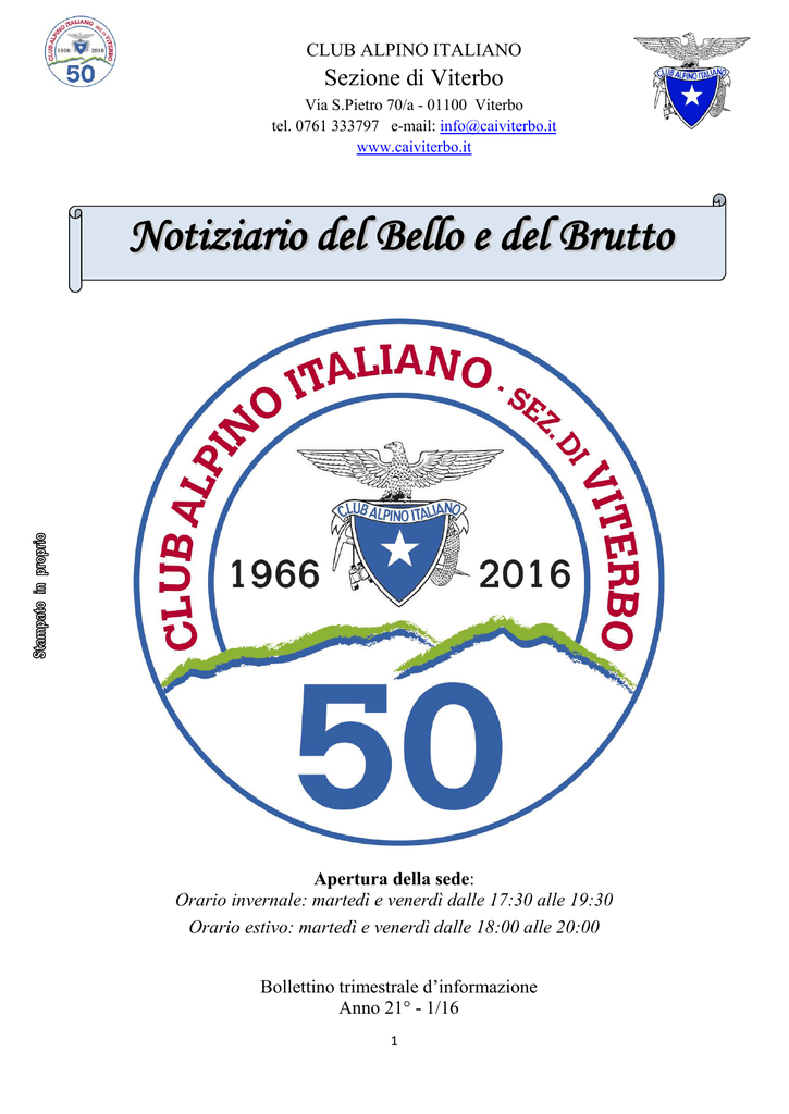CLUB ALPINO ITALIANO Sezione di Viterbo Via S.Pietro 70/a - 01100 Viterbo tel. 0761 333797 e-mail: [email protected] www.caiviterbo.it Notiziario del Bello e del Brutto Apertura della sede: Orario invernale: martedì e venerdì dalle 17:30 alle 19:30 Orario estivo: martedì e venerdì dalle 18:00 alle 20:00 Bollettino trimestrale d’informazione Anno 21° - 1/16 1 Programma sezionale Escursioni per eventuali aggiornamenti o variazioni consultare sempre il sito web del CAI di Viterbo: www.caiviterbo.it V 01/01/2016 Brindisi di Buon Anno sul Monte Palanzana (VT) Prima escursione del 2016, anno importantissimo per la nostra Sezione che compie 50 anni! Brindisi e prima colazione sulla vetta della Palanzana. Sono graditi bevande o dolci o altro da condividere. Partenza dal parcheggio COOP, Via Monte Cervino, ore 9:00. Rientro per pranzo. Accompagnatori: ASE C. Ceccariglia (3776603804); ASE D. Lai (3384300139) D 03/01/2016 Ciaspolata sui monti Simbruini. Camporotondo (AQ) Escursione ad anello dal piazzale impianti a Croce Campitelli, Fosso Fioio, fontanile Campitelli. Difficoltà EAI (ciaspole/sci escursionismo). Dislivello 400 m circa. Tempo di percorrenza 6 ore circa soste escluse. Pranzo al sacco. Partenza da Piazzale Romiti ore 6:30 con mezzi propri (pullman se si raggiunge un numero minimo di partecipanti). Accompagnatori: ORTAM A. Di Grottole (3473459355); ORTAM I. Berni (3488861919) D 10/01/2016 Gruppo Velino-Sirente. Monte La Torricella (AQ) Escursione ad anello dal valico della Chiesuola, per cresta, alla vetta. Ritorno per la valle del Morretano. Difficoltà EAI (ciaspole/sci escursionismo). Dislivello 500 m circa. Tempo di percorrenza 6 ore circa soste escluse. Pranzo al sacco. Partenza da Piazzale Romiti ore 6:30 con mezzi propri (pullman se si raggiunge un numero minimo di partecipanti). Accompagnatori: ORTAM I. Berni (3488861919); D.diE. A. Costantini (3333260196) D 17/01/2016 Titignano, Roccaccia, Lago di Corbara (TR) Escursione ad anello, attraverso antichi sentieri, per i castelli che in periodo medievale sorgevano sulla linea di confine tra gli antichi comuni di Todi e Orvieto. Durante il tragitto visite al Castello di Titignano, alle gole del Forello, alla Chiesa di Santa Romana (parzialmente sommersa dalle acque dopo la costruzione della diga di Corbara), al Castello della Roccaccia e a Casa Castello. Difficoltà E (brevi tratti scoscesi). Dislivello 400 m circa. Tempo di percorrenza 5 ore circa soste escluse. Pranzo al sacco. Partenza da Piazzale Romiti ore 7:30 con mezzi propri (pullman se si raggiunge un numero minimo di partecipanti). Accompagnatori: AE M. Olimpieri (3335345224); Salani 2 D 24/01/2016 Monte Calvo (1898m) - (AQ) Dal km 14,600 della ss 17, Sella di Corno, direttissima alla vetta. Per le particolari condizioni climatiche, è chiamata anche la Montagna dei Fiori. Panorami di grande rilievo. Itinerario tecnico nella parte terminale. In base all’innevamento potranno essere effettuate delle varianti. Difficoltà EAI (ciaspole/sci escursionismo). Dislivello 900 m circa. Tempo di percorrenza 6/7 ore circa soste escluse. Pranzo al sacco. Partenza da Piazzale Romiti ore 6:30 con mezzi propri. Accompagnatori: D.di E. M. Di Carlo (3357125369); D.diE. A. Costantini (3333260196) D 07/02/2016 Monte Utero (1808m) – Sibillini (PG) Dal valico di Forca Canapine ai Pantani di Accumuli, verso Mt dei Signori e per cresta alla vetta. Difficoltà EAI (ciaspole/sci escursionismo). Dislivello 500 m circa. Tempo di percorrenza 6 ore circa soste escluse. Pranzo al sacco. Partenza da Piazzale Romiti ore 6:30 con mezzi propri (pullman se si raggiunge un numero minimo di partecipanti). Accompagnatori: ORTAM A. Di Grottole (3473459355); ORTAM I. Berni (3488861919) D 21/02/2016 Castelluccio di Norcia (PG) Anello intorno al monte Abuzzago (1630m), passando per capanna Ghezzi. Difficoltà EAI (ciaspole/sci escursionismo). Dislivello 300 m circa. Tempo di percorrenza 6 ore circa soste escluse. Pranzo al sacco. Partenza da Piazzale Romiti ore 6:30 con mezzi propri (pullman se si raggiunge un numero minimo di partecipanti). Accompagnatori: ORTAM A. Di Grottole (3473459355); D.diE. A. Costantini (3333260196) S-D 27-28/02/2016 Mt. Turchio (mt 1898) Mt Palombo (mt 2013) (AQ) Due giorni nel Parco Nazionale d’Abruzzo. 1° giorno: Dal Rif del Diavolo, giro e salita a Mt Turchio. Difficoltà EAI (ciaspole/sci escursionismo). Disl. 600 m ca. tempo di percorr. 6 ore soste escluse. Pranzo al sacco. 2° giorno: giro di mt Palombo, salita cresta Est e discesa per capanna Blasutti. Difficoltà EAI (ciaspole/sci escursionismo). Disl. 700 m ca. tempo di percorr. 6 ore soste escluse. Pranzo al sacco. Pernottamento in Agriturismo a Pescasseroli (45 euro ca. 1/2 pensione). Prenotazione obbligatoria entro il 9 febbraio con il versamento di un anticipo di 20 euro. Partenza da Piazzale Romiti sabato 19 ore 6:30 con mezzi propri. Accompagnatori: ORTAM I. Berni (3488861919); D.di E. P. Pickl (3338128438); D.di E. M. Di Carlo (3357125369) 3 D 6/03/2016 Da San Quirico a Sorano (GR) L'itinerario inizia da San Quirico. A poca distanza si trova la Via Cava di "S.Rocco", che conduce alla Valle del Fiume Lente. Si prosegue fino ad arrivare a Vitozza, località costituita da uno sperone tufaceo, dove vi sono all'incirca 200 abitazioni rupestri, occupate dal XII sec. alla seconda metà del XVIII. Da qui si raggiungere Sorano con la necropoli di S.Rocco lungo la S.P. per Sovana. Il complesso rupestre di San Rocco è costituito da tombe etrusche e da grotte più recenti, fra le quali si distingue una fornace alto-medievale. Difficoltà E . Dislivello 200 m. Lunghezza percorso 8 km circa. Tempo di percorr. 5 ore soste escluse. Pranzo al sacco. Partenza da Piazzale Romiti alle ore 8:00 con mezzi propri (pullman se si raggiunge un numero minimo di partecipanti). Accompagnatori: D.diE. F.Bruzziches (3404967469); D.diE. R.Fanelli (3491060544) D 13/03/2016 Promontorio dell’Argentario (GR) Traversata del promontorio dell