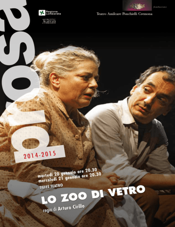 fondaz i one i s o r p Teatro Amilcare Ponchielli Cremona 2014-201 5 0 io o r e 2 0 .3 0 a n n e g 0 2 2 0 .3 martedi e n n a io o r e g 1 2 i d le merco RO tro e v i d Lo ZoCiro illo TIEFFE TEAT ro regia di Artu TIEFFE TEATRO Lo Zoo di vetro di Tennessee Williams traduzione di Gerardo Guerrieri Personaggi ed Interpreti Amanda / Milvia Marigliano Laura / Monica Piseddu Tom / Arturo Cirillo Jim / Edoardo Ribatto scene Dario Gessati costumi Gianluca Falaschi luci Mario Loprevite assistente regia Giorgio Castagna assistente scenografie Lucia Rho regia Arturo Cirillo Durata dello spettacolo: 1 ore e 40 minuti senza intervallo “Lo zoo di vetro di Williams rappresenta l’inganno dell’immaginario, non è casuale la grande importanza, data dall’autore, all’atto del proiettare. Il riflettore teatrale che il narratore/figlio punta sui personaggi, i molteplici film nei cinema dove si rifugia Tom per sfuggire alla realtà, e anche gli stessi animaletti di vetro che compongono lo zoo del titolo sono l’emblema della fragilità e della finzione: sono essenze quasi prossime all’assenza, non a caso trasparenti” (Arturo Cirillo). Il dramma di Williams, scritto nel 1944, è incentrato sulle vicende della famiglia Wingfield, che si palesano uscendo dalla memoria del suo più giovane componente, Tom. I ricordi restituiscono le figure, ormai lontane ma sempre presenti, di Amanda, madre possessiva, ancorata al ricordo di una giovinezza da tempo sfiorita e ad un marito che se ne è andato per altri lidi troppo presto, e della sorella zoppa Laura, creatura gentile e fragile, proprio come le figurine dello zoo di vetro che conserva gelosamente tra le sue cose più preziose. Senza aspirazioni e progetti futuri, Laura è spinta dalla madre a cercare una relazione che la faccia uscire dalla costante apatia che la possiede. Ma ecco che i ricordi si concentrano su una sera particolare, quando l’improvviso agognato invito a cena di un collega di Tom, Jim, viene accettato e sembra accendere le speranze di un futuro migliore per le due donne. Sarà solo un piccolo lampo, presto oscurato dalla dura realtà della solitudine, e Tom deciderà finalmente di smettere di nutrirsi di cinema e di andarsene come il padre, lasciando il modesto lavoro che lo occupa e le due donne per cercarsi un futuro migliore, anche se pieno di incertezze. È il fallimento di una famiglia il centro della vicenda, una madre che vive nel ricordo di una giovinezza dorata, un gruppo di ex-giovani ormai senza più età. Lo zoo di vetro è “un dramma di memoria”, secondo la definizione dello stesso Tennessee Williams, un testo dalla doppia natura: realistico nella descrizione dei rapporti tra i personaggi, ma totalmente onirico rispetto al tempo della vicenda e al tempo della sua rappresentazione. Potente messa in scena dell’atto del ricordare e del rapporto con il passato come luogo del rimpianto: “Il futuro diventa presente, il presente passato, e il passato un eterno rimpianto” si dice nel testo. i prossimi spettacoli di gennaio e febbraio 30 gennaio ore 20.30 TEATRO DELL’ELFO / TEATRO STABILE DELL’UMBRIA FROST/NIXON GOLDENART PRODUCTION RE LEAR di William Shakespeare traduzione e adattamento Michele Placido e Marica Gungui Fondazione Teatro Amilcare Ponchielli Cremona Biglietteria (ore 10.30 - 13.30 e ore 16.30 - 19.30) tel. 0372.022.001 e 0372.022.002 Biglietteria on-line: www.vivaticket.it e-mail: [email protected] www.teatroponchielli.it progetto grafico: Corrado Testa 7e 8 febbraio ore 20.30 esecutivi digitali: Service Lito stampa: Fantigrafica di Peter Morgan regia Ferdinando Bruni e Elio de Capitani