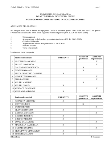 Verbale CCLIC n. 160 del 18.05.2015 pag. 1 UNIVERSITÀ DELLA CALABRIA DIPARTIMENTO DI INGEGNERIA CIVILE CONSIGLIO DEI CORSI DI STUDIO IN INGEGNERIA CIVILE ADUNANZA DEL 18.05.2015 Il Consiglio dei Corsi di Studio in Ingegneria Civile si è riunito giorno 18.05.2015, alle ore 12.00, presso l’Aula Seminari del cubo 45/B, con il seguente ordine del giorno (prot. n. 320 del 12.05.2015): 1. 2. 3. 4. 5. 6. Comunicazioni Approvazione verbale seduta precedente (verbale n.159 del 26.03.2015) Questioni didattiche Approvazione schede insegnamenti a.a. 2015-2016 Pratiche studenti Varie ed eventuali L’adunanza è così composta: Professori ordinari PRESENTI ASSENTI giustificati 1 ALFONSI GIANCARLO 2 BRUNO DOMENICO X 3 CALOMINO FRANCESCO X 4 DENTE GIOVANNI X 5 FESTA DEMETRIO CARMINE ASSENTI ingiustificati X X 6 NICOLETTI GIOVANNI X 7 PIRO PATRIZIA X 8 VELTRI MASSIMO 9 VELTRI PAOLO X X 10 VERSACE PASQUALE X 11 VULCANO ALFONSO X Professori associati PRESENTI 1 ASTARITA VITTORIO X 2 CONTE ENRICO X X 5 GARCEA GIOVANNI X 6 GAUDIO ROBERTO X 7 GRECO FABRIZIO X 8 LOPEZ SALVATORE 9 MAZZULLA GABRIELLA X X 10 OMBRES LUCIANO X 11 PRINCIPATO GIANCARLO X 12 SCHIOPPA MARCO X Il Presidente ASSENTI ingiustificati X 3 CURCIO EFREM 4 FRANCINI MAURO ASSENTI giustificati Il Segretario Verbale CCLIC n. 160 del 18.05.2015 13 TRONCONE ANTONELLO Ricercatori pag. 2 X PRESENTI 1 ARTESE GIUSEPPE X 2 BENCARDINO FRANCESCO X 3 CAIRO ROBERTO X 4 DE BARTOLO SAMUELE ASSENTI giustificati ASSENTI ingiustificati X 5 DE LUCA DAVIDE LUCIANO X 6 DE LUCA PIERANTONIO X 7 D'IPPOLITO ANTONINO X 8 EBOLI LAURA X 9 FIORINI MOROSINI ATTILIO X 10 FREGA FERDINANDO 11 GUIDO GIUSEPPE X X 12 KVASOV DMITRY 13 MAZZA FABIO X X 14 PASQUA LUIGI 15 PORCO ANTONELLO GIACINTO X X 16 TROMBETTA ALESSANDRO X 17 VAIANA ROSOLINO X 18 CARBONE MARCO Rappresentanti Studenti X PRESENTI 1 MANGANO ANTONIO ASSENTI giustificati X 2 PETTINATO GIOVANNI X 3 SPINA ROBERTO X Professori a contratto PRESENTI 1 CASCIARO RAFFAELE 2 GALLELLI VINCENZO ASSENTI giustificati ASSENTI ingiustificati ASSENTI ingiustificati X X 3 GUERRICCHIO ALESSANDRO X 4 PARISE FEDERICO X Presiede l’adunanza il prof. Demetrio Carmine Festa, Coordinatore del CCdS, è segretario la prof.ssa Gabriella Mazzulla. È presente la dott.ssa Maria Gencarelli, manager didattico dei CdS. Il Presidente, constatata la presenza del numero legale, dichiara valida l’adunanza. 1. Comunicazioni 1.1 Richiesta dei rappresentanti degli studenti inerente le propedeuticità Il Presidente informa che a firma dei rappresentati degli studenti è pervenuta la richiesta di rivedere alcune propedeuticità del corso di Studi in Ingegneria civile, come peraltro fu chiesto in una assemblea dello scorso anno confermata in altre successive richieste. Il Presidente Il Segretario Verbale CCLIC n. 160 del 18.05.2015 pag. 3 Il Presidente ricorda la materia deve essere approfondita in occasione della revisione del Regolamento didattico, e si impegna a portarla in discussione in un prossimo Consiglio in maniera tale che le modifiche introdotte possano essere valide già a partire dall’a.a. 2015-2016. 1.2 Test TECO 2015 Il Presidente informa che il prossimo 28 maggio l'Università della Calabria parteciperà alla seconda sperimentazione del test TECO 2015, che verrà somministrato dall'ANVUR (Agenzia Nazionale di Valutazione del sistema Universitario e della Ricerca) per valutare le capacità trasversali degli studenti in materia di ragionamento analitico, soluzione di problemi e comunicazione scritta. Esso coinvolgerà gli studenti iscritti al terzo anno del Corso di studio in Ingegneria Civile che hanno acquisito un numero di CFU di base e caratterizzanti almeno pari al 75% di quello minimo previsto dalla declaratoria della classe di laurea. Gli studenti del CdS che possiedono i requisiti per partecipare al test sono 67. Gli studenti interessati sono stati invitati personalmente, mediante una email inviata al proprio indirizzo istituzionale, a preiscriversi al test entro il 26 maggio. Il risultato del TECO sarà utile a rilevare statisticamente eventuali criticità o eccellenze presenti nei vari Corsi di Studio e quindi per aiutare l'Università della Calabria a migliorare la propria attività didattica. Il test si svolgerà in modalità on-line presso le aule attrezzate della nostra università, e durerà 90 minuti: 60 minuti per la prima parte del test a risposta aperta e 30 minuti per la successiva parte a risposta chiusa. Il Presidente comunica che il Direttore ha indicato come docente responsabile del test per il CdL in Ingegneria Civile la prof.ssa Mazzulla. 2. Approvazione verbale seduta precedente 2.1 Verbale n. 159 del 26.03.2015 Il Presidente comunica che è non pervenuta alcuna richiesta di integrazione o di modifica al verbale n. 159 della seduta del 26.03.2015, e propone l’approvazione dello stesso. Il Consiglio, all’unanimità, approva. 3. Questioni didattiche Nulla da deliberare. 4. Approvazione schede insegnamenti a.a. 2015-2016 Il Presidente rileva che, pur nel breve tempo a disposizione, grazie alla collaborazione di tutti i colleghi, è stato possibile riformulare le schede degli insegnamenti secondo il nuovo formato richiesto dall’Ateneo; tale revisione non è stata solo formale, in quanto è stato compiuto un effettivo sforzo per il coordinamento dei contenuti dei vari insegnamenti e l’adeguamento dei carichi didattici ai crediti degli insegnamenti stessi. Peraltro il lavoro svolto non costituisce un punto di arrivo, ma è un importante passo verso la definizione del Sillabo delle competenze nell’Ingegneria civile, che dovrà essere affrontato nei prossimi consigli. Ricorda inoltre che per la riformulazione delle schede ha avuto incontri con i rappresentanti di tutti le aree disciplinari dell’ingegneria, e che in precedenza aveva da tempo avviato incontri con i docenti delle Matematiche e delle Fisiche, i quali hanno mostrato molta sensibilità e disponibilità verso la problematica. Ringrazia infine i co