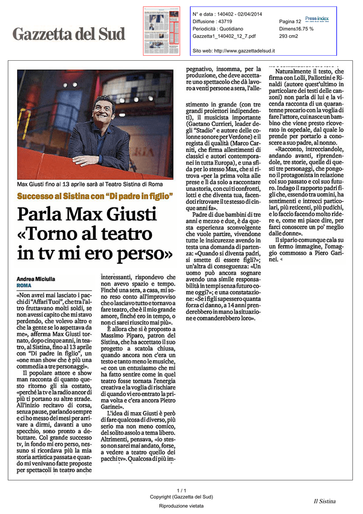 N° e data : 140402 - 02/04/2014 Diffusione : 43719 Periodicità : Quotidiano Gazzetta1_140402_12_7.pdf Pagina 12 : Dimens.16.75 : % 293 cm2 Sito web: http://www.gazzettadelsud.it impegnativo , insomma , per la Naturalmente il testo che firma con Lolli Pallottini e Rinaldi ( autore quest' ultimo in particolare dei testi delle canzoni non parla dilui e la ) , produzione che deve uno spettacolo che dà aventi persone a sera Falle , , accettare lavoro , stimento in grande ( grandi proiettori con tre il musicista importante ( Gaetano Currieri leader " Stadio " e autore delle colonne sonore per Verdone ) e il regista di qualità ( Marco ,che firma allestimenti di classici e autori in tutta Europa ) e una sfida per lo stesso Max che si ritrova « per la prima volta alle prese e li da solo a raccontare una storia con cui ti confronti lotti e che diventa tua ritrovare il te stesso di cinque anni fa ». Padre di due bambini di tre anni e mezzo e due è da esperienza sconvolgente che vuole partire vivendone tutte le insicurezze avendo in testa una domanda di « Quando si diventa padri si smettedi essere figli? » un' altra di conseguenza « Un uomo pu? ancora sognare avendo unasimile in tempi senza futuro come oggi? » e una « Se i figli sapessero quanta forza ci danno a 14 anni prenderebbero in mano la e comanderebbero loro ». indipendenti ), , degli Carniti contemporanei vicenda , ' , aprile sarà al TeatroSistina di Roma ,Iccesso al Sistina con " Di padre in figlio , " , , facendoti Parla Max Giusti « Torno al teatro in tv mi eroperso , questa , » partenza , : ; che viene presto bambino in ospedale dal quale lo per portarlo a conoscere a suo padre al nonno. « Racconto intrecciandole andando avanti trestorie quelle di ricoverato , prende , , riprendendole questi pongono , , tre personaggi che il protagonista in relazione , col suo passato e col suo Indago il rapporto padri futuro . che essendo tra uomini ha sentimenti e intrecci più reticenti più pudichi e lo faccio facendo molto e comemipiace dire per figli , particolari ridere , , , , farci conoscere un dalle donne , po' meglio ». sipario comunque cala su un fermo immagine l commosso a Piero Il ' , omaggio Garinei. : interessanti rispondevo che Andrea Miciulla , non avevo spazio e ROMA « Non avrei mai lasciato i di " Affari Tuoi " , che tra l pacchi , non avessi , , , , , , commedia a tre personaggi ». Il popolare attore e show man racconta diquanto ritorno gli sia costato « perché la tv e la radio ancor di più ti portano su altrestrade. All inizio recitavo di corsa senza pause parlando sempre e ci ho messo dei mesi per arrivare a dirmi ,davanti a uno specchio sono pronto a debuttare Col grande successo tv infondo mi ero perso nessuno si ricordava più la mia storia artistica passata e mi venivano fatte proposte per spettacoli inteatro anche questo , ' , , , . , , , , ' ' fruttavano molti soldi se capito che mi stavo perdendo che volevo altro e che la gente se lo aspettava da me » afferma Max Giusti tornato dopo cinque anni in teatro al Sistina ,fino al 13 aprile " " con Di padre in figlio un « one man show che è più una altro tempo. una sera a casa mi sono reso conto all improvviso che o lasciavo tutto e tornavo a fare teatro che è il mio grande amore finché ero in tempo o non ci sarei riuscito mai più ». allora che si è proposto a Massimo Piparo patron del Sistina che ha accettato il suo progetto a scatola chiusa quando ancora non c' era un testo e tanto meno le musiche «e con un entusiasmo che mi ha fatto sentire come inquel teatro fosse tornata l energia creativa e la voglia di rischiare di quando vi ero entrato la prima volta e c' era ancora Pietro Finché , , , responsabilità ; constatazione : , situazione , , , , ' Garinei ». L idea di maxGiusti è per? di fare qualcosa di diverso più serio ma non meno comico del solito assolo a tema libero. Altrimenti pensava « io ' , , , , non sarei mai andato forse a vederea teatro quello dei pacchi tv » Qualcosa di più stesso , , . quando 1/1 Copyright (Gazzetta del Sud) Riproduzione vietata , , , Max Giusti fino al 13 racconta di un precario con la voglia di fare l attore cui nasce un quarantenne Il Sistina ,
