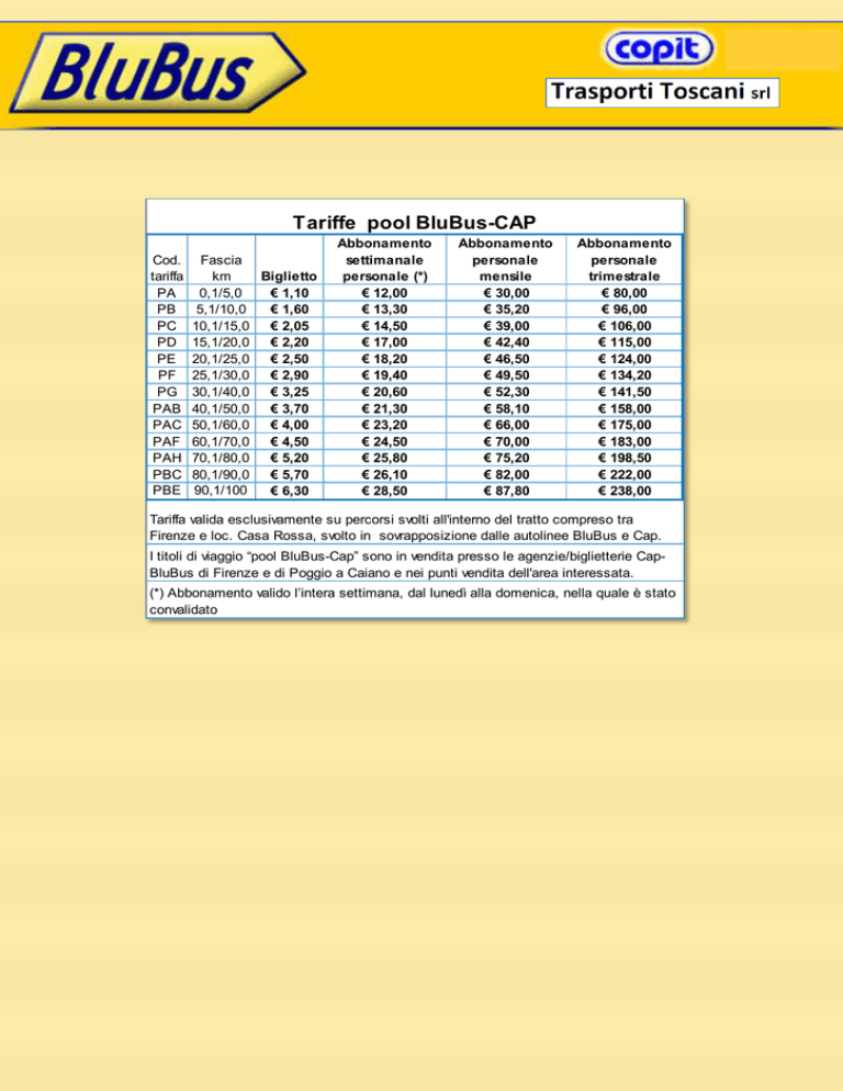 Tariffe pool BluBus-CAP Cod. tariffa PA PB PC PD PE PF PG PAB PAC PAF PAH PBC PBE Fascia km Biglietto 0,1/5,0 € 1,10 5,1/10,0 € 1,60 10,1/15,0 € 2,05 15,1/20,0 € 2,20 20,1/25,0 € 2,50 25,1/30,0 € 2,90 30,1/40,0 € 3,25 40,1/50,0 € 3,70 50,1/60,0 € 4,00 60,1/70,0 € 4,50 70,1/80,0 € 5,20 80,1/90,0 € 5,70 90,1/100 € 6,30 Abbonamento settimanale personale (*) € 12,00 € 13,30 € 14,50 € 17,00 € 18,20 € 19,40 € 20,60 € 21,30 € 23,20 € 24,50 € 25,80 € 26,10 € 28,50 Abbonamento personale mensile € 30,00 € 35,20 € 39,00 € 42,40 € 46,50 € 49,50 € 52,30 € 58,10 € 66,00 € 70,00 € 75,20 € 82,00 € 87,80 Abbonamento personale trimestrale € 80,00 € 96,00 € 106,00 € 115,00 € 124,00 € 134,20 € 141,50 € 158,00 € 175,00 € 183,00 € 198,50 € 222,00 € 238,00 Tariffa valida esclusivamente su percorsi svolti all'interno del tratto compreso tra Firenze e loc. Casa Rossa, svolto in sovrapposizione dalle autolinee BluBus e Cap. I titoli di viaggio “pool BluBus-Cap” sono in vendita presso le agenzie/biglietterie CapBluBus di Firenze e di Poggio a Caiano e nei punti vendita dell'area interessata. (*) Abbonamento valido l’intera settimana, dal lunedì alla domenica, nella quale è stato convalidato