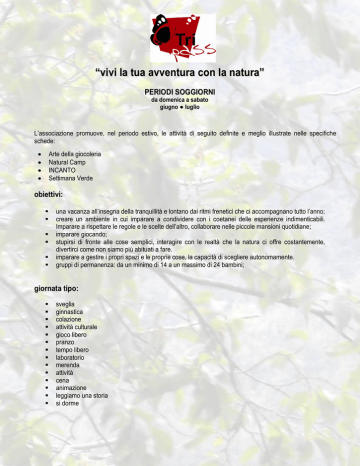 “vivi la tua avventura con la natura” PERIODI SOGGIORNI da domenica a sabato giugno ● luglio L’associazione promuove, nel periodo estivo, le attività di seguito definite e meglio illustrate nelle specifiche schede: Arte della giocoleria Natural Camp INCANTO Settimana Verde obiettivi: una vacanza all’insegna della tranquillità e lontano dai ritmi frenetici che ci accompagnano tutto l’anno; creare un ambiente in cui imparare a condividere con i coetanei delle esperienze indimenticabili. Imparare a rispettare le regole e le scelte dell’altro, collaborare nelle piccole mansioni quotidiane; imparare giocando; stupirsi di fronte alle cose semplici, interagire con le realtà che la natura ci offre costantemente, divertirci come non siamo più abituati a fare. imparare a gestire i propri spazi e le proprie cose, la capacità di scegliere autonomamente. gruppi di permanenza: da un minimo di 14 a un massimo di 24 bambini; giornata tipo: sveglia ginnastica colazione attività culturale gioco libero pranzo tempo libero laboratorio merenda attività cena animazione leggiamo una storia si dorme tema: In linea con EXPO 2015, l’associazione intende sviluppare le tematiche legate al rapporto con il cibo. In questi anni di esperienza abbiamo sempre sottolineato l’importanza di una corretta alimentazione proponendo, ai giovani ospiti, una dieta varia ed equilibrata e cercando di far conoscere, attraverso il gioco, gli alimenti fondamentali per la loro crescita. L’alimentazione non è soltanto l’ovvio rifornimento al nostro organismo ma è fondamento di un sano sviluppo fisico e mentale. Mangiare è anche un piacere fondamentale della vita, accessibile a tutti e di cui nessuno può fare meno. Un piacere che ci unisce agli altri. La tradizione alimentare è uno specchio della nostra vita che si evolve con i tempi, e ci dice chi siamo, e a quale comunità apparteniamo. Per tutte queste ragioni, “il cibo è vita”. Per questo motivo abbiamo sviluppato, all’interno delle diverse iniziative, questo importante tema che diventerà il filo conduttore per tutta l’ estate. E’ importante far riflettere, non solo, sulla corretta alimentazione ma anche sullo spreco del cibo. Le attività proposte avranno l’obiettivo di far apprendere ai ragazzi, con nozioni semplici ma efficaci, le base per un’alimentazione sana ed equilibrata e verranno indicati i cibi da eliminare o, quantomeno, da ridurre ai minimi termini: i cosiddetti cibi spazzatura. Bastano pochi e semplici “ingredienti” per ottenere un ottimo risultato purché siano conditi con un pizzico di creatività e tanta fantasia. Il tema di quest’anno vuole essere un invito ad una consapevolezza comportamentale che, fin dalla più tenera età, produce buoni effetti anche nelle cose di tutti i giorni. laboratori: cucina (marmellata con le fragoline di bosco, sciroppo al sambuco, biscotti con le noci, olio aromatico, preparazione di primi e secondi piatti) manipolazione: creiamo semplici oggetti anche mediante la composizione degli elementi che la natura ci offre (la palla con riso e farina, il notes in cui raccogliamo le esperienze della settimana), impariamo a recuperare gli oggetti di scarto, componiamo divertenti e affascinanti composizioni con gli oggetti dati; osservazione: la volta celeste; naturalistici le foglie: attraverso un simpatico gioco di puzzle impareremo a riconoscere le foglie dei grandi alberi. riqualificazione sentiero: individuazione delle essenze principali mediante la realizzazione e collocazione lungo il sentiero dei cartellini di riconoscimento. Percorso naturalistico in compagnia di riccio SCHIZZO che aiuterà i giovani escursionisti nella classificazione delle essenze tipiche della Val Cavallina. giochi: libero; giochi da non dimenticare; giochi a squadre; tornei; manipolazione; tiro con l’arco; gioco notturno escursioni: percorso naturalistico per il CESULI’ passeggiata lungo i sentieri presenti nella zona visita al lago di Endine visita alle grotte di Entratico visita al museo di Casazza conclusioni: Dalle esperienze delle edizioni passate si è voluto impostare il programma affinché non fosse definito nel dettaglio. L’obiettivo vuole garantire una permanenza rilassante con momenti di libertà e di autogestione pur sempre sotto il controllo vigile degli assistenti. L’area e la struttura sono organizzate in modo da garantire ai ragazzi di muoversi nelle diverse aree nella massima sicurezza. Una permanenza orientata verso il gioco e l’attività di gruppo per vivere a contatto con la natura, garantire l’aggregazione e la partecipazione dei ragazzi attraverso gruppi contenuti: da un minimo di 14 ad un massimo di 24 ospiti.