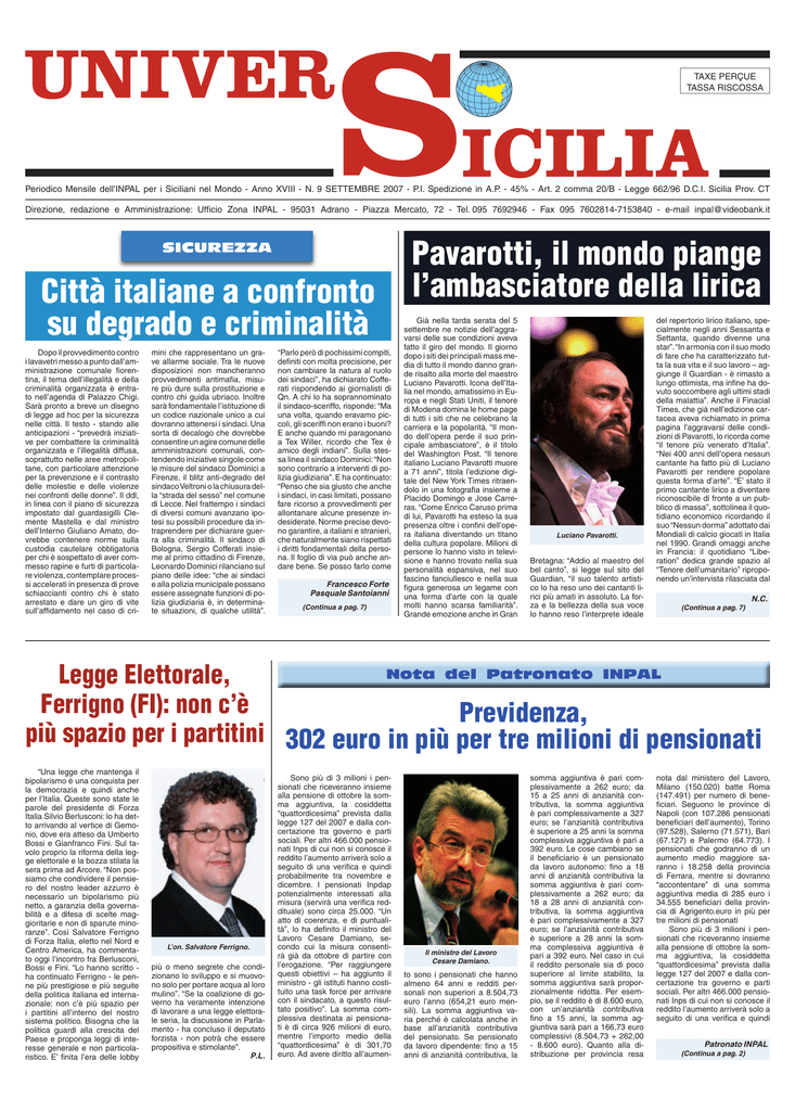 TAXE PERÇUE TASSA RISCOSSA Periodico Mensile dell’INPAL per i Siciliani nel Mondo - Anno XVIII - N. 9 SETTEMBRE 2007 - P.I. Spedizione in A.P. - 45% - Art. 2 comma 20/B - Legge 662/96 D.C.I. Sicilia Prov. CT Direzione, redazione e Amministrazione: Ufficio Zona INPAL - 95031 Adrano - Piazza Mercato, 72 - Tel. 095 7692946 - Fax 095 7602814-7153840 - e-mail [email protected] Sicurezza Città italiane a confronto su degrado e criminalità Dopo il provvedimento contro i lavavetri messo a punto dall’amministrazione comunale fiorentina, il tema dell’illegalità e della criminalità organizzata è entrato nell’agenda di Palazzo Chigi. Sarà pronto a breve un disegno di legge ad hoc per la sicurezza nelle città. Il testo - stando alle anticipazioni - “prevedrà iniziative per combattere la criminalità organizzata e l’illegalità diffusa, soprattutto nelle aree metropolitane, con particolare attenzione per la prevenzione e il contrasto delle molestie e delle violenze nei confronti delle donne”. Il ddl, in linea con il piano di sicurezza impostato dal guardasigilli Clemente Mastella e dal ministro dell’Interno Giuliano Amato, dovrebbe contenere norme sulla custodia cautelare obbligatoria per chi è sospettato di aver commesso rapine e furti di particolare violenza, contemplare processi accelerati in presenza di prove schiaccianti contro chi è stato arrestato e dare un giro di vite sull’affidamento nel caso di cri- mini che rappresentano un grave allarme sociale. Tra le nuove disposizioni non mancheranno provvedimenti antimafia, misure più dure sulla prostituzione e contro chi guida ubriaco. Inoltre sarà fondamentale l’istituzione di un codice nazionale unico a cui dovranno attenersi i sindaci. Una sorta di decalogo che dovrebbe consentire un agire comune delle amministrazioni comunali, contendendo iniziative singole come le misure del sindaco Dominici a Firenze, il blitz anti-degrado del sindaco Veltroni o la chiusura della “strada del sesso” nel comune di Lecce. Nel frattempo i sindaci di diversi comuni avanzano ipotesi su possibili procedure da intraprendere per dichiarare guerra alla criminalità. Il sindaco di Bologna, Sergio Cofferati insieme al primo cittadino di Firenze, Leonardo Dominici rilanciano sul piano delle idee: “che ai sindaci e alla polizia municipale possano essere assegnate funzioni di polizia giudiziaria è, in determinate situazioni, di qualche utilità”. “Parlo però di pochissimi compiti, definiti con molta precisione, per non cambiare la natura al ruolo dei sindaci”, ha dichiarato Cofferati rispondendo ai giornalisti di Qn. A chi lo ha soprannominato il sindaco-sceriffo, risponde: “Ma una volta, quando eravamo piccoli, gli sceriffi non erano i buoni? E anche quando mi paragonano a Tex Willer, ricordo che Tex è amico degli indiani”. Sulla stessa linea il sindaco Dominici: “Non sono contrario a interventi di polizia giudiziaria”. E ha continuato: “Penso che sia giusto che anche i sindaci, in casi limitati, possano fare ricorso a provvedimenti per allontanare alcune presenze indesiderate. Norme precise devono garantire, a italiani e stranieri, che naturalmente siano rispettati i diritti fondamentali della persona. Il foglio di via può anche andare bene. Se posso farlo come Francesco Forte Pasquale Santoianni (Continua a pag. 7) Pavarotti, il mondo piange l’ambasciatore della lirica Già nella tarda serata del 5 settembre ne notizie dell’aggravarsi delle sue condizioni aveva fatto il giro del mondo. Il giorno dopo i siti dei principali mass media di tutto il mondo danno grande risalto alla morte del maestro Luciano Pavarotti. Icona dell’Italia nel mondo, amatissimo in Europa e negli Stati Uniti, il tenore di Modena domina le home page di tutti i siti che ne celebrano la carriera e la popolarità. “Il mondo dell’opera perde il suo principale ambasciatore”, è il titolo del Washington Post. “Il tenore italiano Luciano Pavarotti muore a 71 anni”, titola l’edizione digitale del New York Times ritraendolo in una fotografia insieme a Placido Domingo e Jose Carreras. “Come Enrico Caruso prima di lui, Pavarotti ha esteso la sua presenza oltre i confini dell’opera italiana diventando un titano della cultura popolare. Milioni di persone lo hanno visto in televisione e hanno trovato nella sua personalità espansiva, nel suo fascino fanciullesco e nella sua figura generosa un legame con una forma d’arte con la quale molti hanno scarsa familiarità”. Grande emozione anche in Gran Luciano Pavarotti. Bretagna: “Addio al maestro del bel canto”, si legge sul sito del Guardian, “il suo talento artistico lo ha reso uno dei cantanti lirici più amati in assoluto. La forza e la bellezza della sua voce lo hanno reso l’interprete ideale del repertorio lirico italiano, specialmente negli anni Sessanta e Settanta, quando divenne una star”. “In armonia con il suo modo di fare che ha caratterizzato tutta la sua vita e il suo lavoro – aggiunge il Guardian - è rimasto a lungo ottimista, ma infine ha dovuto soccombere agli ultimi stadi della malattia”. Anche il Finacial Times, che già nell’edizione cartacea aveva richiamato in prima pagina l’aggravarsi delle condizioni di Pavarotti, lo ricorda come “il tenore più venerato d’Italia”. “Nei 400 anni dell’opera nessun cantante ha fatto più di Luciano Pavarotti per rendere popolare questa forma d’arte”. “E’ stato il primo cantante lirico a diventare riconoscibile di fronte a un pubblico di massa”, sottolinea il quotidiano economico ricordando il suo “Nessun dorma” adottato dai Mondiali di calcio giocati in Italia nel 1990. Grandi omaggi anche in Francia: il quotidiano “Liberation” dedica grande spazio al “Tenore dell’umanitario” riproponendo un’intervista rilasciata dal (Continua a pag. 7) N.C. Nota del Patronato INPAL Legge Elettorale, Ferrigno (FI): non c’è Previdenza, più spazio per i partitini 302 euro in più per tre mi