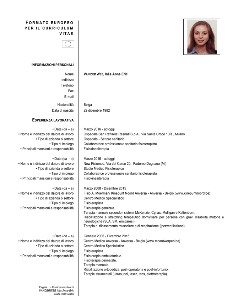 FORMATO EUROPEO PER IL CURRICULUM VITAE INFORMAZIONI PERSONALI Nome VAN DER WEE, Inès Anne Eric Indirizzo - Telefono +39 3928478653 Fax E-mail Nazionalità Data di nascita nesje_vdwee [email protected] Belga 22 dicembre 1982 ESPERIENZA LAVORATIVA • Date (da – a) • Nome e indirizzo del datore di lavoro • Tipo di azienda o settore • Tipo di impiego • Principali mansioni e responsabilità Marzo 2016 - ad oggi Ospedale San Raffaele Resnati S.p.A., Via Santa Croce 10/a , Milano Ospedale - Settore sanitario Collaboratrice professionale sanitario fisioterapista Fisiokinesiterapia • Date (da – a) • Nome e indirizzo del datore di lavoro • Tipo di azienda o settore • Tipo di impiego • Principali mansioni e responsabilità Marzo 2016 - ad oggi New Fisiomed, Via del Carso 20, Paderno Dugnano (Mi) Studio Medico Fisioterapico Collaboratrice professionale sanitario fisioterapista Fisiokinesiterapia • Date (da – a) • Nome e indirizzo del datore di lavoro • Tipo di azienda o settore • Tipo di impiego • Principali mansioni e responsabilità Marzo 2008 - Dicembre 2015 Fisio A. Moerman/ Kinepunt Noord Anversa - Anversa - Belgio (www.kinepuntnoord.be) Centro Medico Specialistico Fisioterapista Fisioterapia generale. generale Terapia manuale secondo i sistemi McKenzie, Cyriax,, Mulligan e Kaltenborn. Kaltenborn Riabilitazione e stretching terapeutico domiciliare per persone con gravi disabilità motorie e neurologiche (SLA, SM, emiparesi). emiparesi) Terapia di rilassamento muscolare e di respirazione (iperventilazione). • Date (da – a) • Nome e indirizzo del datore di lavoro • Tipo di azienda o settore • Tipo di impiego • Principali mansioni e responsabilità Gennaio 2006 - Dicembre 2015 Centro Medico Anversa - Anversa - Belgio (www.mcantwerpen.be www.mcantwerpen.be) Centro Medico Specialistico Fisioterapista Fisioterapia ambulatoriale. ambulatoriale Fisioterapia perinatale. perinatale Terapia manuale. manuale Riabilitazione ortopedica, post-operatoria post e post-infortunio. Terapie strumentali (ultrasuoni, laser, tens, elettroterapia). elettroterapia) Pagina 1 - Curriculum vitae di VANDERWEE Inès Anne Eric Data 30/03/2016 • Date (da – a) • Nome e indirizzo del datore di lavoro • Tipo di azienda o settore • Tipo di impiego • Principali mansioni e responsabilità Febbraio 2013 - Gennaio 2015 Centro di Riabilitazione Leenaerts - Deurne - Belgio Centro Medico privato specializzato in riabilitazione, rilassamento e respirazione (iperventilazione) Fisioterapista Riabilitazione ortopedica. Tecniche di respirazione. • Date (da – a) • Nome e indirizzo del datore di lavoro • Tipo di azienda o settore • Tipo di impiego • Principali mansioni e responsabilità Settembre 2011 - Aprile 2013 Centro privato di Fisioterapia Hertsens - Berchem - Belgio Centro Medico di Fisioterapia Fisioterapista Fisioterapia perinatale. Terapia manuale. • Date (da – a) • Nome e indirizzo del datore di lavoro • Tipo di azienda o settore • Tipo di impiego • Principali mansioni e responsabilità Luglio 2011 - Gennaio 2012 Centro di Fisioterapia Wildebrand Hoogerheide - Bergen-Op-Zoom - Paesi Bassi Centro Medico di Fisioterapia Fisioterapista Terapia dello sport e Fitness coach. Fisioterapia generale. Terapia manuale. • Date (da – a) • Nome e indirizzo del datore di lavoro • Tipo di azienda o settore • Tipo di impiego • Principali mansioni e responsabilità Gennaio 2006 - Febbraio 2008 Centro Privato di Fisioterapia Vermeulen - Borsbeek - Belgio Centro Medico di Fisioterapia Fisioterapista Drenaggio linfatico manuale (metodo Leduc). Fisioterapia generale. Riabilitazione perineale. • Date (da – a) • Nome e indirizzo del datore di lavoro • Tipo di azienda o settore • Tipo di impiego • Principali mansioni e responsabilità 2005 Ospedale Universitario Anversa UZA - Edegem - Belgio Ospedale pubblico Stage di specializzazione universitaria Reparto di Cardiologia - riabilitazione cardiaca e post-operatoria • Date (da – a) • Nome e indirizzo del datore di lavoro 2004 Universita di Castilla la Mancha Ospedale Virgen de la Salud - Toledo - Spagna Ospedale Paraplegicos - Toledo - Spagna Università - Facoltà di Medicina Ospedale pubblico Stage di specializzazione universitaria Riabilitazione ambulatoriale. Riabilitazione di para- e tetraplegici. • Tipo di azienda o settore • Tipo di impiego • Principali mansioni e responsabilità • Date (da – a) • Nome e indirizzo del datore di lavoro • Tipo di azienda o settore • Tipo di impiego • Principali mansioni e responsabilità Pagina 2 - Curriculum vitae di VANDERWEE Inès Anne Eric Data 30/03/2016 2003 - 2004 Ospedale AZ Middelheim - Berchem - Belgio Ospedale Sint-Augustinus - Wilrijk - Belgio Ospedale AZ Jan Palfijn - Merksem - Belgio Ospedali Stage di specializzazione universitaria Fisioterapia postnatale. Reparto di Ortopedia – riabilitazione per protesi anca e ginocchio e rieducazione motoria. Reparto di Neurologia – terapie di riabilitazione neuromuscolare con metodo Bobath e tecniche di stretching PNF per persone con disfunzioni neurologiche. • Date (da – a) • Nome e indirizzo del datore di lavoro • Tipo di azienda o settore • Tipo di impiego • Principali mansioni e responsabilità 2002 - 2003 Ospedale Dodoens - Mechelen - Belgio Instituto Sint-Jozef - Anversa - Belgio Ospedali Stage di specializzazione universitaria Assistenza alla rieducazione di bambini con disfunzioni motorie. ISTRUZIONE E FORMAZIONE • Date (da – a) • Nome e tipo di istituto di istruzione o formazione • Principali materie / abilità professionali oggetto dello studio • Qualifica conseguita • Livello nella classificazione nazionale (se pertinente) 2014 - 2015 Flemish International College of Osteopathy Fico - Deurne - Belgio • Date (da – a) • Nome e tipo di istituto di istruzione o formazione • Principali materie / abilità professionali oggetto dello studio • Qualif