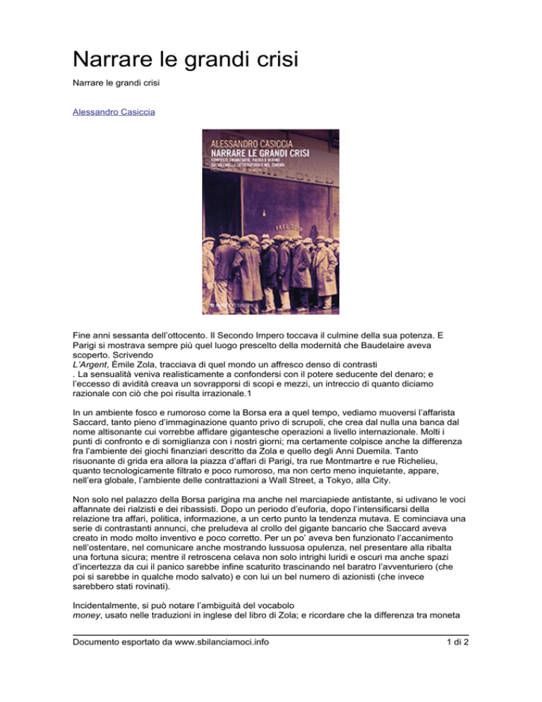 Narrare le grandi crisi Narrare le grandi crisi Alessandro Casiccia Fine anni sessanta dell’ottocento. Il Secondo Impero toccava il culmine della sua potenza. E Parigi si mostrava sempre più quel luogo prescelto della modernità che Baudelaire aveva scoperto. Scrivendo L’Argent, Émile Zola, tracciava di quel mondo un affresco denso di contrasti . La sensualità veniva realisticamente a confondersi con il potere seducente del denaro; e l’eccesso di avidità creava un sovrapporsi di scopi e mezzi, un intreccio di quanto diciamo razionale con ciò che poi risulta irrazionale.1 In un ambiente fosco e rumoroso come la Borsa era a quel tempo, vediamo muoversi l’affarista Saccard, tanto pieno d’immaginazione quanto privo di scrupoli, che crea dal nulla una banca dal nome altisonante cui vorrebbe affidare gigantesche operazioni a livello internazionale. Molti i punti di confronto e di somiglianza con i nostri giorni; ma certamente colpisce anche la differenza fra l’ambiente dei giochi finanziari descritto da Zola e quello degli Anni Duemila. Tanto risuonante di grida era allora la piazza d’affari di Parigi, tra rue Montmartre e rue Richelieu, quanto tecnologicamente filtrato e poco rumoroso, ma non certo meno inquietante, appare, nell’era globale, l’ambiente delle contrattazioni a Wall Street, a Tokyo, alla City. Non solo nel palazzo della Borsa parigina ma anche nel marciapiede antistante, si udivano le voci affannate dei rialzisti e dei ribassisti. Dopo un periodo d’euforia, dopo l’intensificarsi della relazione tra affari, politica, informazione, a un certo punto la tendenza mutava. E cominciava una serie di contrastanti annunci, che preludeva al crollo del gigante bancario che Saccard aveva creato in modo molto inventivo e poco corretto. Per un po’ aveva ben funzionato l’accanimento nell’ostentare, nel comunicare anche mostrando lussuosa opulenza, nel presentare alla ribalta una fortuna sicura; mentre il retroscena celava non solo intrighi luridi e oscuri ma anche spazi d’incertezza da cui il panico sarebbe infine scaturito trascinando nel baratro l’avventuriero (che poi si sarebbe in qualche modo salvato) e con lui un bel numero di azionisti (che invece sarebbero stati rovinati). Incidentalmente, si può notare l’ambiguità del vocabolo money, usato nelle traduzioni in inglese del libro di Zola; e ricordare che la differenza tra moneta Documento esportato da www.sbilanciamoci.info 1 di 2 e denaro diviene oggi ancor più acuta grazie alle versioni digitali del “mezzo di scambio universale”.2 La Parigi di allora stava per illuminarsi con le luci dell’Esposizione. Lo spettacolo della civiltà capitalistica raggiungeva il suo massimo splendore. Dopo qualche anno però la città sarebbe stata travolta da eventi tremendi. Come la sconfitta di Napoleone III. E come la breve, tragica vicenda della Comune. In altre opere di Zola notiamo l’impressione che in lui avevano suscitato i crudi eventi della Comune, inducendolo, da un lato a provare solidarietà con chi insorgeva contro il dominio altoborghese, d’altro lato a scorgere nel proletario in rivolta un tipo umano umiliato dallo sfruttamento, degradato dagli stenti, minato dai danni dell’alcolismo, ma anche predisposto a momentanee esplosioni di barbara violenza. In questa seconda rap- presentazione, che emerge in talune pagine di Germinal (dove lo sguardo è turbato ma anche affascinato) , vediamo trasparire qualche traccia dell’influenza esercitata su Zola dal poi criticato maestro Hippolyte Taine.3 Nella gigantesca opera di Taine, le masse rivoluzionarie, emerse dall’o- scurità in successivi momenti storici, erano state presentate come paurosi branchi di belve feroci. E in quella visione ansiosa e sprezzante veniva in qualche modo anticipata, come vedremo in seguito, una serie di studi e di scritti come quelli di Gabriel Tarde e di Gustave Le Bon, dedicati tra otto e novecento alla psicologia collettiva.4 Dove l’entusiasmo così come la paura e il panico apparivano quali emozioni contagiose; stati d’animo che si diffondono; sentimenti collettivamente provati e al tempo stesso provocati.5 (Sappiamo peraltro che analoghe emozioni potevano segnare anche meccanismi psicologici collettivi di diversa natura: come l’euforia dei mercati, il diffondersi di allarme, gli inquieti movimenti del capitale e delle borse.) 1 E. Zola, Il denaro ( l’Argent 1891), intr. A. Lolini, trad. L. Collodi, Roma, Newton & Compton 1996. 2 In proposito, v.: M.G. Turri, La distinzione fra moneta e denaro, Roma, Carocci 2009, introd. M. Ferraris. Il concreto e l’astratto nelle due nozioni (sia per l’abolizione della convertibilità, sia soprattutto oggi, per la virtualità indotta dalle nuove tecnologie) emergono pienamente. 3 E. Zola, Germinal (1885), Milano, RCS 1997; H.Taine, Les Origines de la France contemporaine (1875-1893) trad. it. La rivoluzione, I, l’anarchia, Milano, Treves 1921. Vedi: D. Palano, Volti della paura: Figure del disordine all’alba dell’era bio-politica, Milano-Udine, Mimesis Edizioni 2010. Questo interessante saggio, sulla rappresentazione delle folle ci ricorda come Zola, allievo di Taine prima di allontanarsene politicamente, non fosse riuscito a ripudiare del tutto l’interpretazione psico-patologica delle rivoluzioni, poi sviluppata a modo loro anche da Sighele e da Le Bon. Alessandro Casiccia, Narrare la grande crisi. Tempeste finanziarie, paure e rovine sociali nella letteratura e nel cinema, Mimesis, 2015 Sì Documento esportato da www.sbilanciamoci.info 2 di 2