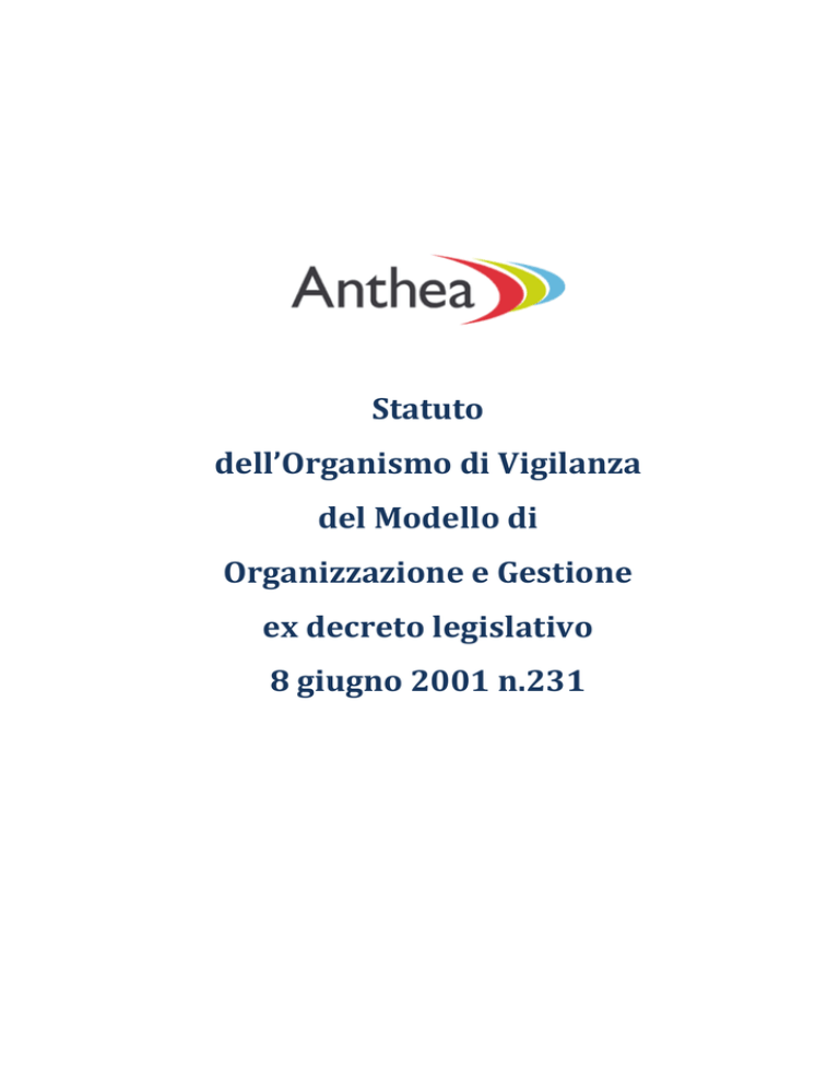 Statuto dell’Organismo di Vigilanza del Modello di Organizzazione e Gestione ex decreto legislativo 8 giugno 2001 n.231 ANTHEA Statuto Organismo di Vigilanza ANTHEA S.R.L. Statuto dell’Organismo di Vigilanza del Modello di Organizzazione e di Gestione ex decreto legislativo 8 giugno 2001 n.231 Natura del documento: Edizione definitiva Approvazione: Consiglio d’Amministrazione 02 agosto 2012 Revisione: 1.4 Rimini, 2 agosto 2012 1 ANTHEA Statuto Organismo di Vigilanza Sommario Articolo 1 - SCOPO E AMBITO DI APPLICAZIONE ......................................................................................... 3 Articolo 2 - NOMINA E COMPOSIZIONE ............................................................................................................ 3 Articolo 3 - DURATA IN CARICA E SOSTITUZIONE DEI MEMBRI ........................................................... 4 Articolo 4 - CONVOCAZIONE, VOTO E DELIBERE ......................................................................................... 4 Articolo 5 - OBBLIGHI DI RISERVATEZZA ........................................................................................................ 5 Articolo 6 - FUNZIONI E POTERI .......................................................................................................................... 6 Articolo 7- ESTENSIONE AMBITO DI ATTIVITA’ DELL’ORGANISMO DI VIGILANZA ...................... 8 Articolo 8 - MODIFICHE DEL STATUTO ............................................................................................................ 8 2 ANTHEA Statuto Organismo di Vigilanza Articolo 1 - SCOPO E AMBITO DI APPLICAZIONE 1.1. È istituito presso ANTHEA S.R.L. (di seguito “Società”) un organo con funzioni di vigilanza e controllo (di seguito “Organismo”) in ordine al funzionamento, all’efficacia e all’osservanza del Modello di organizzazione e gestione (di seguito “il Modello”) adottato dalla Società allo scopo di prevenire i reati dai quali possa derivare la responsabilità amministrativa della stessa, in applicazione delle disposizioni di cui al D.Lgs. 8 giugno 2001, n. 231 (di seguito anche “Decreto”), dal titolo “Disciplina della responsabilità amministrativa delle persone giuridiche, delle società e delle associazioni anche prive di personalità giuridica”. 1.2. Il presente statuto è predisposto dalla Società al fine di disciplinare il funzionamento dell’Organismo, individuando, in particolare, poteri, compiti e responsabilità allo stesso attribuiti. 1.3. Nell’esercizio delle sue funzioni, l’Organismo deve improntarsi a principi di autonomia ed indipendenza. 1.4. A garanzia del principio di terzietà, l’Organismo è collocato in posizione gerarchica di vertice della Società, riportando e rispondendo direttamente al Consiglio di Amministrazione. Articolo 2 - NOMINA E COMPOSIZIONE 2.1. L’Organismo è un organo collegiale composto da tre membri, dei quali uno con funzioni di Presidente scelto a maggioranza dall’Organismo medesimo. I membri dell’Organismo possono essere supportati da consulenti esterni per la cura di attività, richieste dal Modello per la funzione di Organismo di Vigilanza, che necessitano di specializzazioni non presenti all’interno della Società. 2.2. Il Consiglio di Amministrazione della Società provvede alla nomina ed alla revoca dei membri dell’Organismo mediante delibera consigliare. 2.3. I membri dell’Organismo sono scelti tra soggetti qualificati ed esperti negli ambiti gestionali necessari a svolgere efficacemente l’attività assegnata, dotati di adeguata professionalità nelle anzidette materie ed in possesso dei requisiti di professionalità, indipendenza, autonomia e di continuità d’azione previsti dal D. Lgs. 231/2001. 2.4. I membri dell’Organismo possono essere nominati sia tra soggetti esterni sia tra soggetti interni alla Società. I membri dell’Organismo non sono soggetti, in tale qualità e nell’ambito dello svolgimento della propria funzione, al potere gerarchico e disciplinare di alcun organo o funzione societaria. 3 ANTHEA Statuto Organismo di Vigilanza 2.5. L’Organismo avrà a propria disposizione una dotazione di risorse finanziarie, proposta dall'Organismo stesso, della quale l'Organismo potrà disporre per ogni esigenza necessaria al corretto svolgimento delle sue funzioni. Articolo 3 - DURATA IN CARICA E SOSTITUZIONE DEI MEMBRI 3.1. La durata in carica dei componenti l’Organismo è equiparata a quella del Consiglio di Amministrazione, organo sociale cui è imputata la responsabilità di adottare il Modello. 3.2. Il Consiglio di Amministrazione della Società può revocare in ogni momento i membri dell’Organismo. 3.3. La mancata partecipazione a due o più riunioni anche non consecutive senza giustificato motivo nell’arco di dodici mesi consecutivi, così come il venire meno dei requisiti di cui al precedente articolo 2.3, comporta la decadenza automatica del membro dell’Organismo dall’ufficio. 3.4. In caso di rinuncia, sopravvenuta incapacità, morte, revoca o decadenza di un membro dell’Organismo, quest’ultimo ne darà comunicazione tempestiva al Consiglio di Amministrazione il quale provvederà senza indugio alla sua sostituzione. E’ fatto obbligo al Presidente ovvero al membro più anziano di comunicare tempestivamente al Consiglio di Amministrazione il verificarsi di una delle ipotesi dalle quali derivi la necessità di sostituire un membro dell’Organismo. 3.5. In caso di rinuncia, sopravvenuta incapacità, morte, revoca o decadenza del Presidente, subentra a questi il membro più anziano, il quale rimane in tale carica fino alla data in cui il Consiglio di Amministrazione abbia deliberato la nomina del nuovo Presidente dell’Organismo. Articolo 4 - CONVOCAZIONE, VOTO E DELIBERE 4.1. L’Organismo si riunisce ogni volta che sia ritenuto opportuno dal Presidente, ovvero ne faccia richiesta scritta al Presidente almeno un membro. E’ fatto, in ogni caso,