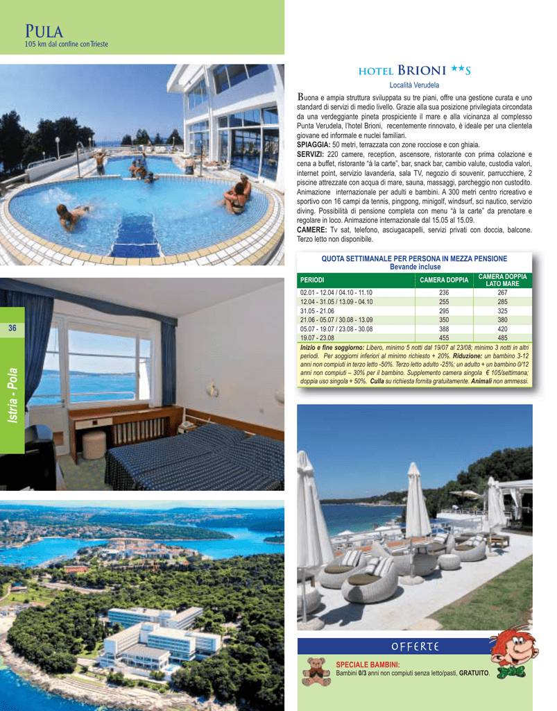 Pula 105 km dal confine con Trieste hotel Brioni ★★S Località Verudela Buona e ampia struttura sviluppata su tre piani, offre una gestione curata e uno standard di servizi di medio livello. Grazie alla sua posizione privilegiata circondata da una verdeggiante pineta prospiciente il mare e alla vicinanza al complesso Punta Verudela, l’hotel Brioni, recentemente rinnovato, è ideale per una clientela giovane ed informale e nuclei familiari. SPIAGGIA: 50 metri, terrazzata con zone rocciose e con ghiaia. SERVIZI: 220 camere, reception, ascensore, ristorante con prima colazione e cena a buffet, ristorante “à la carte”, bar, snack bar, cambio valute, custodia valori, internet point, servizio lavanderia, sala TV, negozio di souvenir, parrucchiere, 2 piscine attrezzate con acqua di mare, sauna, massaggi, parcheggio non custodito. Animazione internazionale per adulti e bambini. A 300 metri centro ricreativo e sportivo con 16 campi da tennis, pingpong, minigolf, windsurf, sci nautico, servizio diving. Possibilità di pensione completa con menu “à la carte” da prenotare e regolare in loco. Animazione internazionale dal 15.05 al 15.09. CAMERE: Tv sat, telefono, asciugacapelli, servizi privati con doccia, balcone. Terzo letto non disponibile. QUOTA SETTIMANALE PER PERSONA IN MEZZA PENSIONE Bevande incluse CAMERA DOPPIA LATO MARE 02.01 - 12.04 / 04.10 - 11.10 236 267 12.04 - 31.05 / 13.09 - 04.10 255 285 31.05 - 21.06 295 325 21.06 - 05.07 / 30.08 - 13.09 350 380 05.07 - 19.07 / 23.08 - 30.08 388 420 19.07 - 23.08 455 485 Inizio e fine soggiorno: Libero, minimo 5 notti dal 19/07 al 23/08; minimo 3 notti in altri periodi. Per soggiorni inferiori al minimo richiesto + 20%. Riduzione: un bambino 3-12 anni non compiuti in terzo letto -50%. Terzo letto adulto -25%; un adulto + un bambino 0/12 anni non compiuti – 30% per il bambino. Supplemento camera singola € 105/settimana; doppia uso singola + 50%. Culla su richiesta fornita gratuitamente. Animali non ammessi. PERIODI Istria - Pola 36 CAMERA DOPPIA OFFERTE SPECIALE BAMBINI: Bambini 0/3 anni non compiuti senza letto/pasti, GRATUITO.
