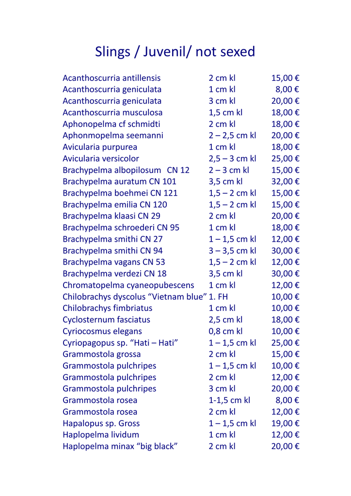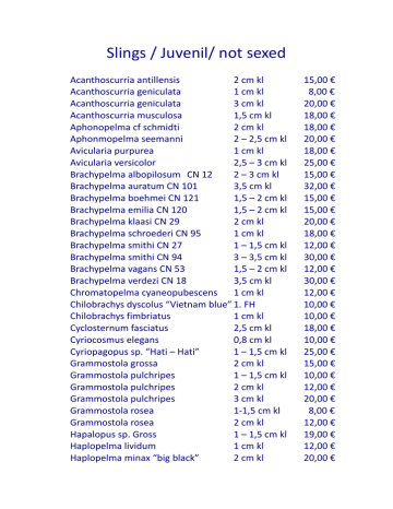 Slings / Juvenil/ not sexed Acanthoscurria antillensis 2 cm kl Acanthoscurria geniculata 1 cm kl Acanthoscurria geniculata 3 cm kl Acanthoscurria musculosa 1,5 cm kl Aphonopelma cf schmidti 2 cm kl Aphonmopelma seemanni 2 – 2,5 cm kl Avicularia purpurea 1 cm kl Avicularia versicolor 2,5 – 3 cm kl Brachypelma albopilosum CN 12 2 – 3 cm kl Brachypelma auratum CN 101 3,5 cm kl Brachypelma boehmei CN 121 1,5 – 2 cm kl Brachypelma emilia CN 120 1,5 – 2 cm kl Brachypelma klaasi CN 29 2 cm kl Brachypelma schroederi CN 95 1 cm kl Brachypelma smithi CN 27 1 – 1,5 cm kl Brachypelma smithi CN 94 3 – 3,5 cm kl Brachypelma vagans CN 53 1,5 – 2 cm kl Brachypelma verdezi CN 18 3,5 cm kl Chromatopelma cyaneopubescens 1 cm kl Chilobrachys dyscolus “Vietnam blue” 1. FH Chilobrachys fimbriatus 1 cm kl Cyclosternum fasciatus 2,5 cm kl Cyriocosmus elegans 0,8 cm kl Cyriopagopus sp. “Hati – Hati” 1 – 1,5 cm kl Grammostola grossa 2 cm kl Grammostola pulchripes 1 – 1,5 cm kl Grammostola pulchripes 2 cm kl Grammostola pulchripes 3 cm kl Grammostola rosea 1-1,5 cm kl Grammostola rosea 2 cm kl Hapalopus sp. Gross 1 – 1,5 cm kl Haplopelma lividum 1 cm kl Haplopelma minax “big black” 2 cm kl 15,00 € 8,00 € 20,00 € 18,00 € 18,00 € 20,00 € 18,00 € 25,00 € 15,00 € 32,00 € 15,00 € 15,00 € 20,00 € 18,00 € 12,00 € 30,00 € 12,00 € 30,00 € 12,00 € 10,00 € 10,00 € 18,00 € 10,00 € 25,00 € 15,00 € 10,00 € 12,00 € 20,00 € 8,00 € 12,00 € 19,00 € 12,00 € 20,00 € Heteroscodra maculata Holothele incei Holothele incei “gold” Lampropelma nigerrimum Lampropelma sp. Borneo black Lasiodora difficilis Lasiodora parahybana Lasiodorides polycuspulatus Megaphobema robustum Monocentropus balfouri Nhandu chromatus Nhandu chromatus Plesiopelma sp. Bolivien Poecilotheria miranda Poecilotheria ornata Poecilotheria vittata Poecilotheria regalis Poecilotheria smithi Poecilotheria tigrinawesseli Pseudohapalopus sp. "langhaarig" Pterinochilus murinus “rcf” Pterinochilus murinus “tcf” Pterinochilus murinus “umv” Pterinochilus murinus “umv” Tapinauchenius gigas 1 cm kl 1 cm kl 2 cm kl 2 cm kl 1 cm kl 2,5 – 3 cm kl 2,5 – 3 cm kl 2 – 2,5 cm kl 2,5 - 3 cm kl 2,5 – 3 cm kl 1 – 1,5 cm kl 2 cm kl 2 cm kl 2,5 – 3 cm kl 1,5 cm kl 3,5 – 4 cm kl 4 – 4,5 cm kl 2 cm kl 2 cm kl 2 – 2,5 cm kl 1,5 – 2 1 – 1,5 cm kl 1,5 cm kl 2,5 cm kl 1. FH 10,00 € 8,00 € 18,00 € 20,00 € 12,00 € 16,00 € 15,00 € 20,00 € 30,00 € 28,00 € 10,00 € 15,00 € 25,00 € 22,00 € 15,00 € 20,00 € 20,00 € 20,00 € 25,00 € 18,00 € 10,00 € 10,00 € 15,00 € 20,00 € 5,00 € Subadult / Adult / Female Avicularia aurantiaca Avicularia sp. Amazzonas purple Brachypelma albopilosum CN 30 Chilobrachys huahini Ceratogyrus marshalli Cyriocosmus ritae Grammostola porteri Grammostola rosea Grammostola rosea “rcf” Hapalopus sp. Gross Hysterocrates cf gigas Lasiodora parahybana Nhandu tripii (vulpinus) Psalmopoeus cambridgei Theraposa blondi 5 – 6 cm kl 5 – 6 cm kl 4 – 5 cm kl 6 cm kl 5 cm kl 2 – 3 cm kl 6 cm kl 4 cm kl 5 cm kl 2,5 cm kl 7 cm kl 9 cm kl 5 cm kl 6 cm kl 6 – 7 cm kl 50,00 € 50,00 € 25,00 € 45,00 € 45,00 € 50,00 € 30,00 € 23,00 € 32,00 € 28,00 € 40,00 € 60,00 € 50,00 € 40,00 € 200,00 € FAQ CN = Numero carico del registro cites per gli esemplari protetti FH = Fresshaut = muta (per esempio 3. FH = 3a muta) RH = Reifehäutung = muta finale del maschio adulto KL = Körperlänge = lunghezza del corpo (misurato senza zampe, filiere e cheliceri)
