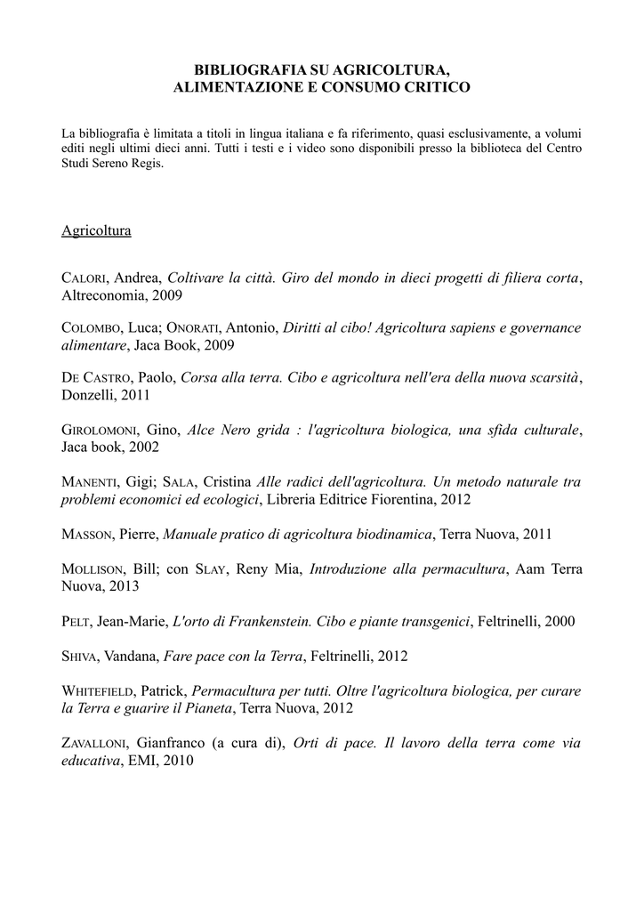 BIBLIOGRAFIA SU AGRICOLTURA, ALIMENTAZIONE E CONSUMO CRITICO La bibliografia è limitata a titoli in lingua italiana e fa riferimento, quasi esclusivamente, a volumi editi negli ultimi dieci anni. Tutti i testi e i video sono disponibili presso la biblioteca del Centro Studi Sereno Regis. Agricoltura CALORI, Andrea, Coltivare la città. Giro del mondo in dieci progetti di filiera corta, Altreconomia, 2009 COLOMBO, Luca; ONORATI, Antonio, Diritti al cibo! Agricoltura sapiens e governance alimentare, Jaca Book, 2009 DE CASTRO, Paolo, Corsa alla terra. Cibo e agricoltura nell'era della nuova scarsità, Donzelli, 2011 GIROLOMONI, Gino, Alce Nero grida : l'agricoltura biologica, una sfida culturale, Jaca book, 2002 MANENTI, Gigi; SALA, Cristina Alle radici dell'agricoltura. Un metodo naturale tra problemi economici ed ecologici, Libreria Editrice Fiorentina, 2012 MASSON, Pierre, Manuale pratico di agricoltura biodinamica, Terra Nuova, 2011 MOLLISON, Bill; con SLAY, Reny Mia, Introduzione alla permacultura, Aam Terra Nuova, 2013 PELT, Jean-Marie, L'orto di Frankenstein. Cibo e piante transgenici, Feltrinelli, 2000 SHIVA, Vandana, Fare pace con la Terra, Feltrinelli, 2012 WHITEFIELD, Patrick, Permacultura per tutti. Oltre l'agricoltura biologica, per curare la Terra e guarire il Pianeta, Terra Nuova, 2012 ZAVALLONI, Gianfranco (a cura di), Orti di pace. Il lavoro della terra come via educativa, EMI, 2010 Alimentazione e cibo AIELLO, Giuseppe, Il mistero (solubile) dello zucchero assassino. Una storia di cibo, dominio, denaro e scienza, Punctum, 2010 AMBROSINI, Fulvia; SEGRÈ, Andrea, Lo spreco utile: il libro del cibo solidale. Trasformare lo spreco in risorsa con i Last Minute Market: Food & Book, Pendragon, 2004 BIZZARRI, Paola; PELANDA, Davide, La fede nel piatto. Saperi e sapori del cibo dei poveri, Paoline, 2008 COLOMBO, Luca, Fame. Produzione di cibo e sovranità alimentare, Jaca Book, 2002 CONTI, Paolo C., La leggenda del buon cibo italiano, Fazi, 2006 FILIPPA, Marcella, Il cibo dell'altro. Movimenti migratori e culture alimentari nella Torino del Novecento, Edizioni Lavoro, 2003 HOLT-GIMÉNEZ, Eric (a cura di), Food movements unite! Strategie per trasformare i nostri sistemi alimentari, Slow Food, 2011 HOPKINS, Rob; PINKERTON, Tamzin, Cibo locale: come produrlo nella tua comunità. Manuale pratico per un'alimentazione sostenibile, Arianna, 2010 JAILLETTE, Jean-Claude, Il cibo impazzito. Il caso europeo della contraffazione alimentare, Feltrinelli, 2001 LAWRENCE, Felicity, Non è sull'etichetta. Quello che mangiamo senza saperlo, Einaudi, 2005 LLEDO, Pierre-Marie, Malati di cibo. Storia della mucca pazza, Raffaello Cortina, 2001 MASON, Jim; SINGER, Peter, Come mangiamo. Le conseguenze delle nostre scelte alimentari, Il Saggiatore, 2007 PATEL, Raj, I padroni del cibo, Feltrinelli, 2008 PETRINI, Carlo, Cibo e libertà. Slow Food: storie di gastronomia per la liberazione, Giunti, 2013 PLATANIA, Chiara, Labirinti di gusto. Dalla cucina degli dei all'Hamburger di McDonald, Dedalo, 2008 POLLAN, Michael, Il dilemma dell'onnivoro, Adelphi, 2008 POLLAN, Michael, In difesa del cibo, Adelphi, 2009 POLLAN, Michael, Breviario di resistenza alimentare. 64 regole per mangiare bene, Rizzoli, 2011 RAVASSO, Raffaella; TETTAMANTI, Massimo, Ecologia della nutrizione. Valutazione dell'impatto ambientale di diverse tipologie di alimentazione, ATRA, 2006 ROBERTS, Paul, La fine del cibo, Codice, 2009 SCHLOSSER, Eric, Fast Food Nation, Marco Tropea, 2002 SPADARO, Chiara, Il pane & la madre. Ricette e farina del nostro sacco per un pane buono, bio e sociale, Altreconomia, 2014 STUART, Tristam, Sprechi. Il cibo che buttiamo, che distruggiamo, che potremmo utilizzare, Bruno Mondadori, 2009 VALORI, Giancarlo Elia, Geopolitica del cibo. Una sfida per le grandi potenze, Rizzoli, 2013 Educazione al consumo e consumo critico BERNELLI, Michele; MARINI, Giancarlo, L'altra spesa. Consumare come il mercato non vorrebbe, Edizioni Ambiente, 2010 CIRRI, Massimo; SEGRÈ, Andrea, Dialogo sullo -Spr+Eco. Formule per non alimentare lo spreco, Corvino Meda, 2010 CORREGGIA, Marinella, La rivoluzione dei dettagli. Manuale di ecoazioni individuali e collettive, Feltrinelli, 2007 FRANCESCHINI, Alessandro, Riprendiamoci la terra! Piccolo manifesto per un consumo critico di terreno e territorio, Altreconomia, 2009 GALLICANI, Marco, Manuale del risparmiatore etico e solidale, Altreconomia, 2008 GESUALDI, Francesco, Sobrietà. Dallo spreco di pochi ai diritti per tutti, Feltrinelli, 2005 GESUALDI, Francesco, L'altra via. Dalla crescita al benvivere, programma per un'economia della sazietà, Altreconomia, 2009 MARTINELLI, Luca, Imbrocchiamola! Dalle minerali al rubinetto, piccola guida al consumo critico dell'acqua, Altreconomia, 2010 PEARCE, Fred, Confessioni di un eco-peccatore. Viaggio all'origine delle cose che compriamo, Edizioni Ambiente, 2010 PICCHIONI, Cinzia, Consigli contro gli acquisti. Consumare meno e vivere meglio con la semplicità volontaria, L'Età dell'Acquario, 2013 VALERA, Lorenzo, Gas, gruppi di acquisto Solidali, Terre di Mezzo, 2005 Filmografia minima DI DOMENICO, Daniele, Terramacchina, 2011, 72 minuti (documentario) FENOGLIO, Andrea; MOMETTI, Diego, La vita è un lavoro, 2010, 46 minuti (documentario) GEYRHALTER, Nikolaus, Our Daily Bread, 2005, 92 minuti (documentario) LINKLATER, Richard, Fast Food Nation, 2004, 100 minuti (finzione) OLMI, Ermanno, Terra Madre, 2009, 78 minuti (documentario) SAUPER, Hubert, L'incubo di Darwin, 2004, 107 minuti (documentario) Cd Rom AGEA, Sapere è salute. Prodotti biologici SAI COSA MANGI, Dalla fabbrica alla forchetta SLOW FOOD, Slow Learning. A World Report on Food and Taste Education Activites